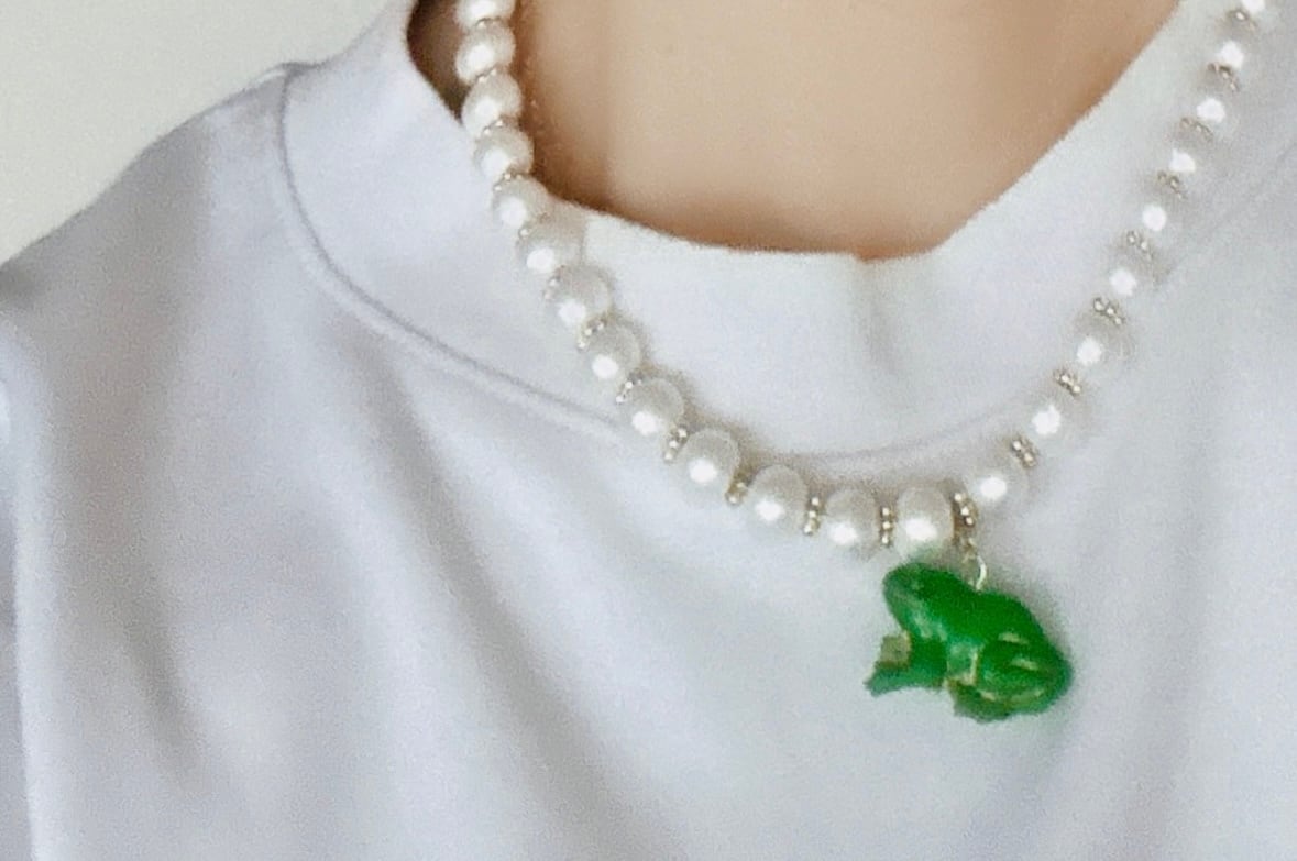 ご覧いただきありがとうございます。 コットンパールネックレスにインパクトあるカエルチャーム付けました ピアス、リングとお揃いになります! コットンパールとドイツ製アクリルチャーム、異素材の組み合わせをお楽しみ下さい! 長さ:約38㎝(プラス5㎝アジャスター付き) 素材:コットンパール(8㎜玉)、真鍮、ドイツ製チャーム、 ※ご不明な点がございましたらお気軽にお問い合わせくださいませ。お待ちしております。 *こちらの製品は受注後制作に入りますので、発送まで5日ほどお時間を頂戴致します。 予めご了承下さいませ。 【※ご購入の前にご一読ください】 ◆使用上の注意 *商品は一つ一つ、丁寧に作製しておりますが、ハンドメイドのため、既製品のような完璧さをお求めになる方、また気になる方はご購入をご遠慮下さいますようお願い致します。 *既製品のような強度はありませんので、お取り扱いの際には充分ご注意下さい。 *無理な力で引っ張るなどの衝撃を与えますと破損の原因になります。 *水気のある場所でのご使用はお控え下さい。 *持ち運び、着脱時など十分ご注意ください。また、入浴や運動、就寝時は外す事をおすすめいたします。 *メッキ加工を施した商品は、特性上変色を避ける事ができません。汗や雨などの水分や、油分、日焼け止めなどの化粧品、紫外線に長時間触れるなど、使用状況によってはメッキの劣化が早まる場合があります。 *肌、衣類、他のアクセサリーなどとの摩擦や傷はメッキ剥がれの原因になります。 *アレルギー対応ではありませんので、ご了承下さい。 *商品画像と色の違いが生じる場合があります。予めご了承下さい。 *返品交換はできません。気になる方はトラブル防止のため、ご購入をお控え下さいますようお願いいたします。 ◆お手入れ方法 ご使用後は変色防止のため、めがね拭きなどの柔らかい布で汚れを拭き取り、ジュエリーケースや密閉袋での保管をおすすめいたします。 *気になる点がございましたら些細な事でも結構ですのでお問い合わせお待ちしております。 instagramやっております。 お気軽にフォローしてください。 https:www.instagram.com/e_smile_po_oq 大ぶり クリスタル ビジュー キュート ゴージャス ボリューム ボリューミー 春 夏 秋 冬 お出かけ カジュアル フォーマル パーティー プチギフト バースデー バースデープレゼント クリスマス クリスマスギフト ホリデーシーズン クリスマスプレゼント ネックレス コットンパール カエル グリーン