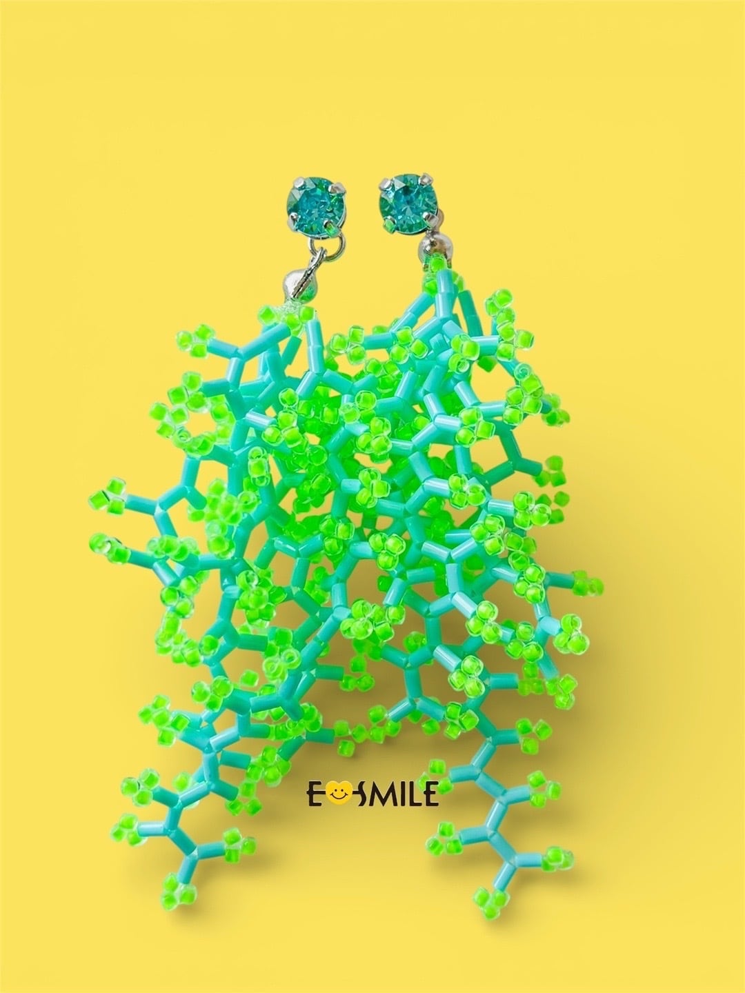 トップにはオーストリア産のクリスタルを1粒、ビーズ部分には、あかるめのネオングリーンとターコイズブルーを組み合わせて編みました。
