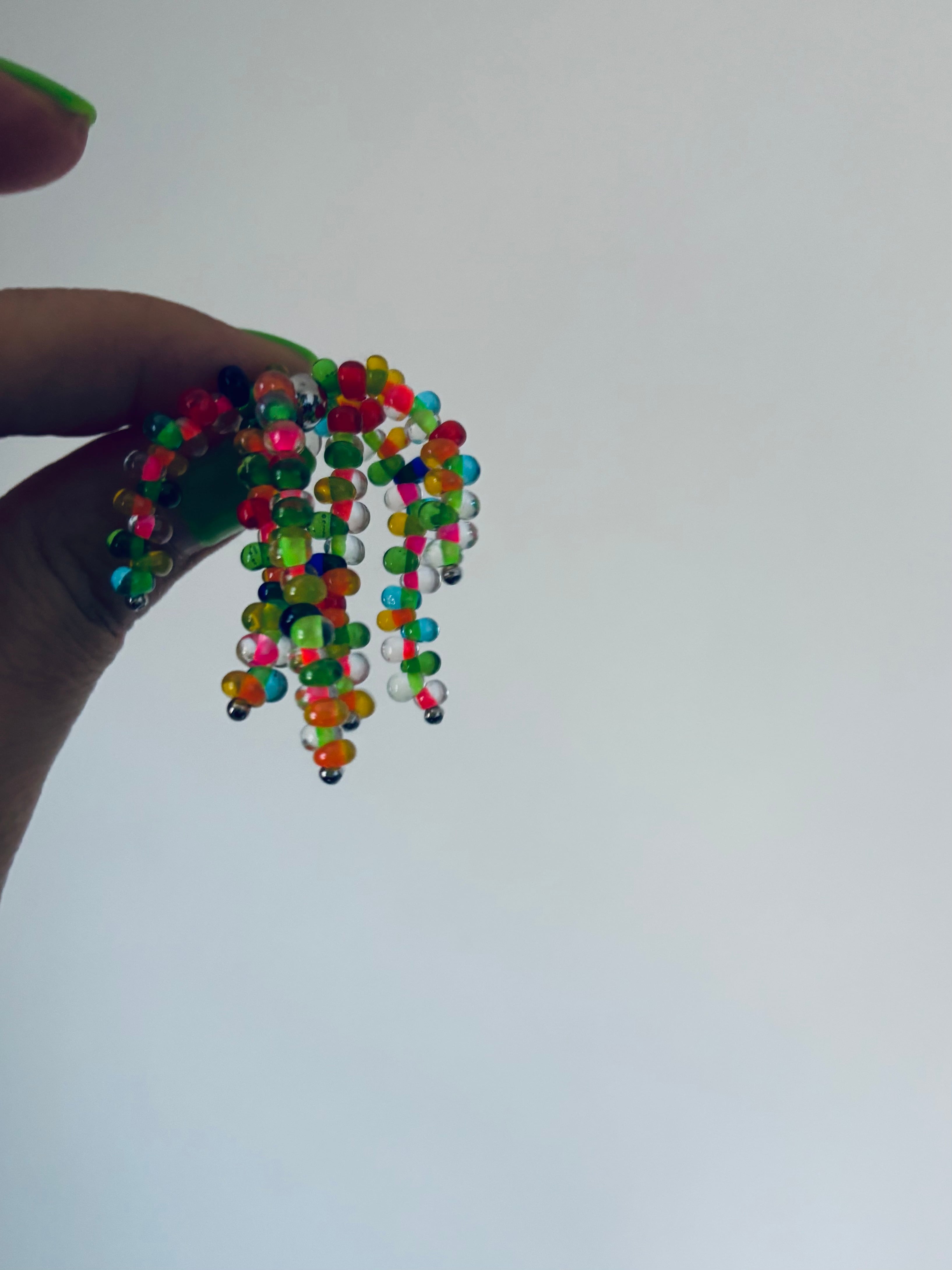 カラフルなまが玉ビーズを使用し、シャワーのように耳元で煌めきます