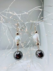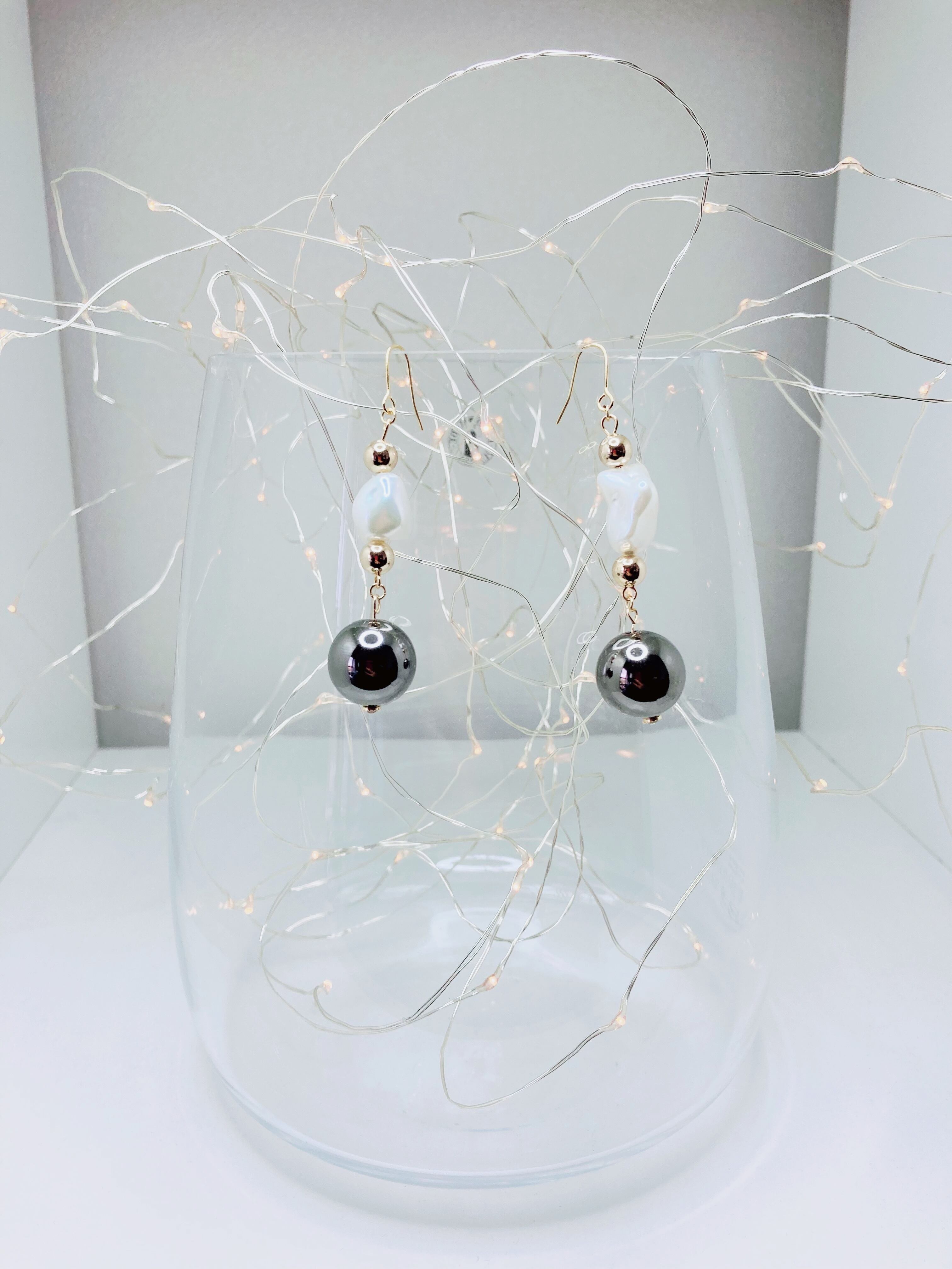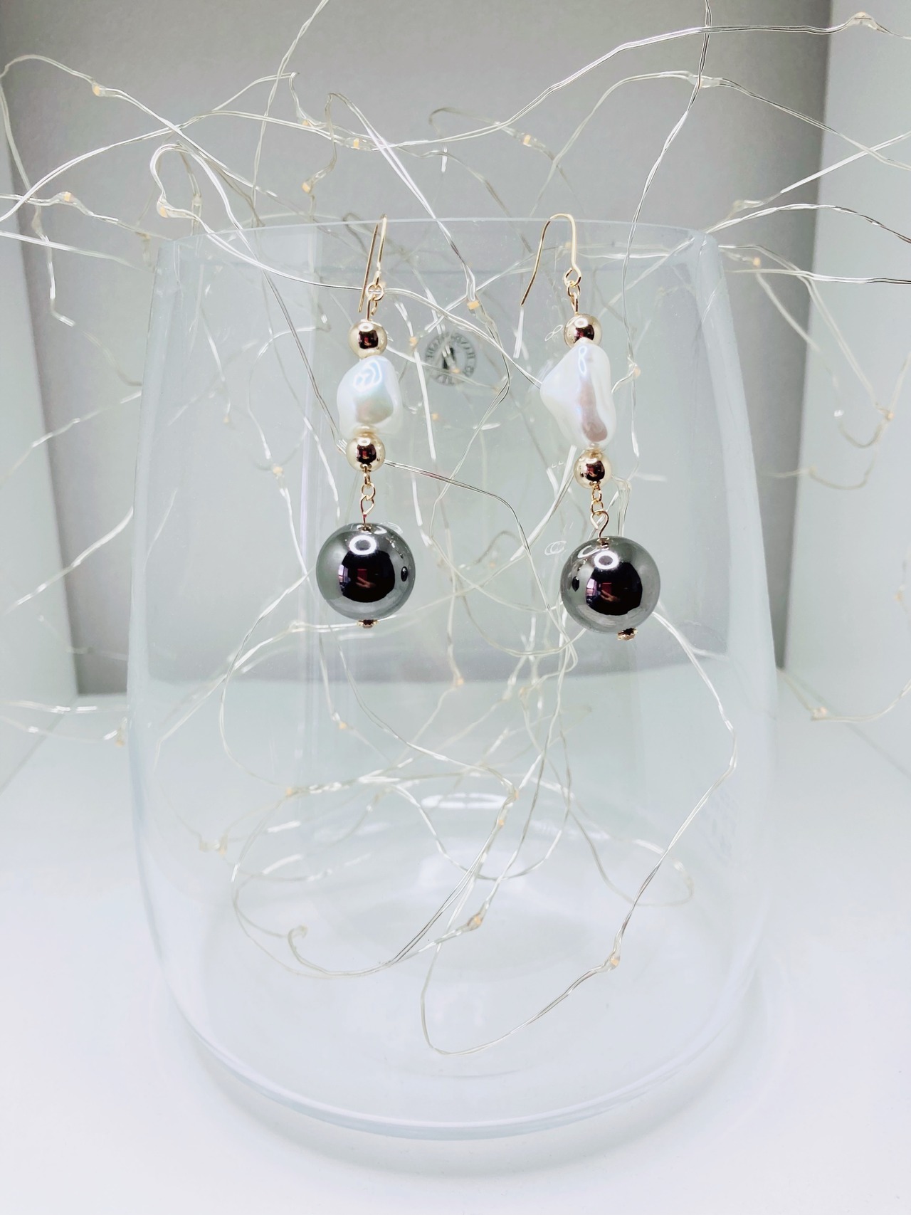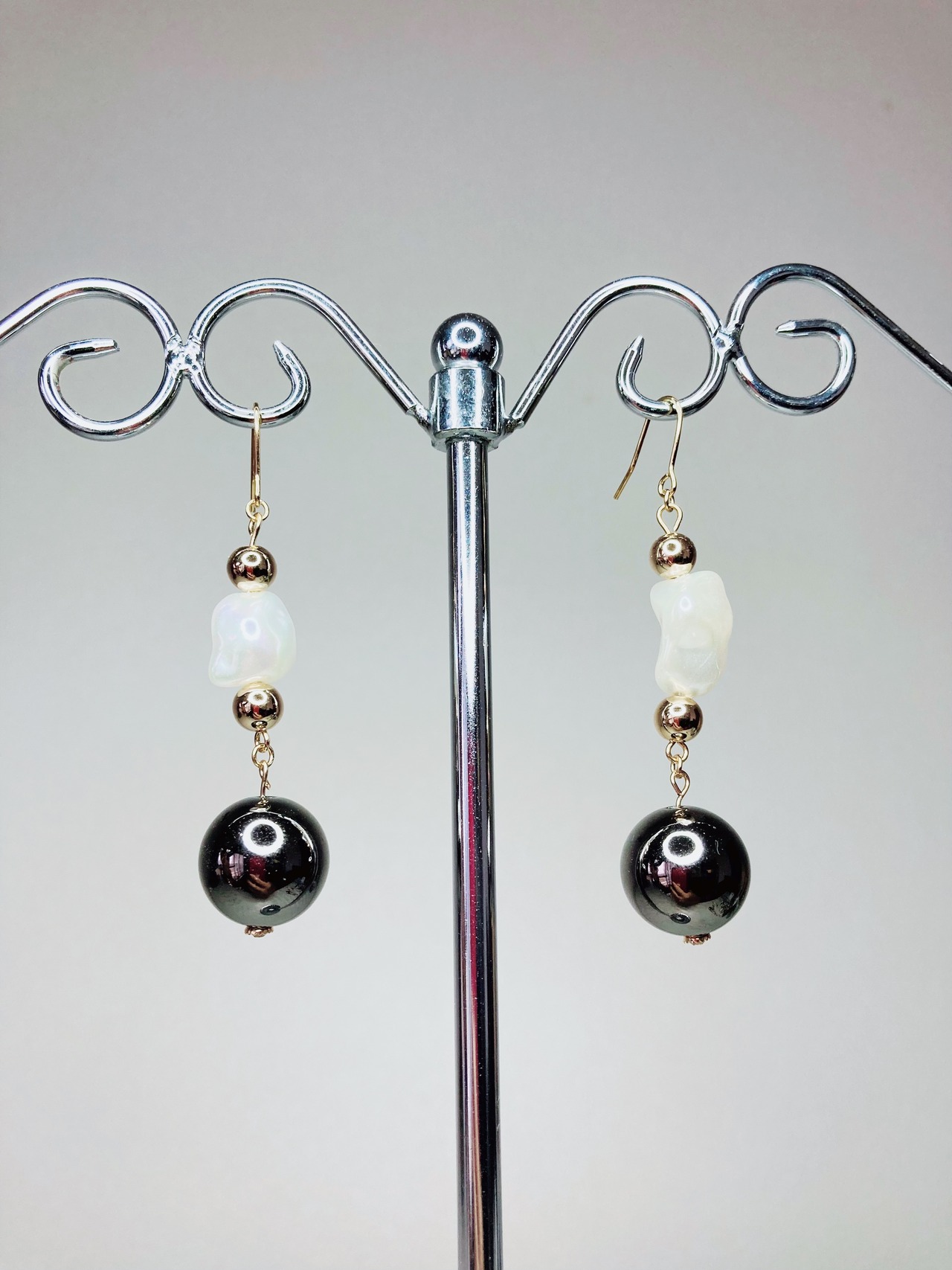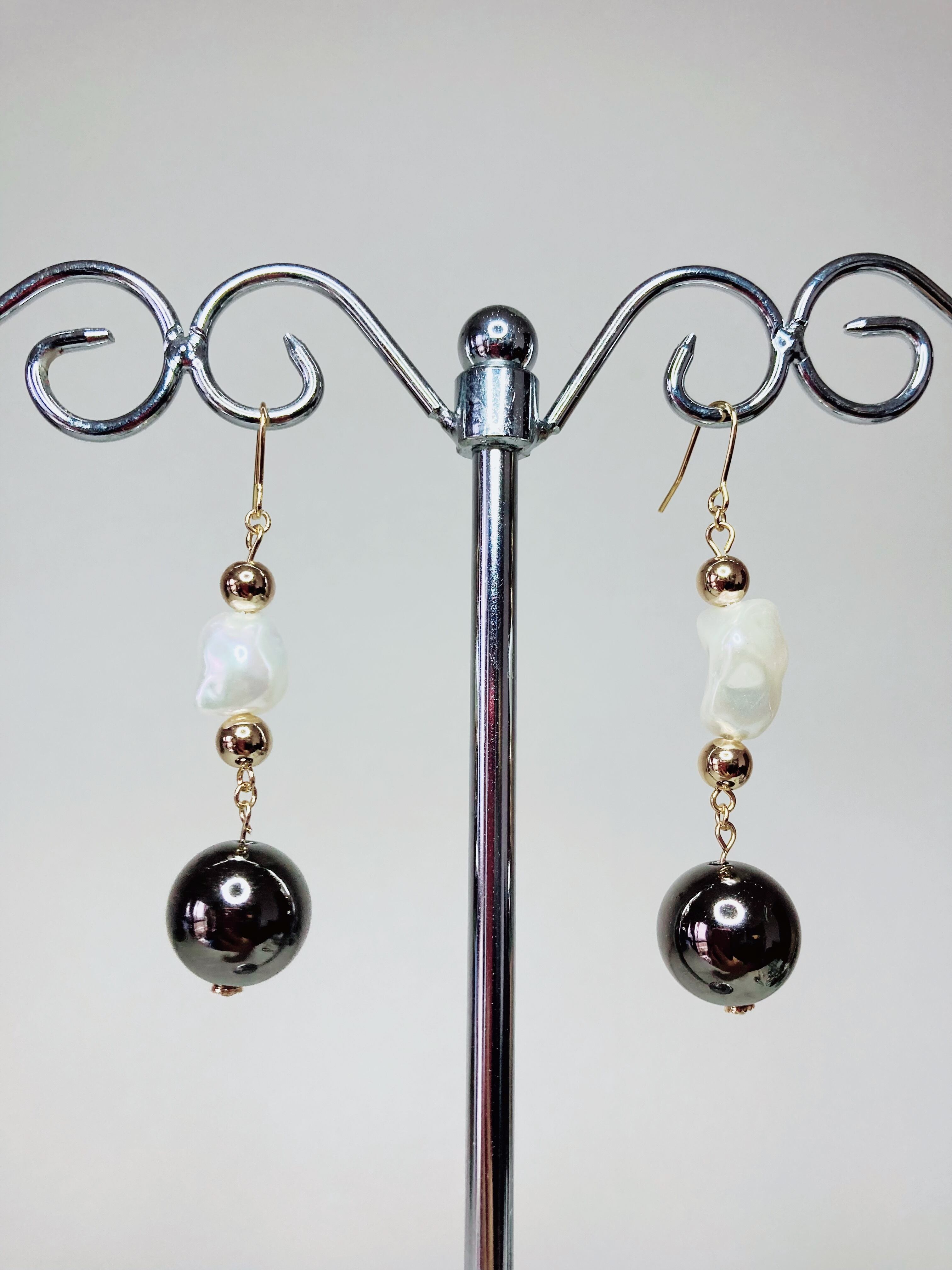 バロックビーンズのパールとブラックの銅玉を使ったピアスです。