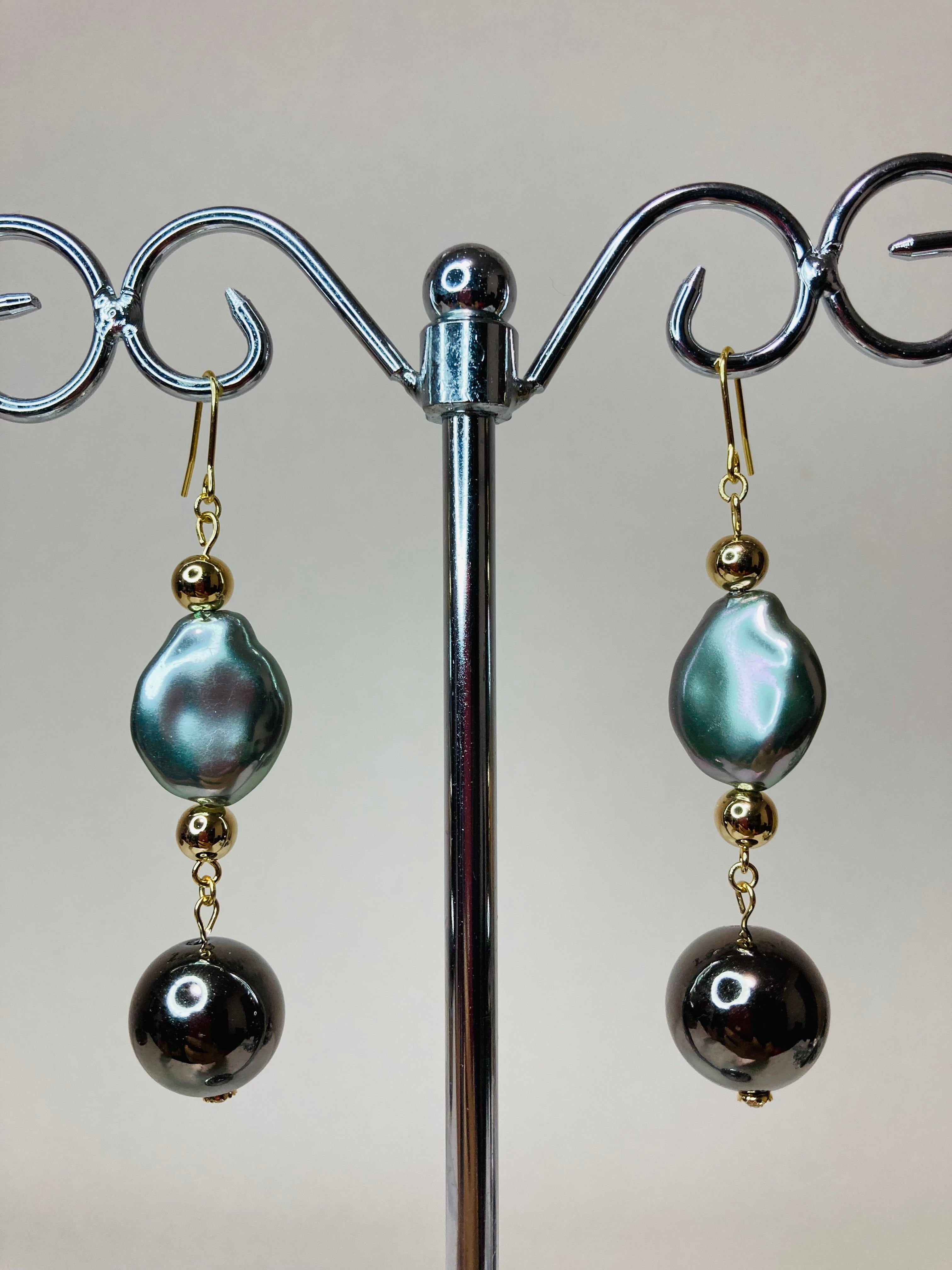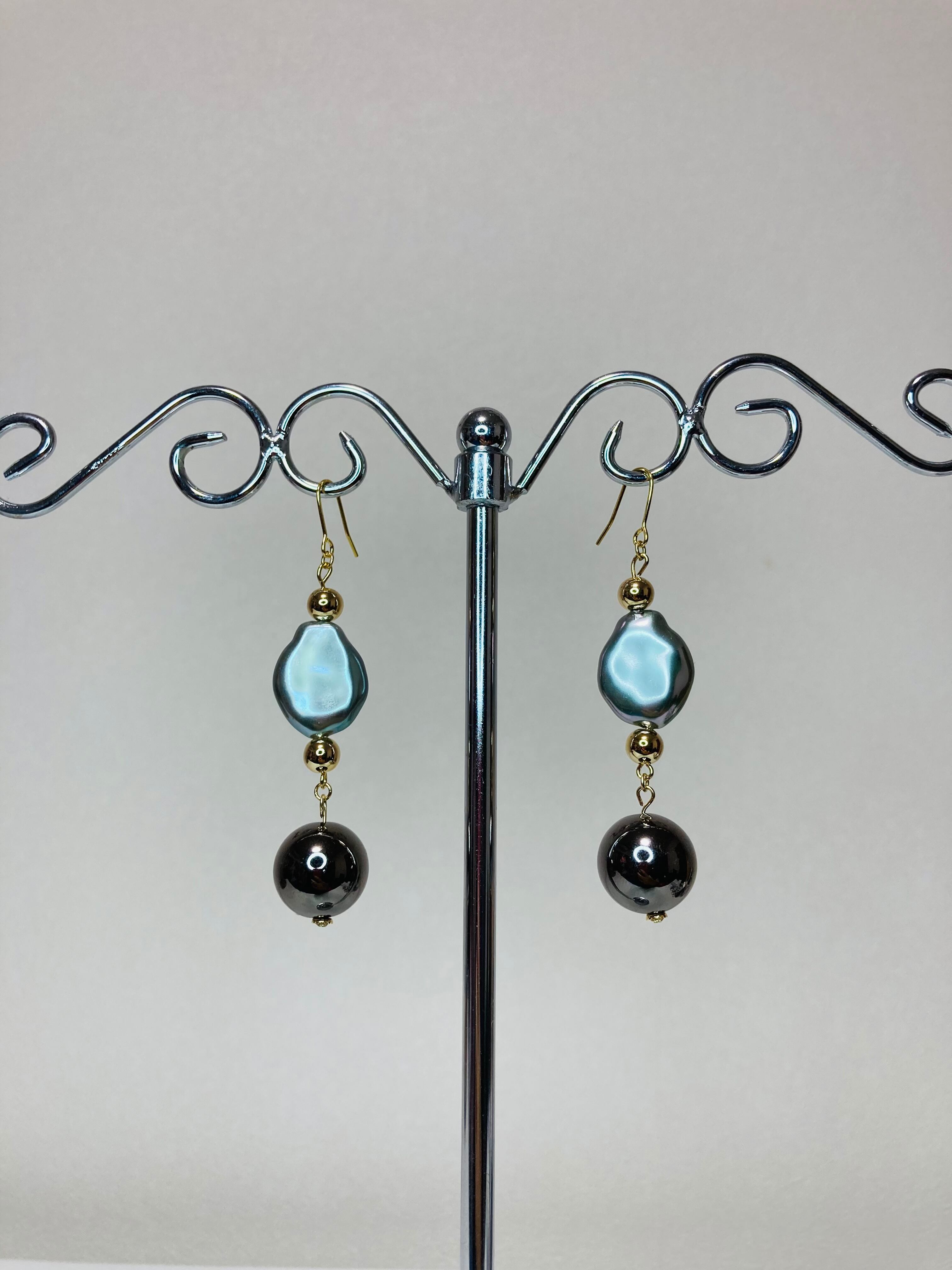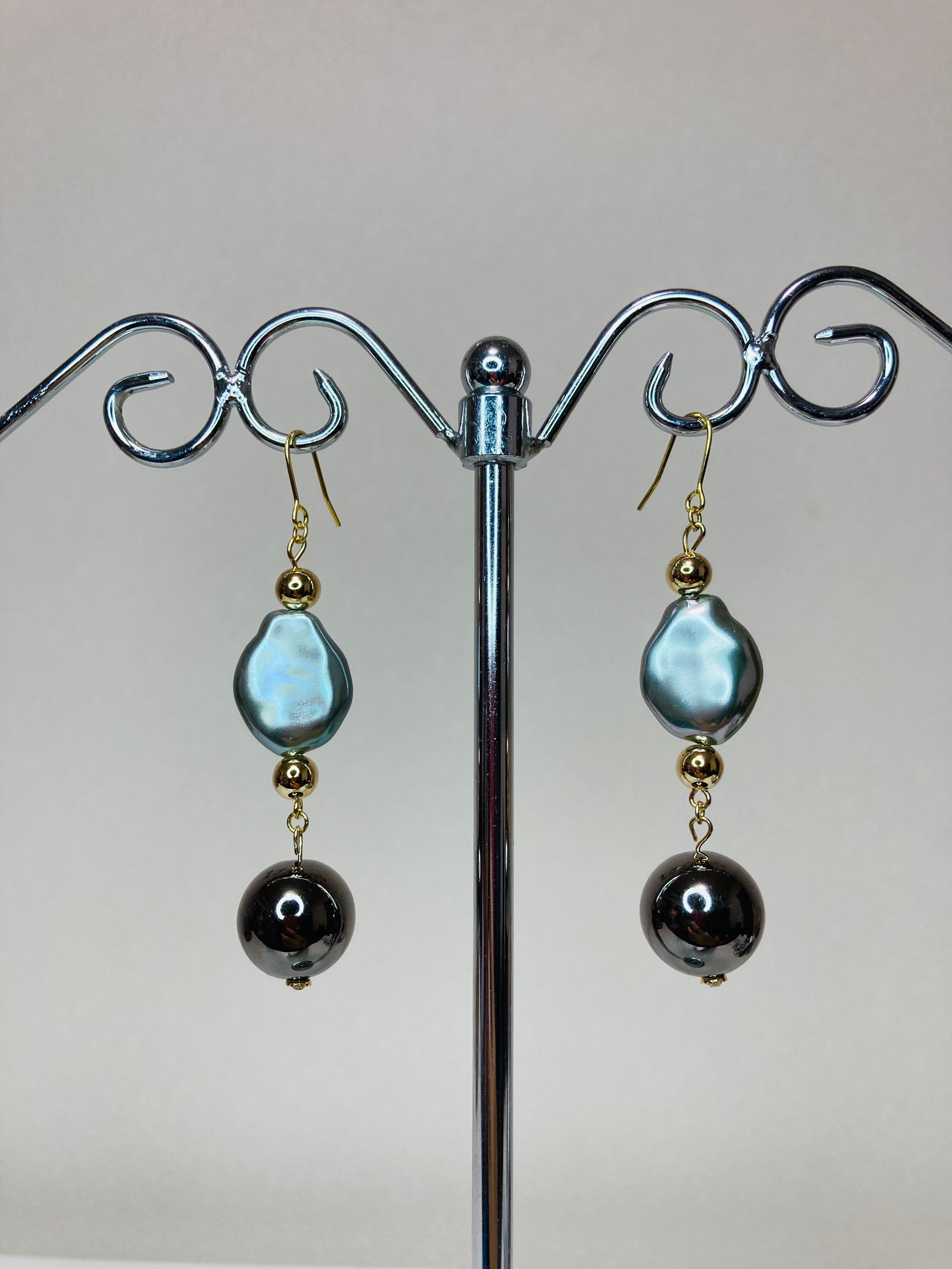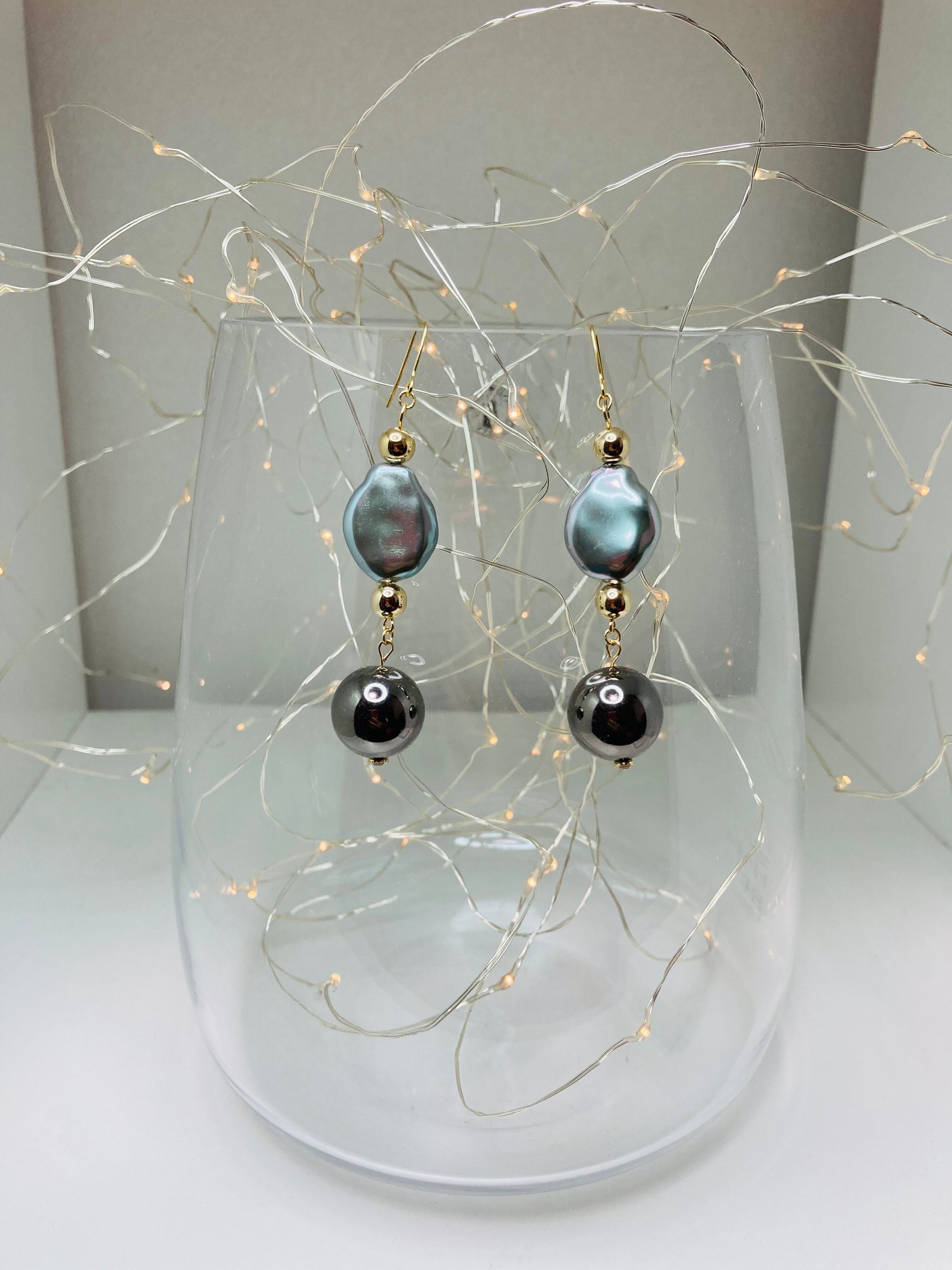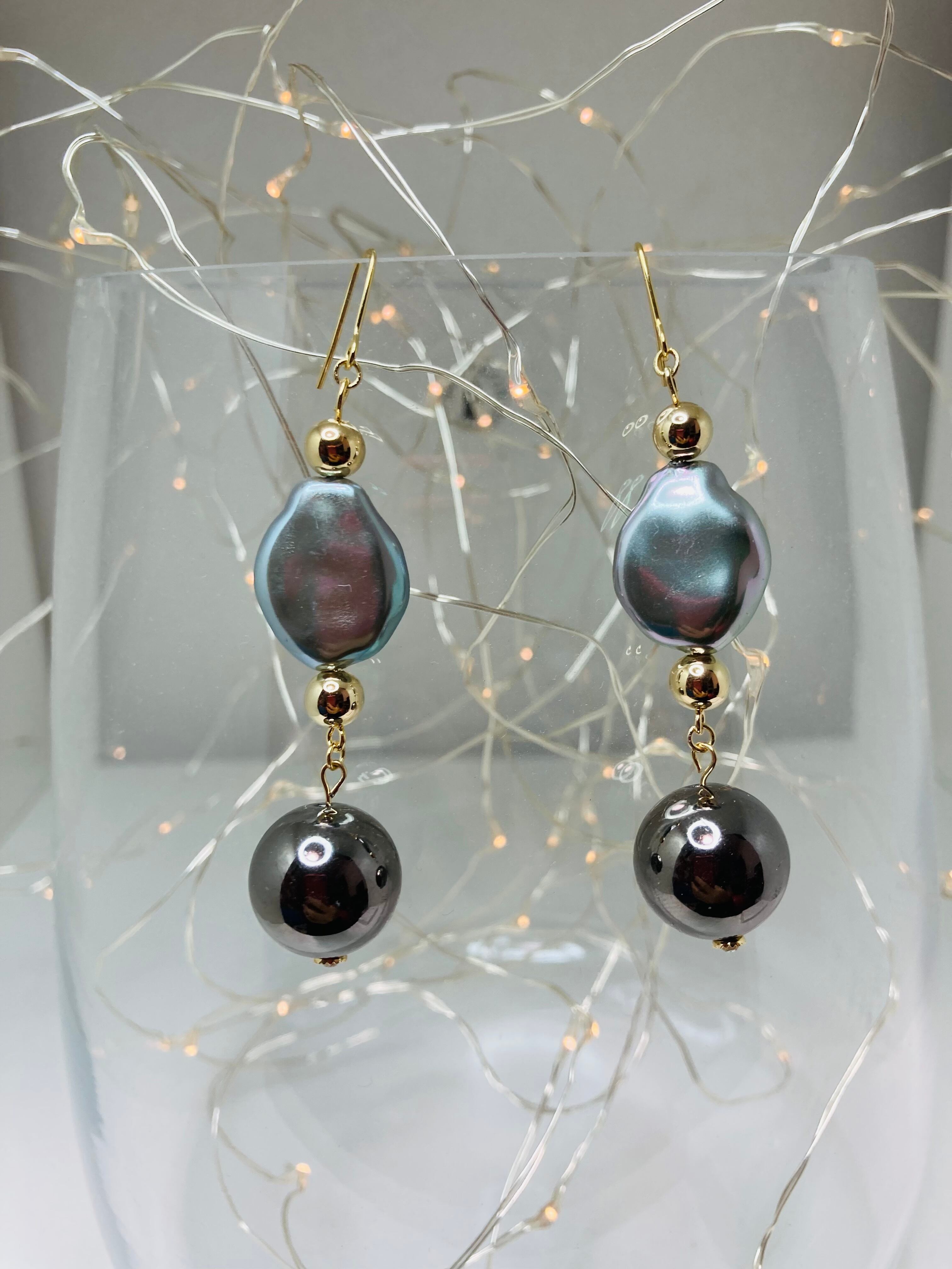 グレーパールのフラットビーンズとブラックのメタルボールを組み合わせたピアスです。