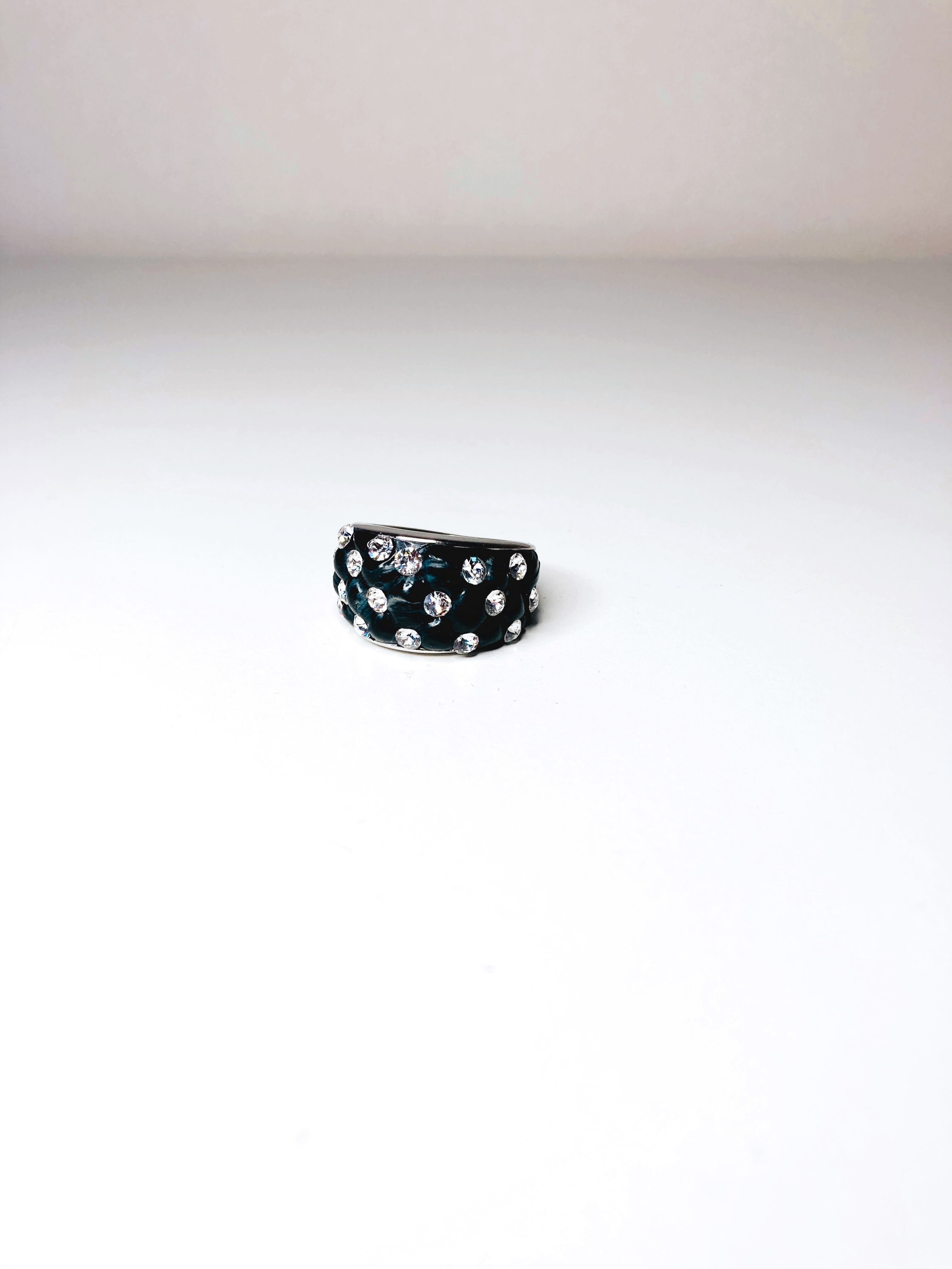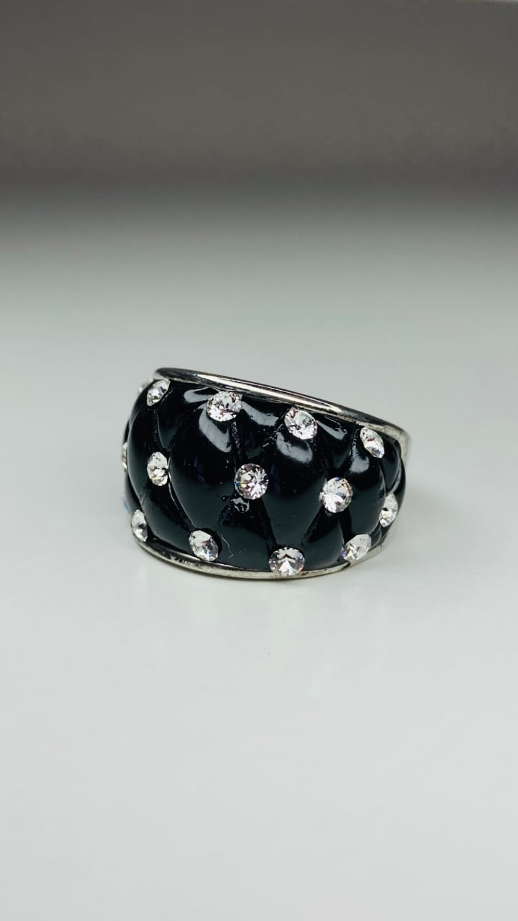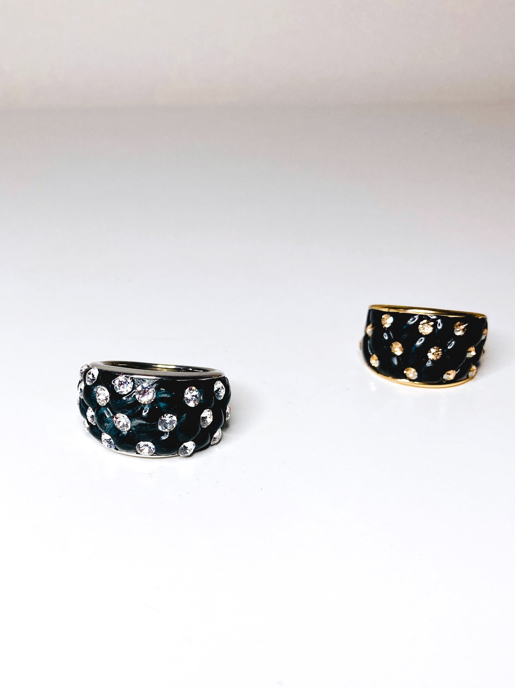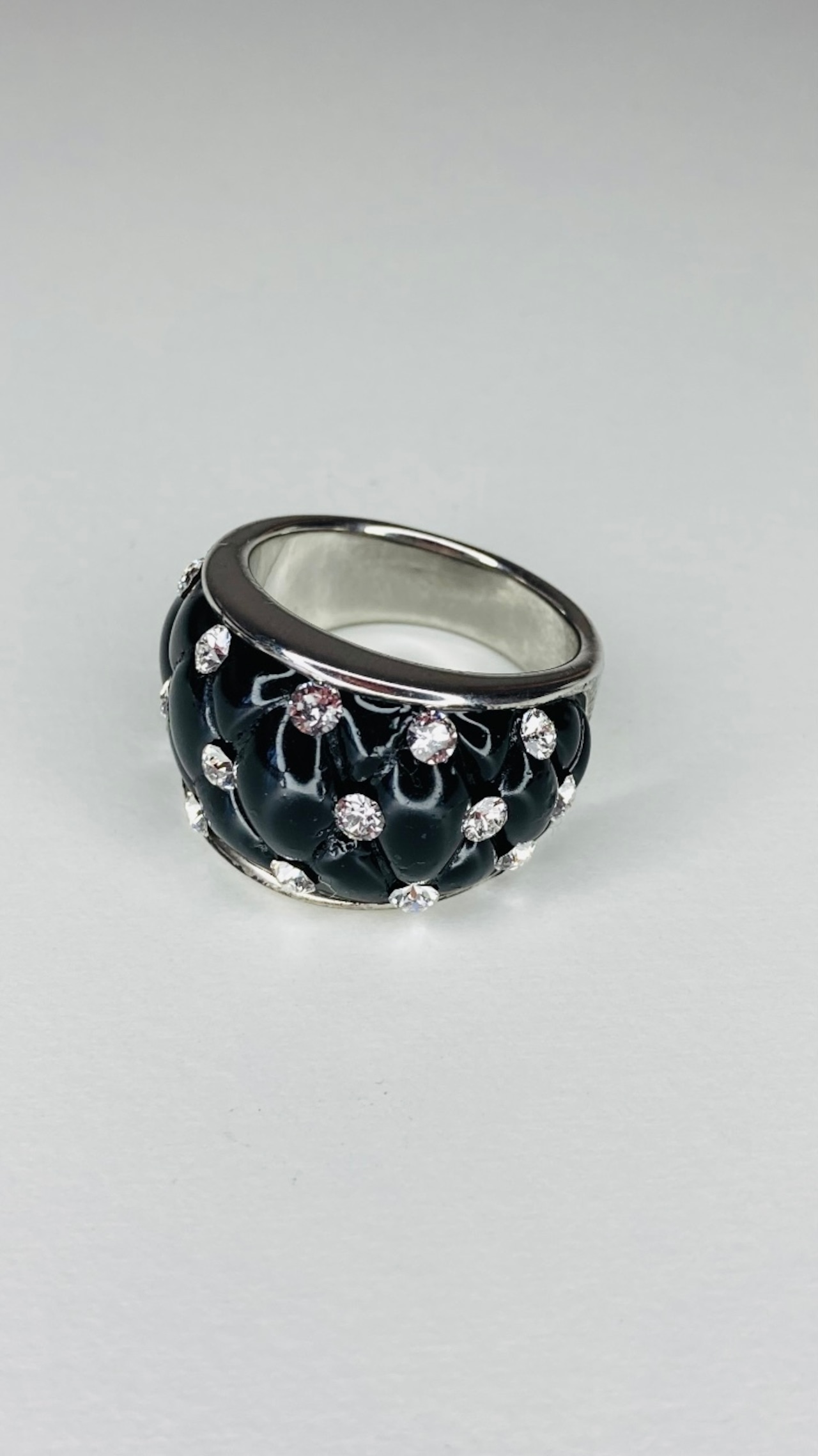 光沢の出るブラックのラスタークレイ(粘着粘土)をキルティング加工し、クリスタルを散りばめたボリュームのあるリングです。