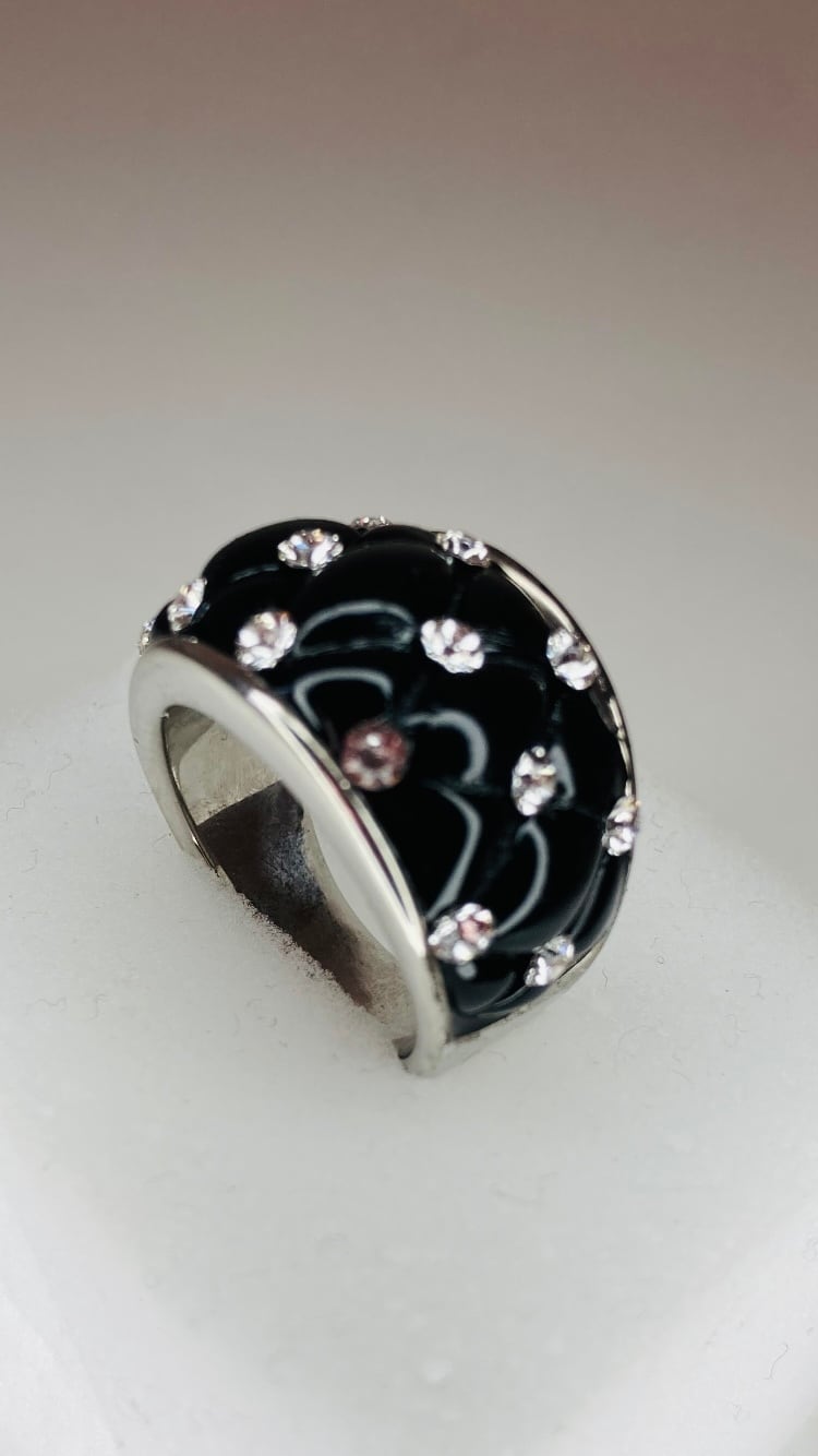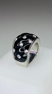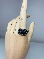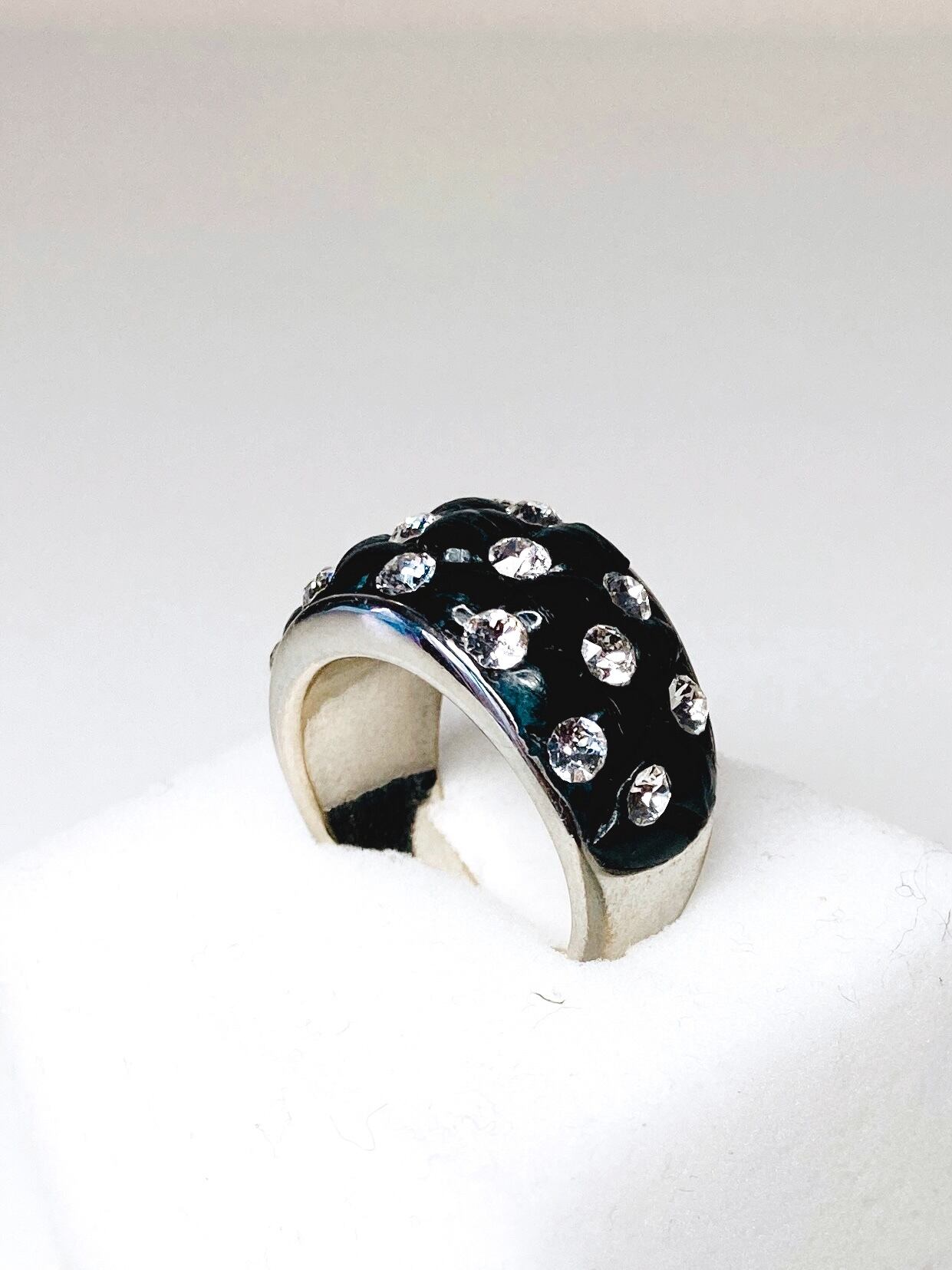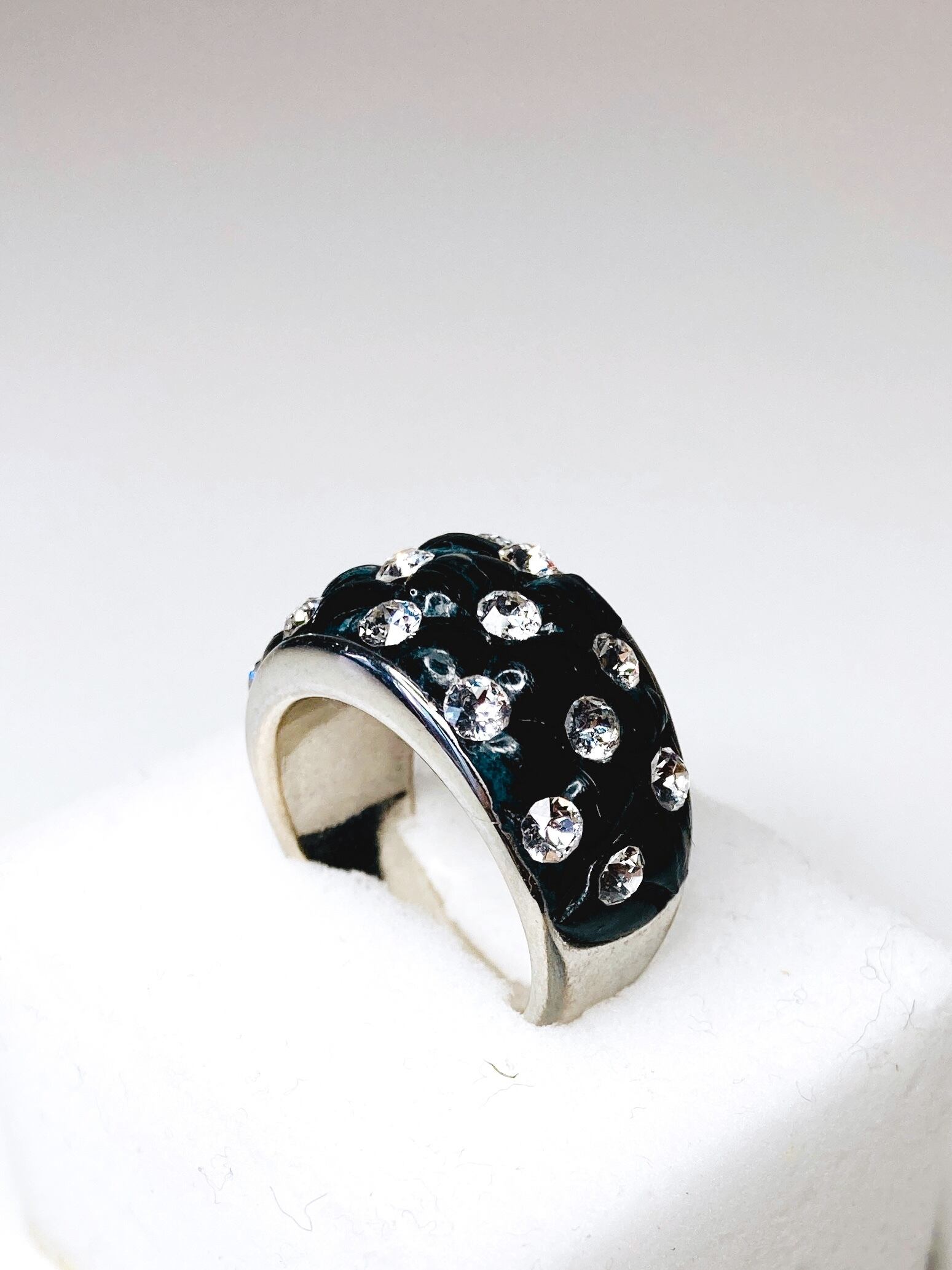 光沢の出るブラックのラスタークレイ(粘着粘土)をキルティング加工し、クリスタルを散りばめたボリュームのあるリングです。
