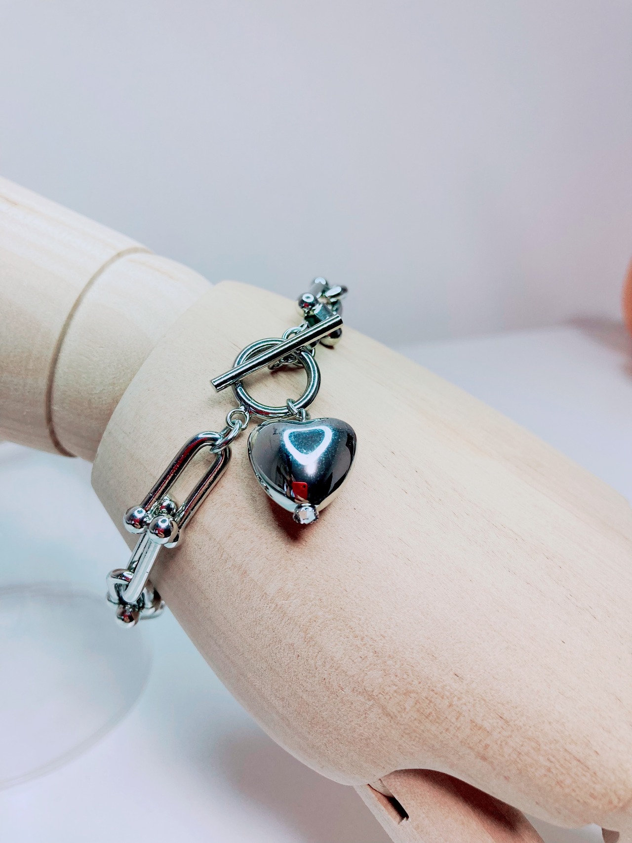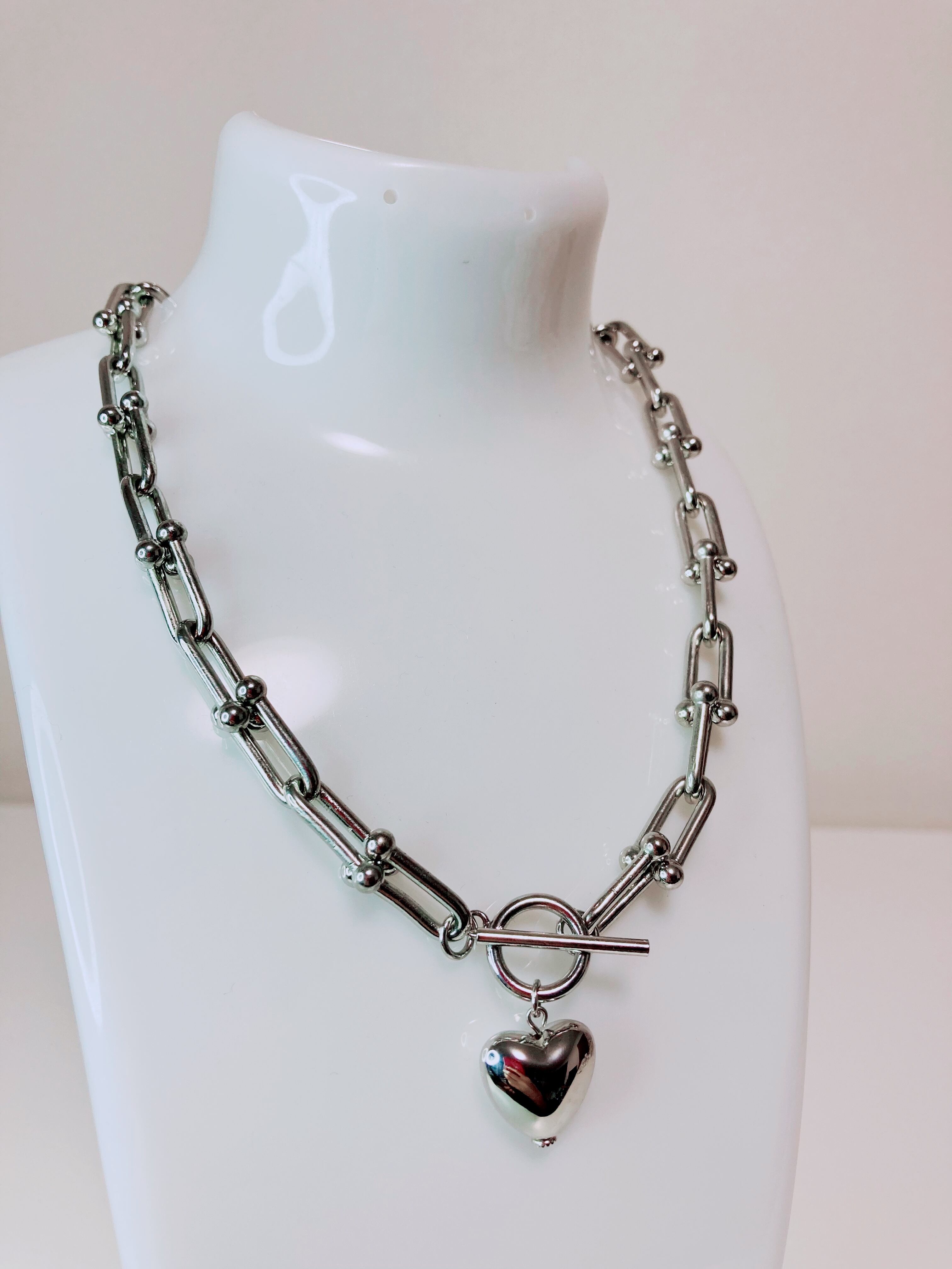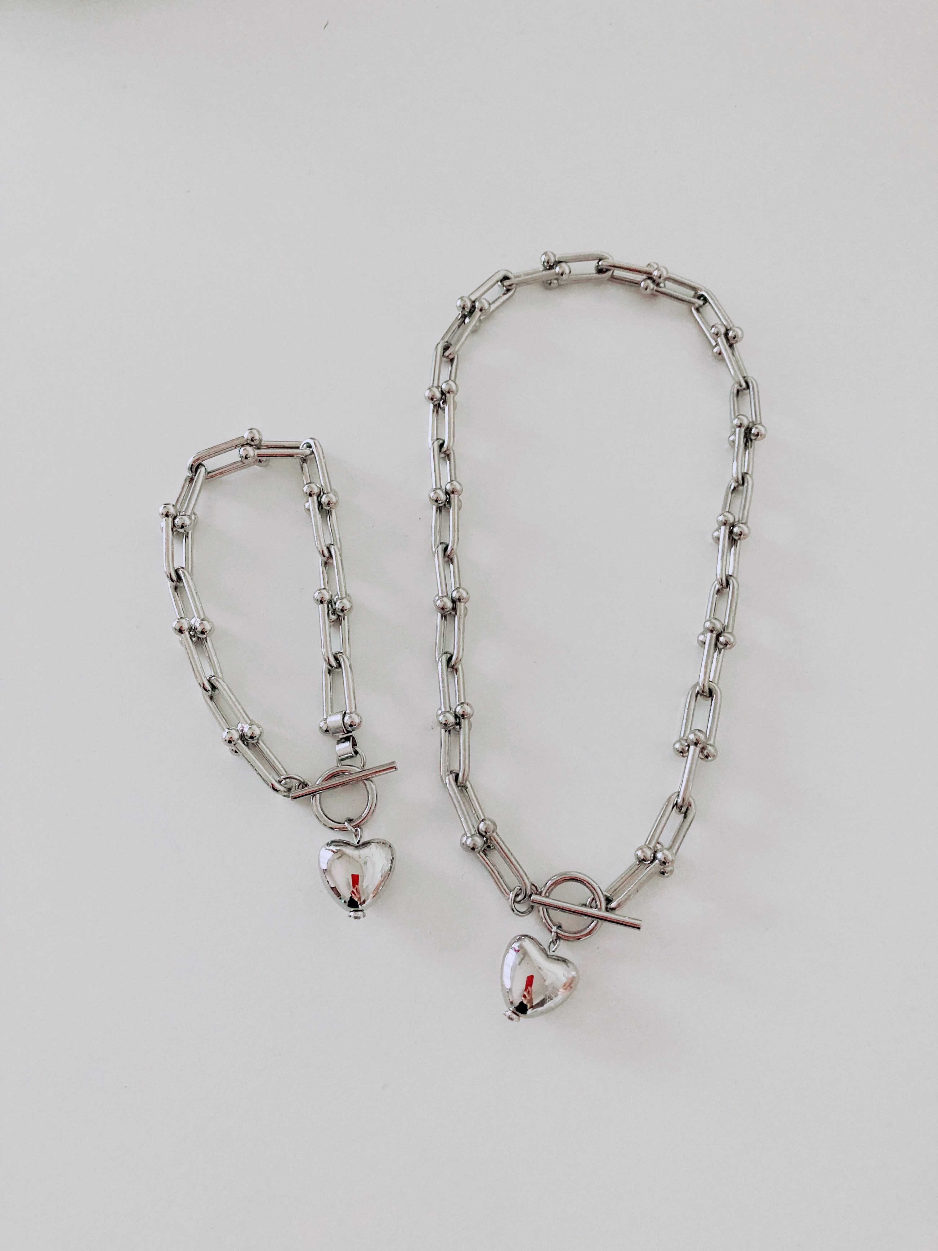 ボリュームのあるハードなチェーンの下に揺れるハートチャームでとってもキュートな仕上がりです。