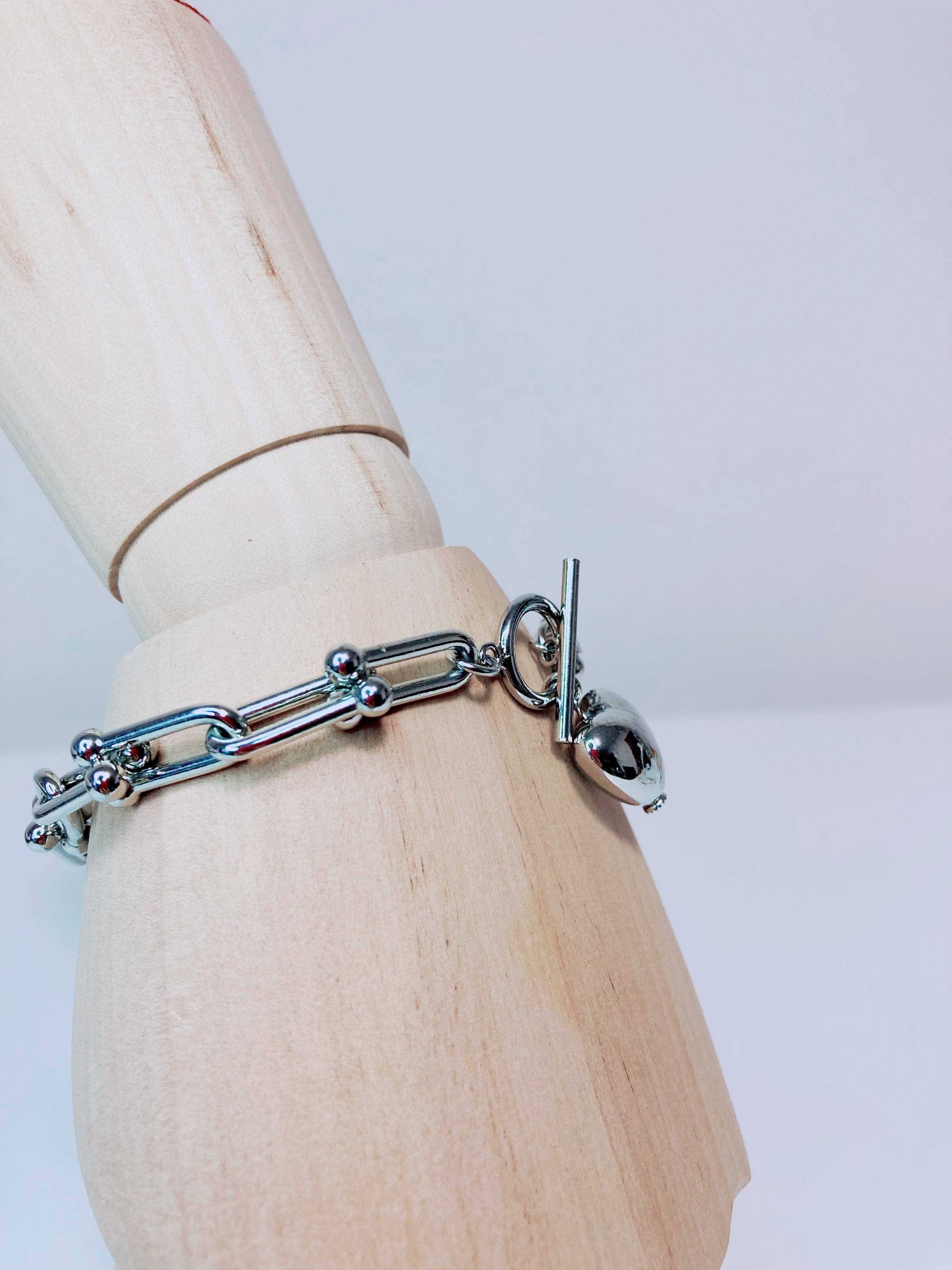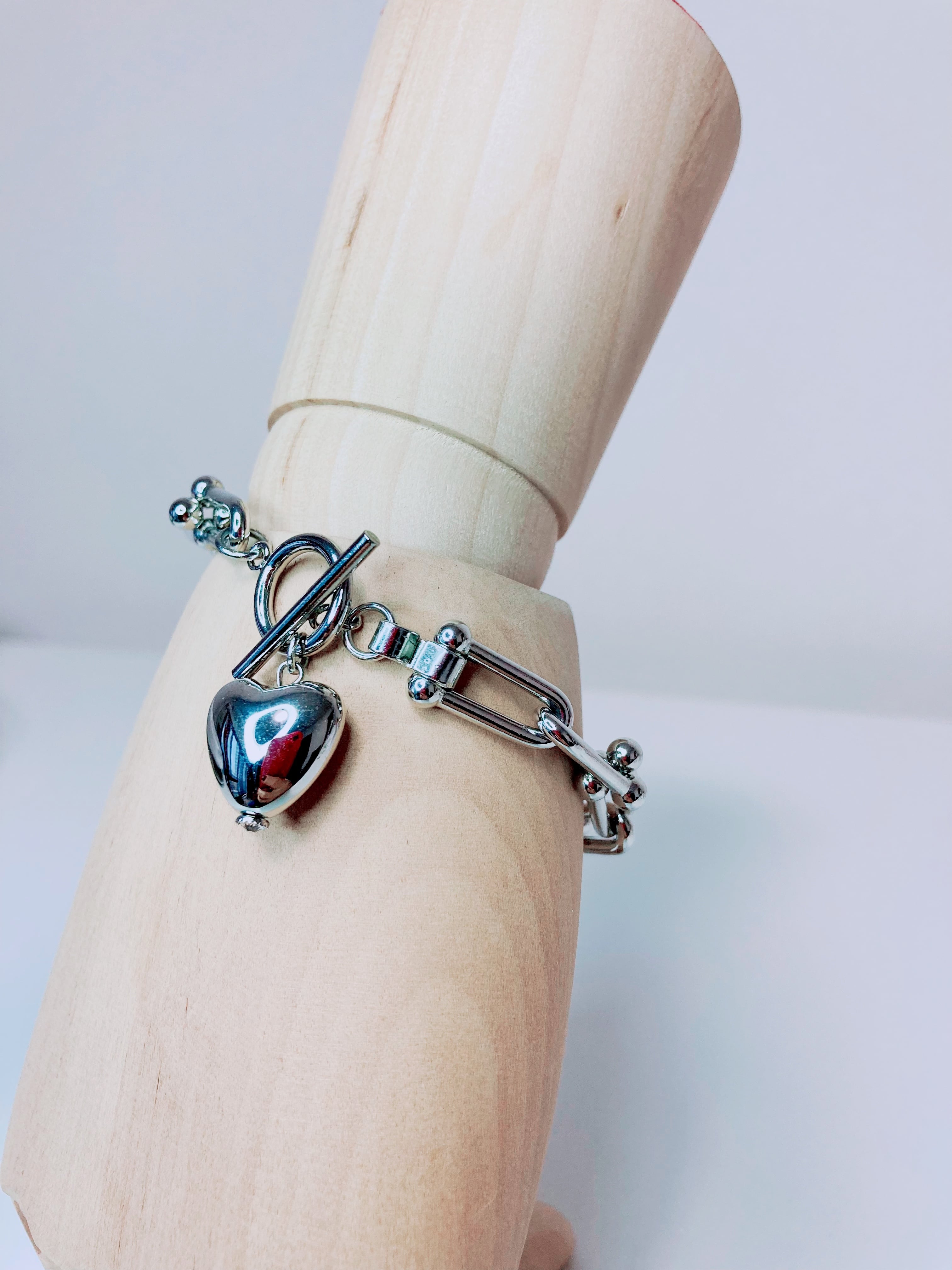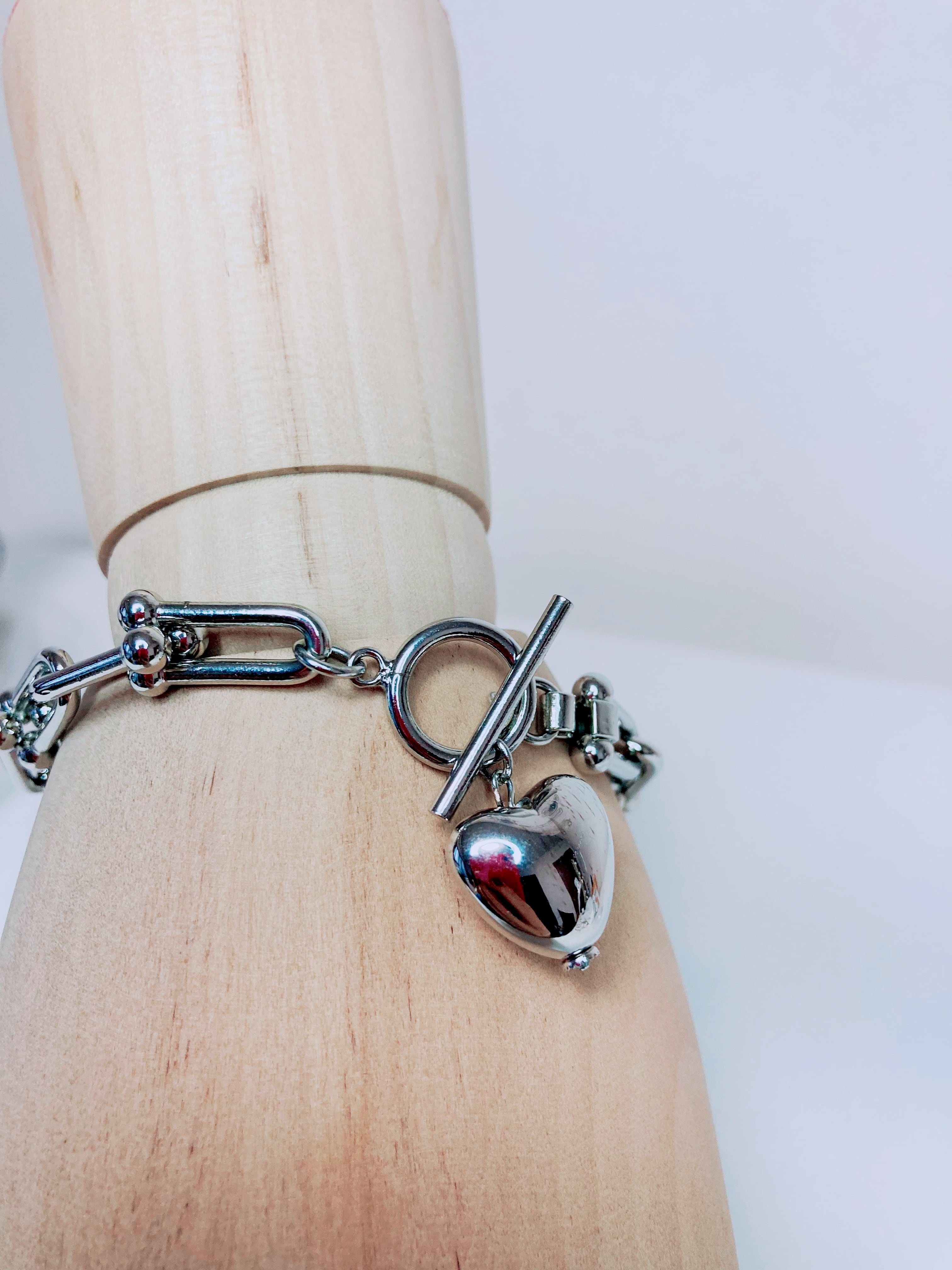 ボリュームのあるハードなチェーンの下に揺れるハートチャームでとってもキュートな仕上がりです。