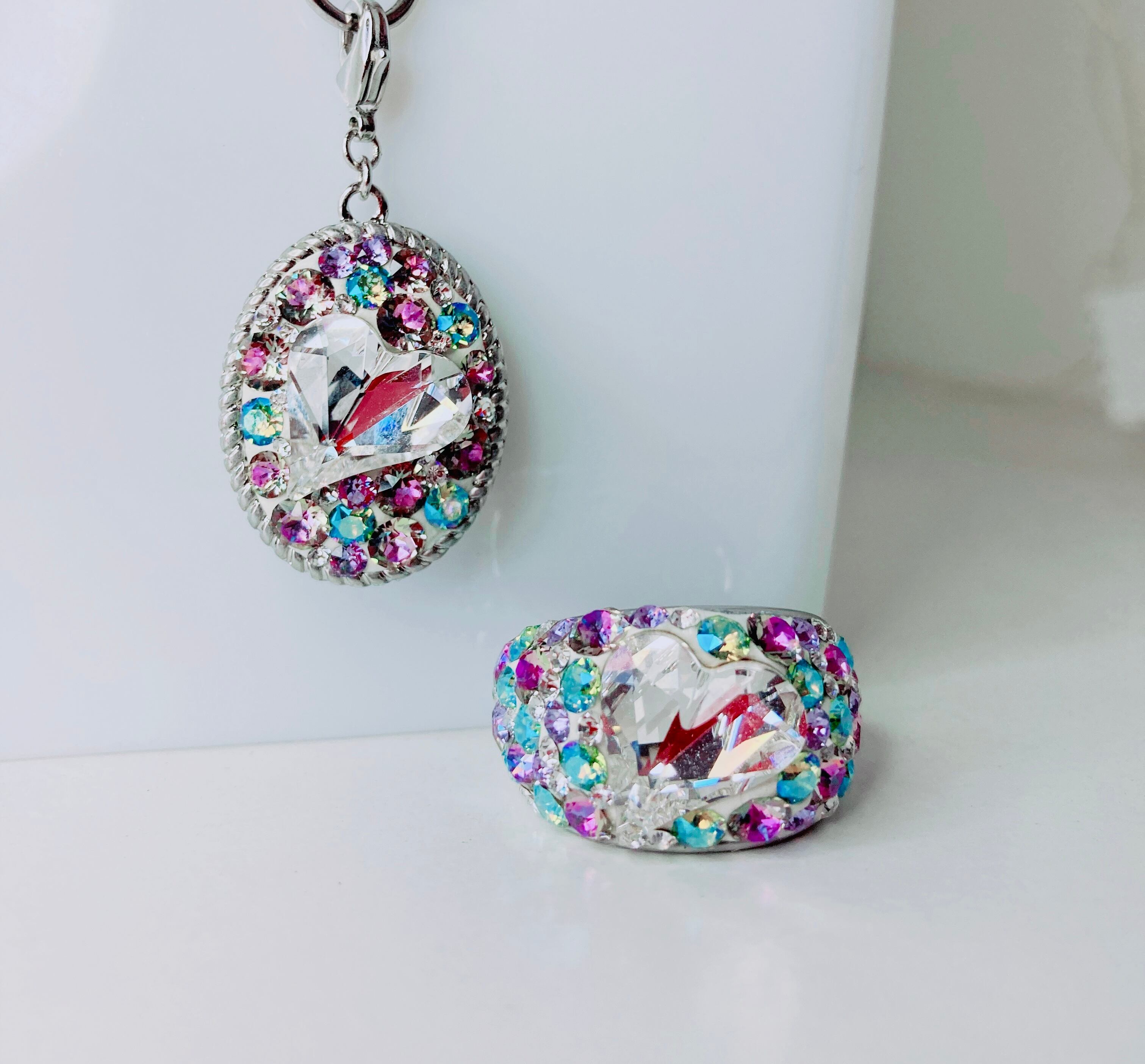 最高級の輝きを放つクリスタルのみを贅沢に散りばめたハートネックレス&リングのセットです。