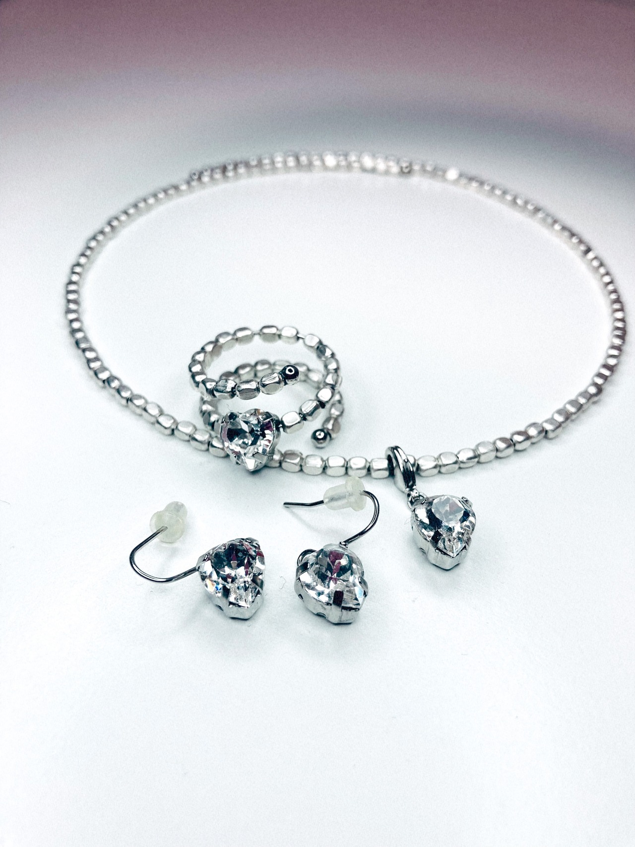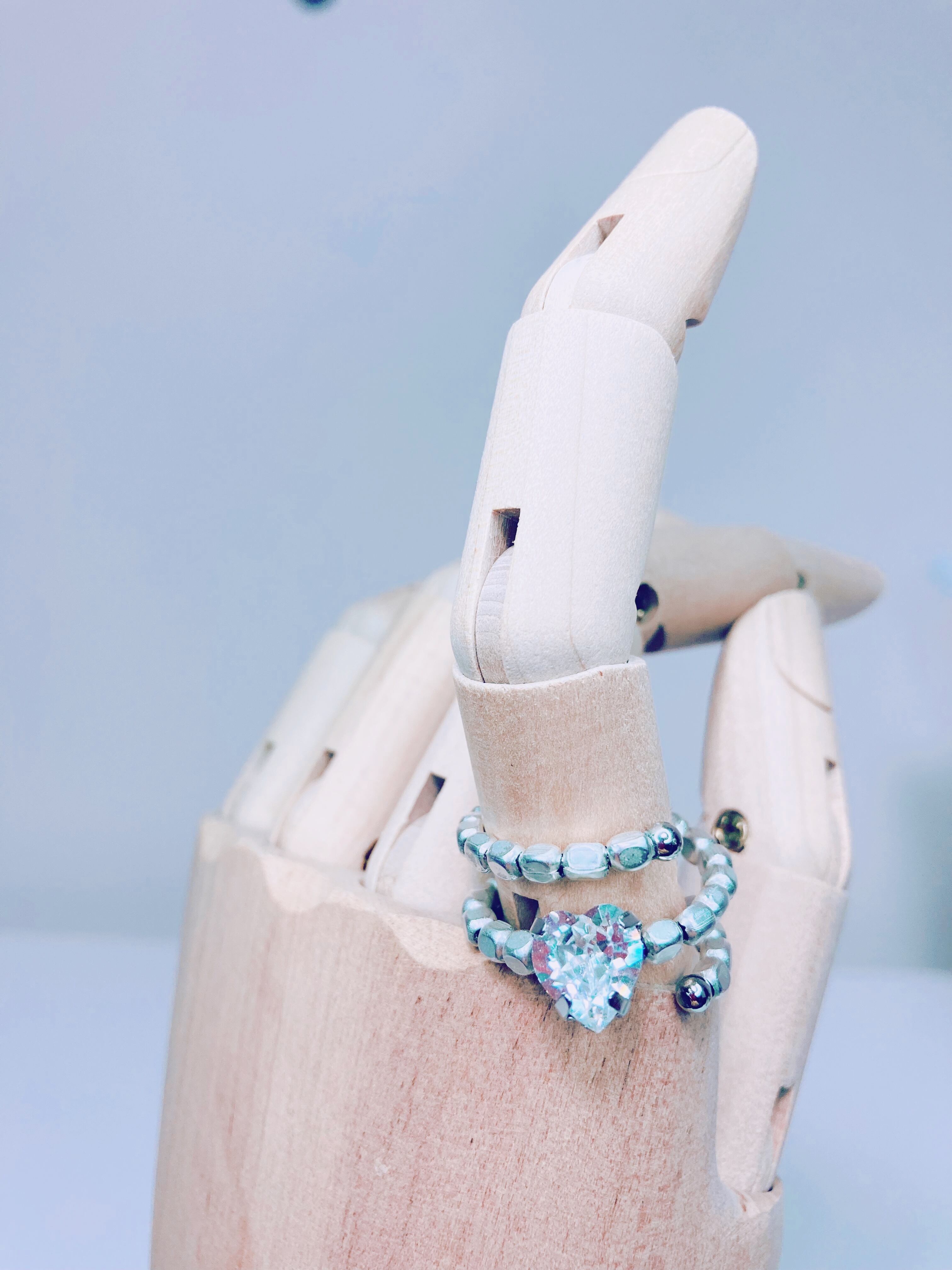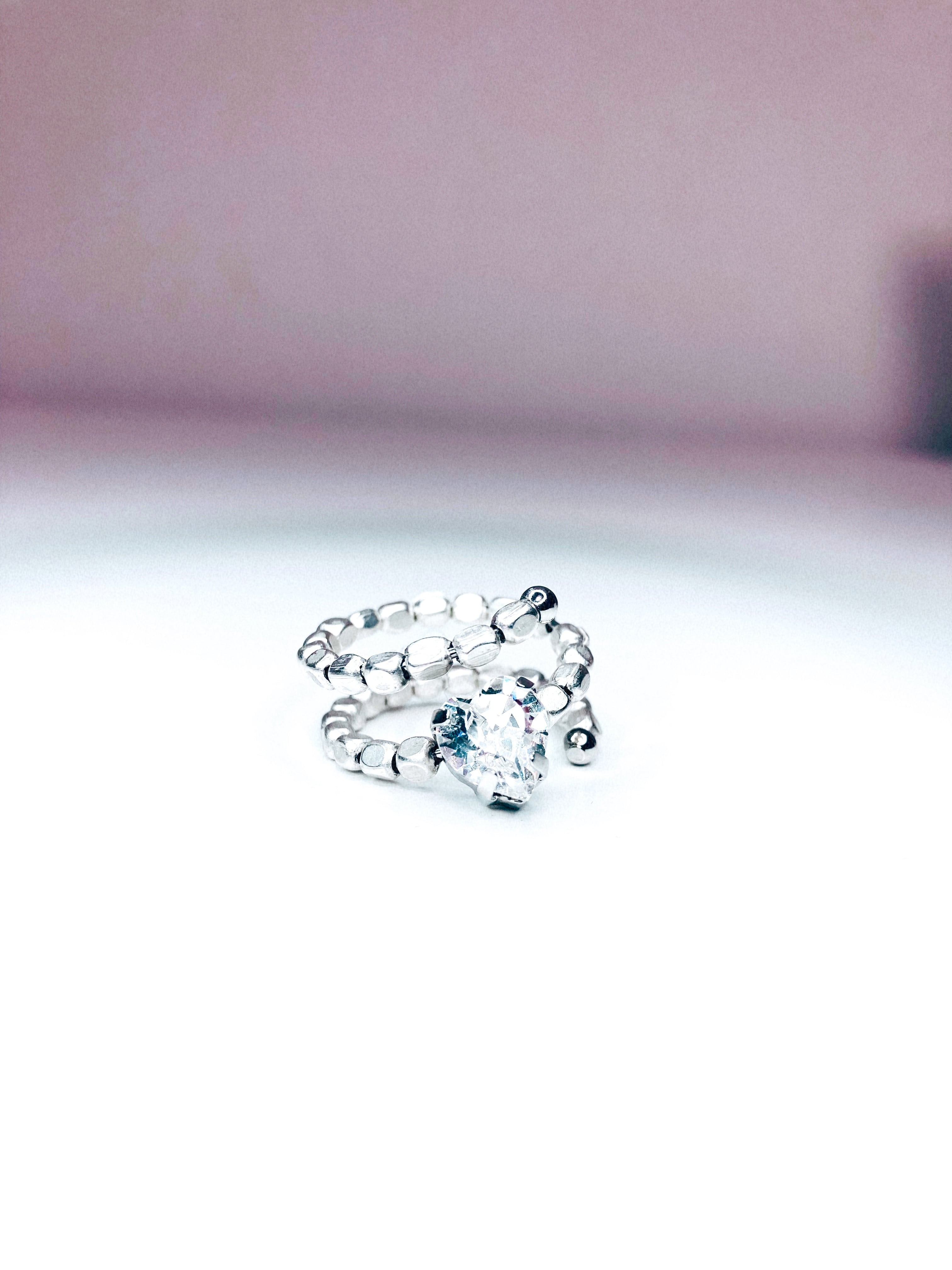 メタルビーズのコイルリング中央部にクリスタルのハートが1粒。