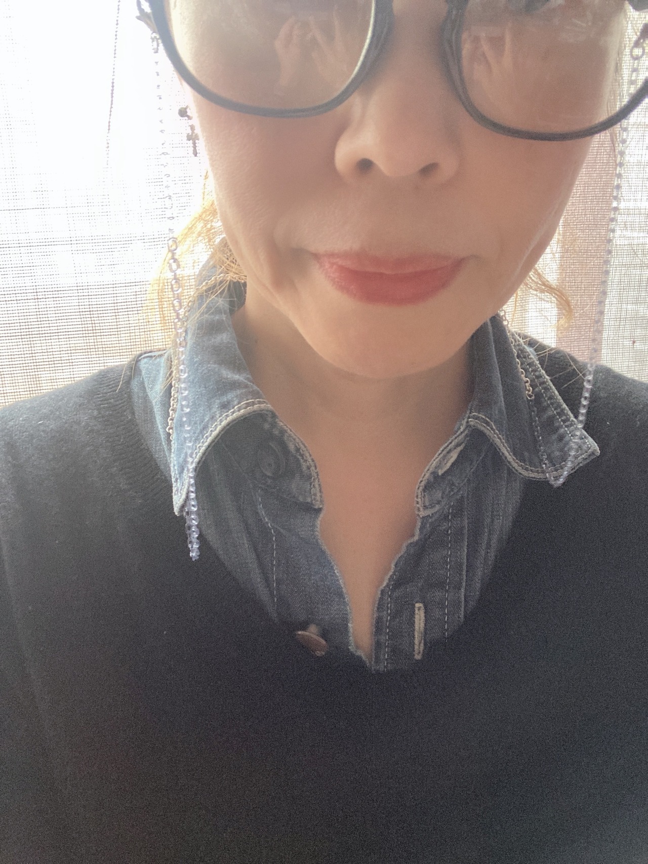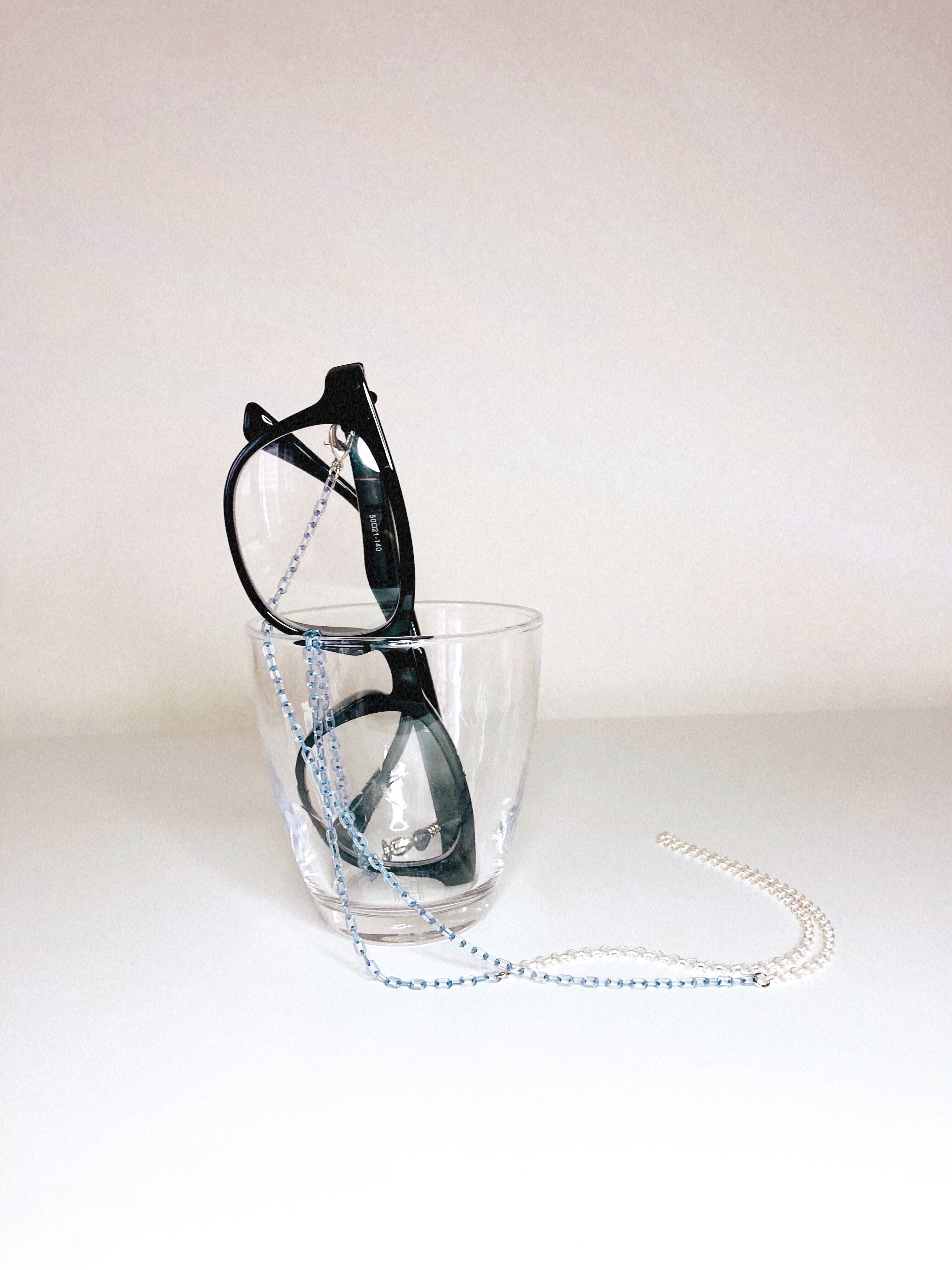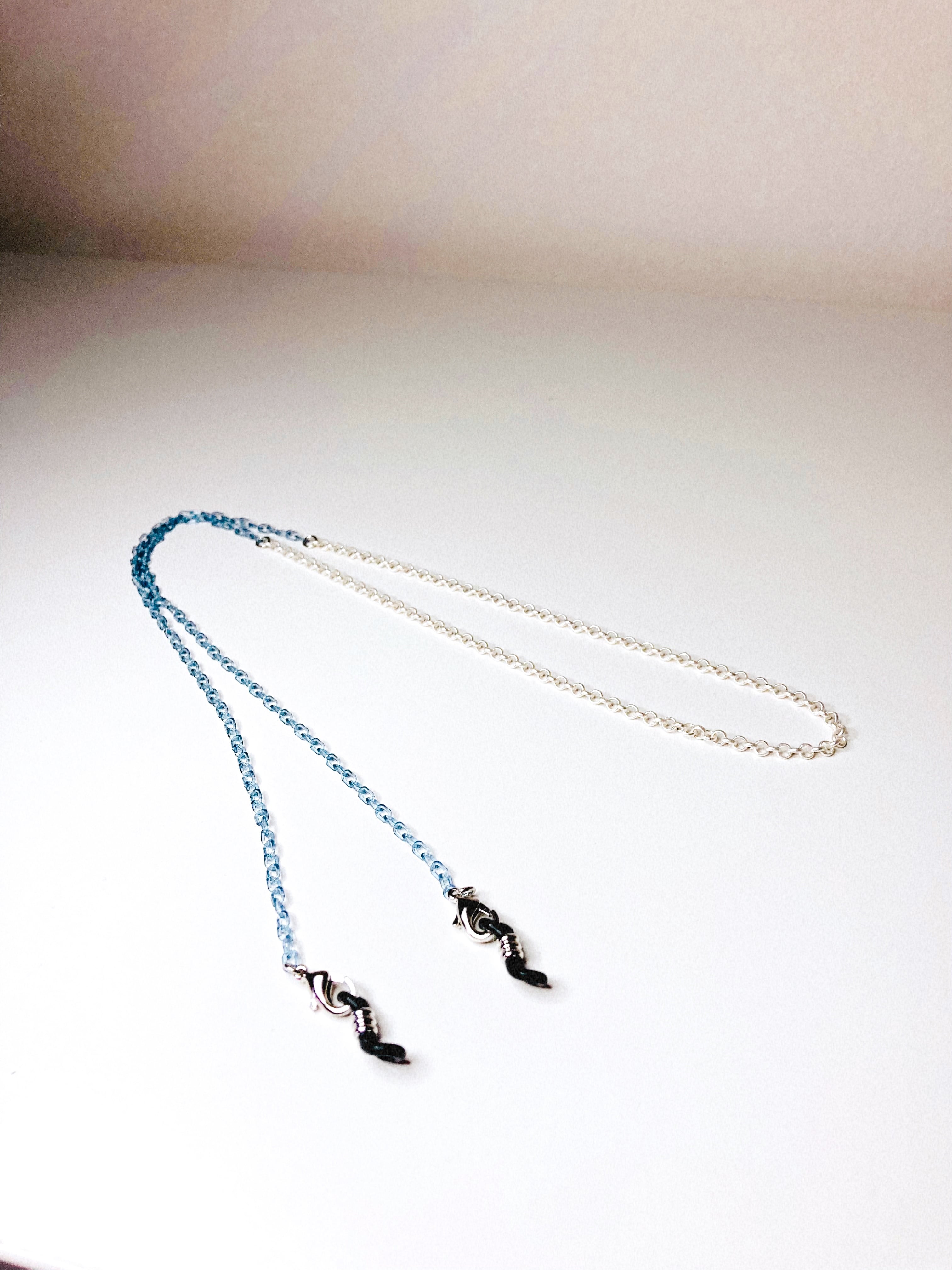 シルバーとクリアブルーのプラスチックを使ったメガネチェーンです。