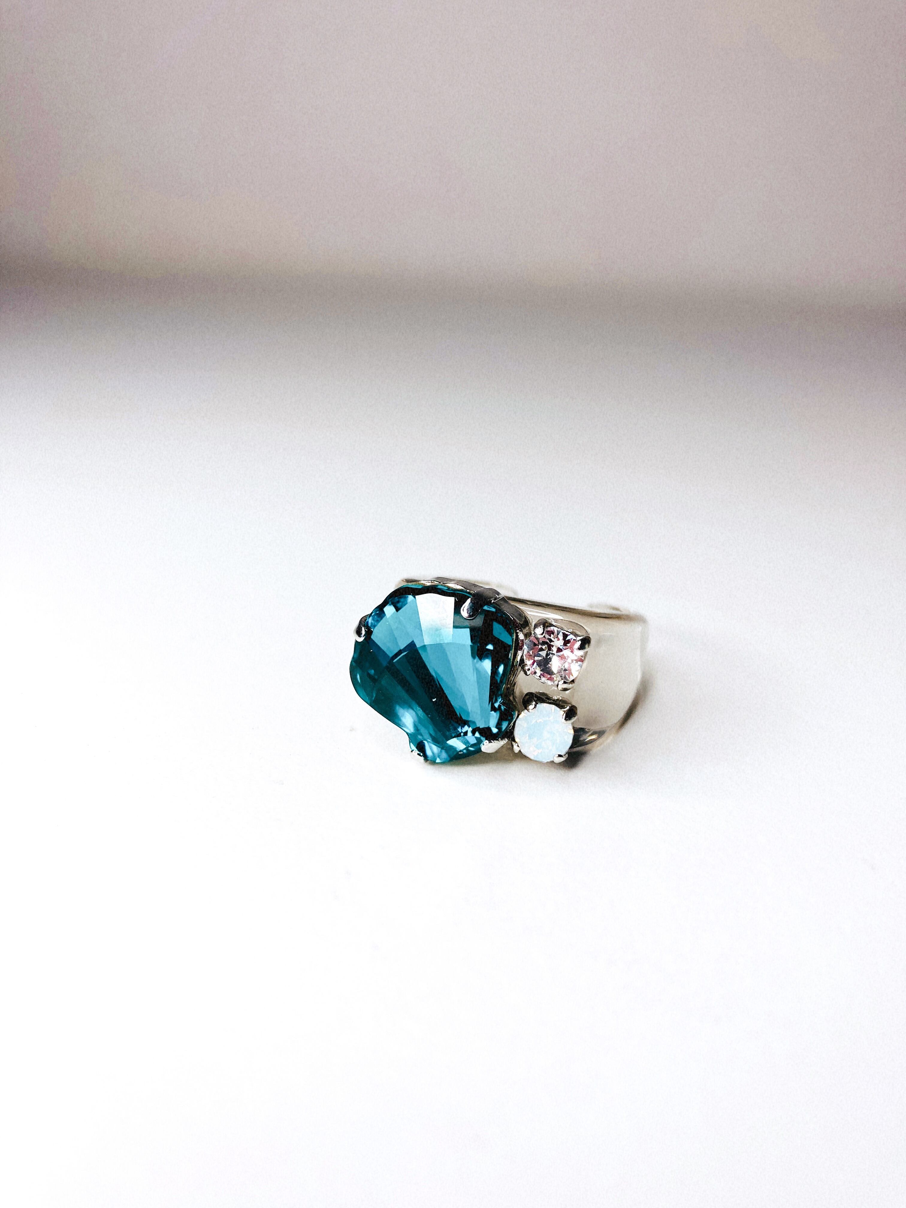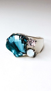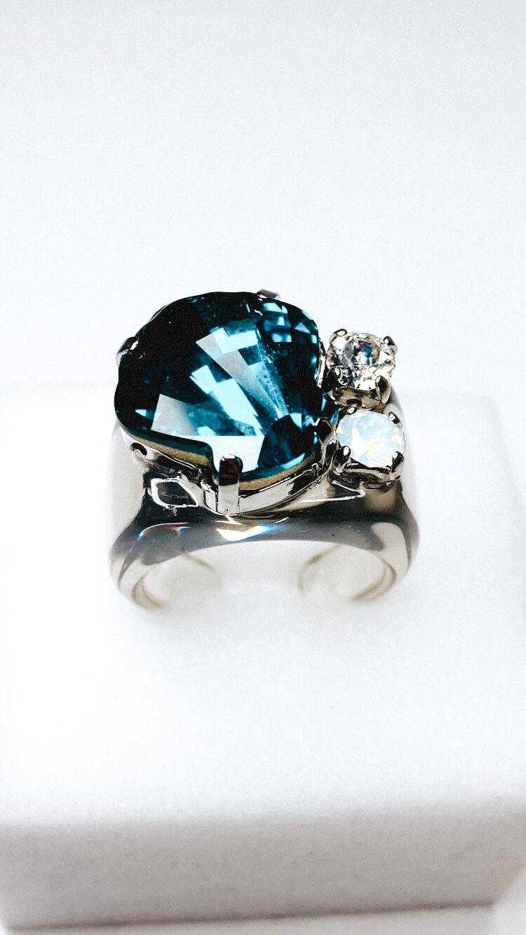 深みのあるブルーシェルと2つのクリスタルでとってもゴージャスなリングです。