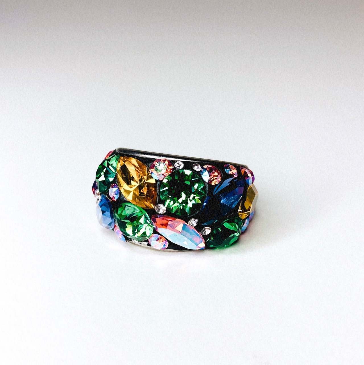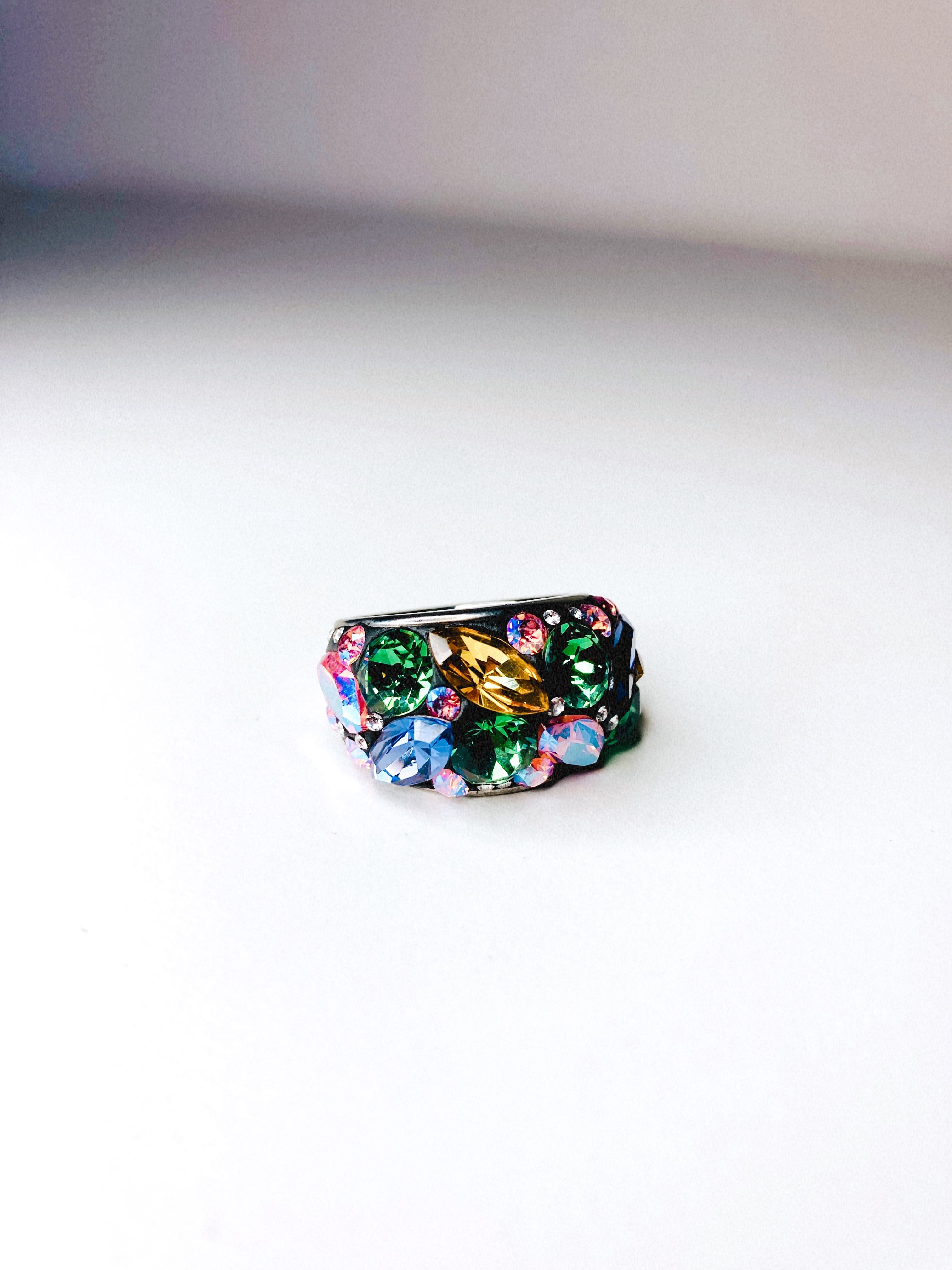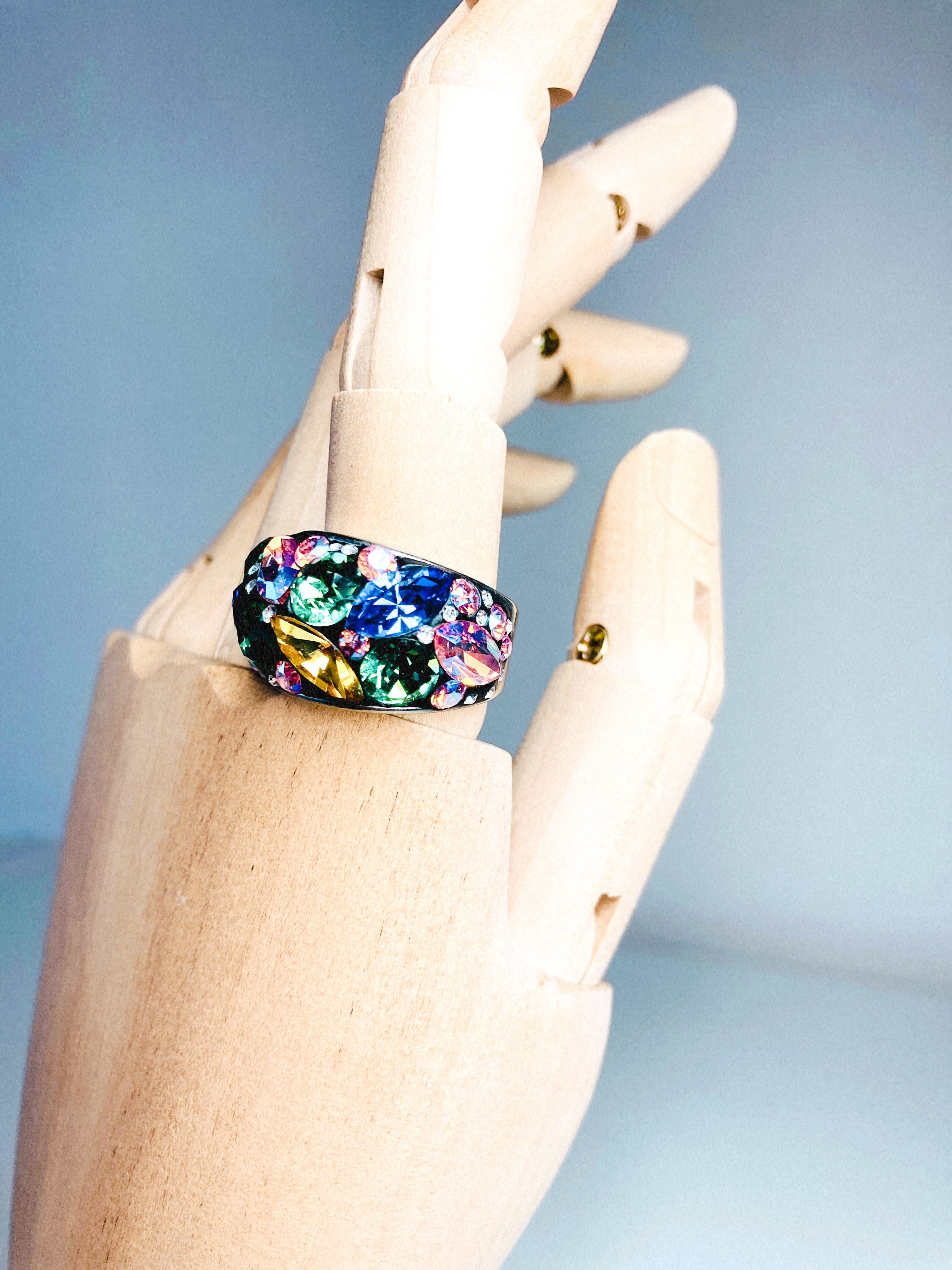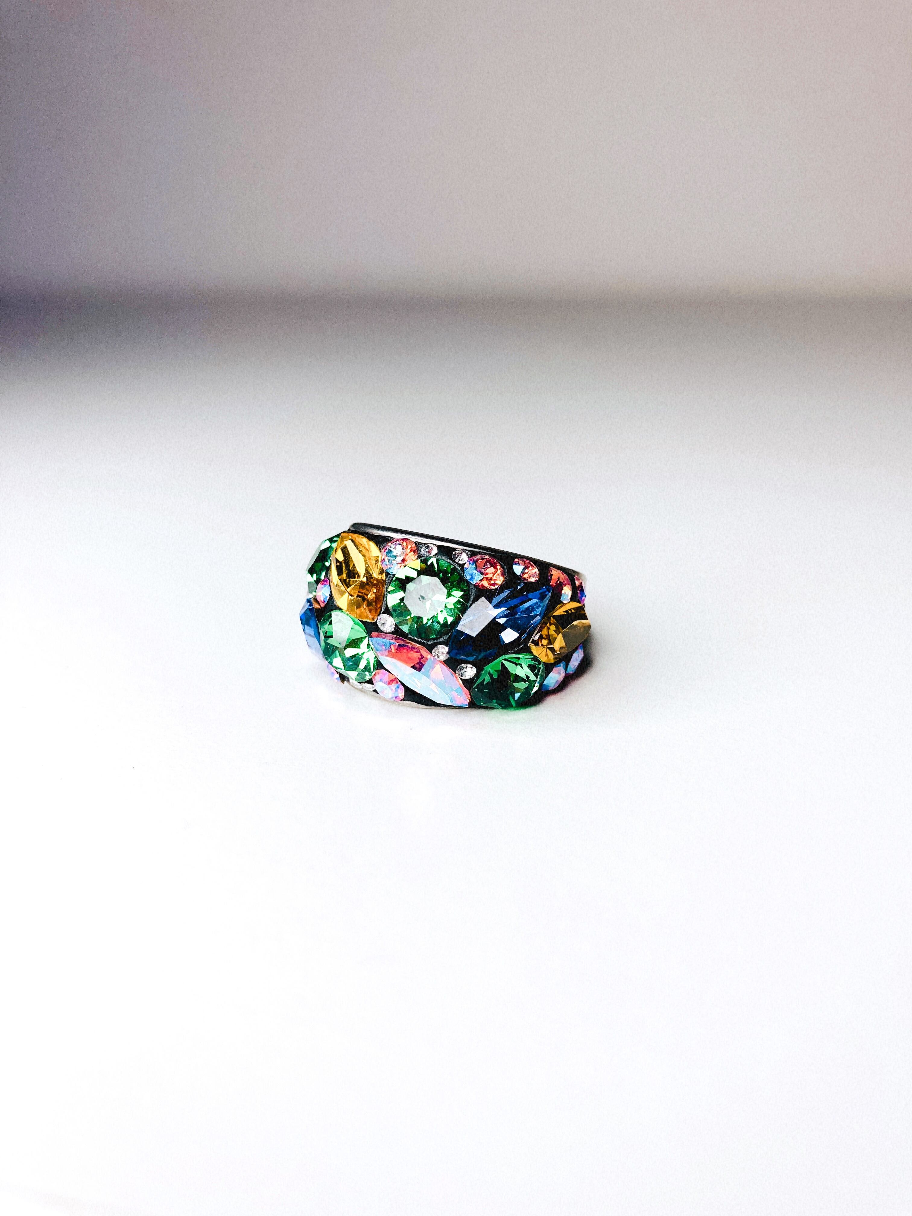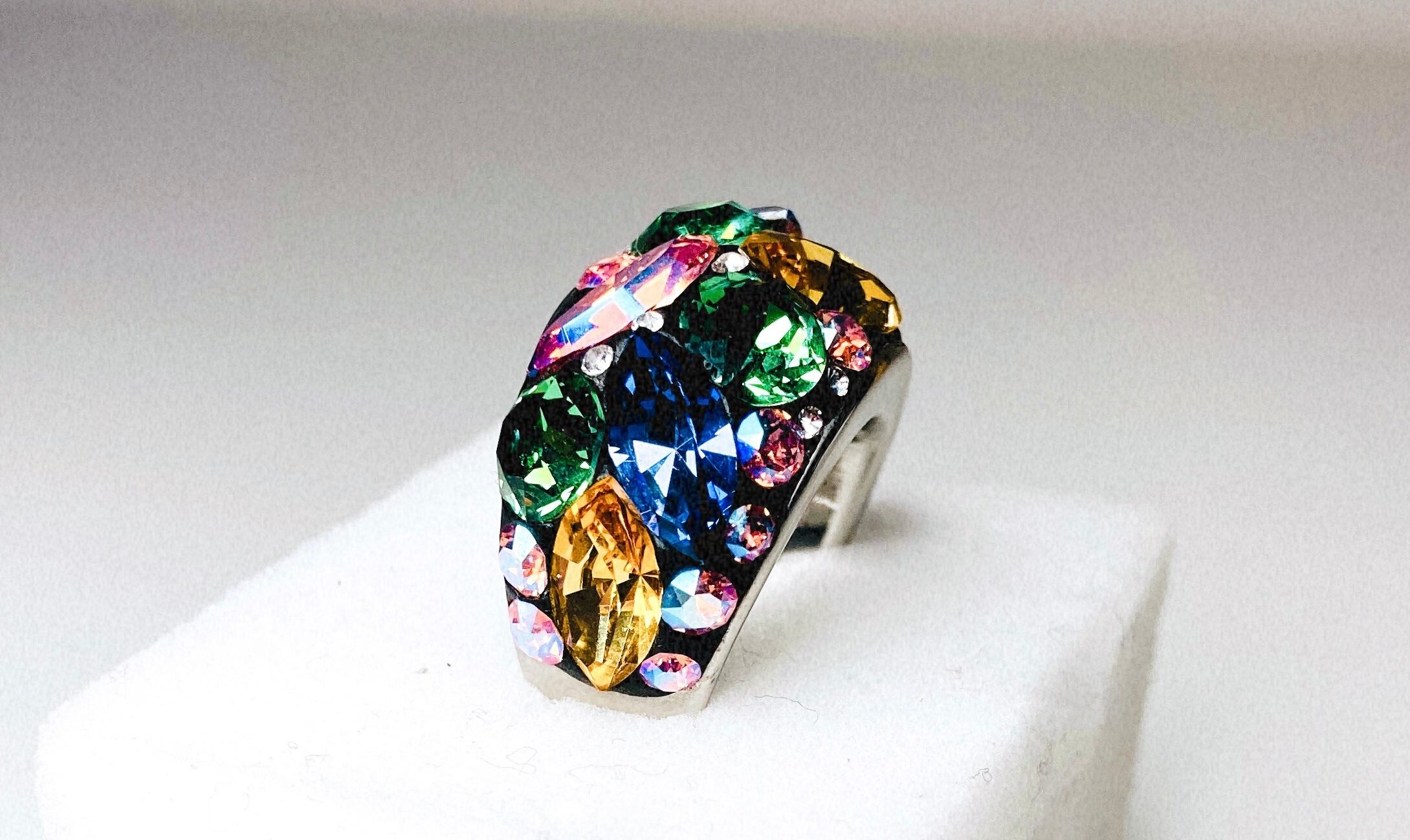 クリスタルには、今年のトレンドカラーでもあるシックなグリーン系、パープル、イエロー、ピンク系を使用し、ボリューミーでゴージャスなビジューリングに仕上げました。