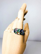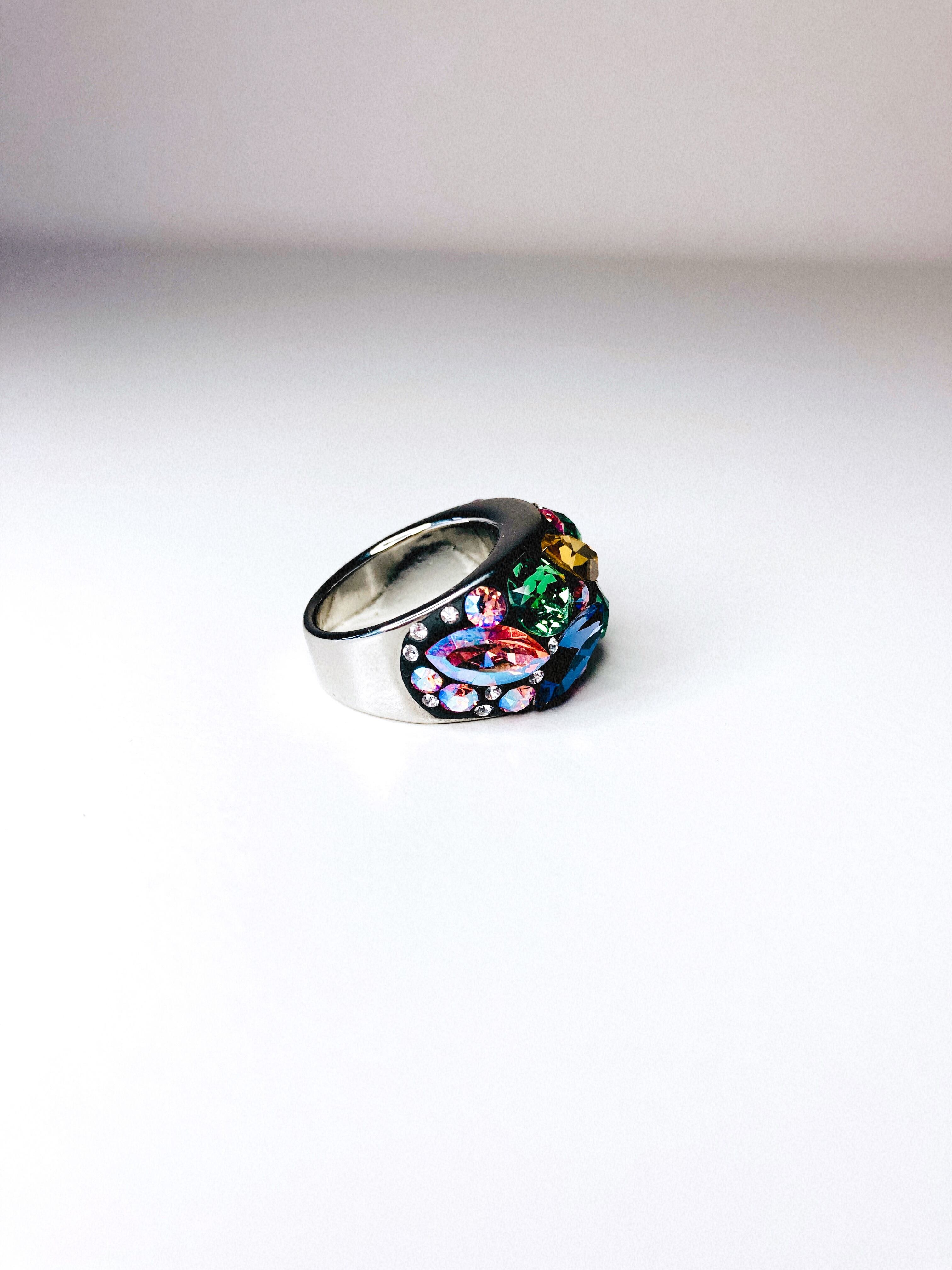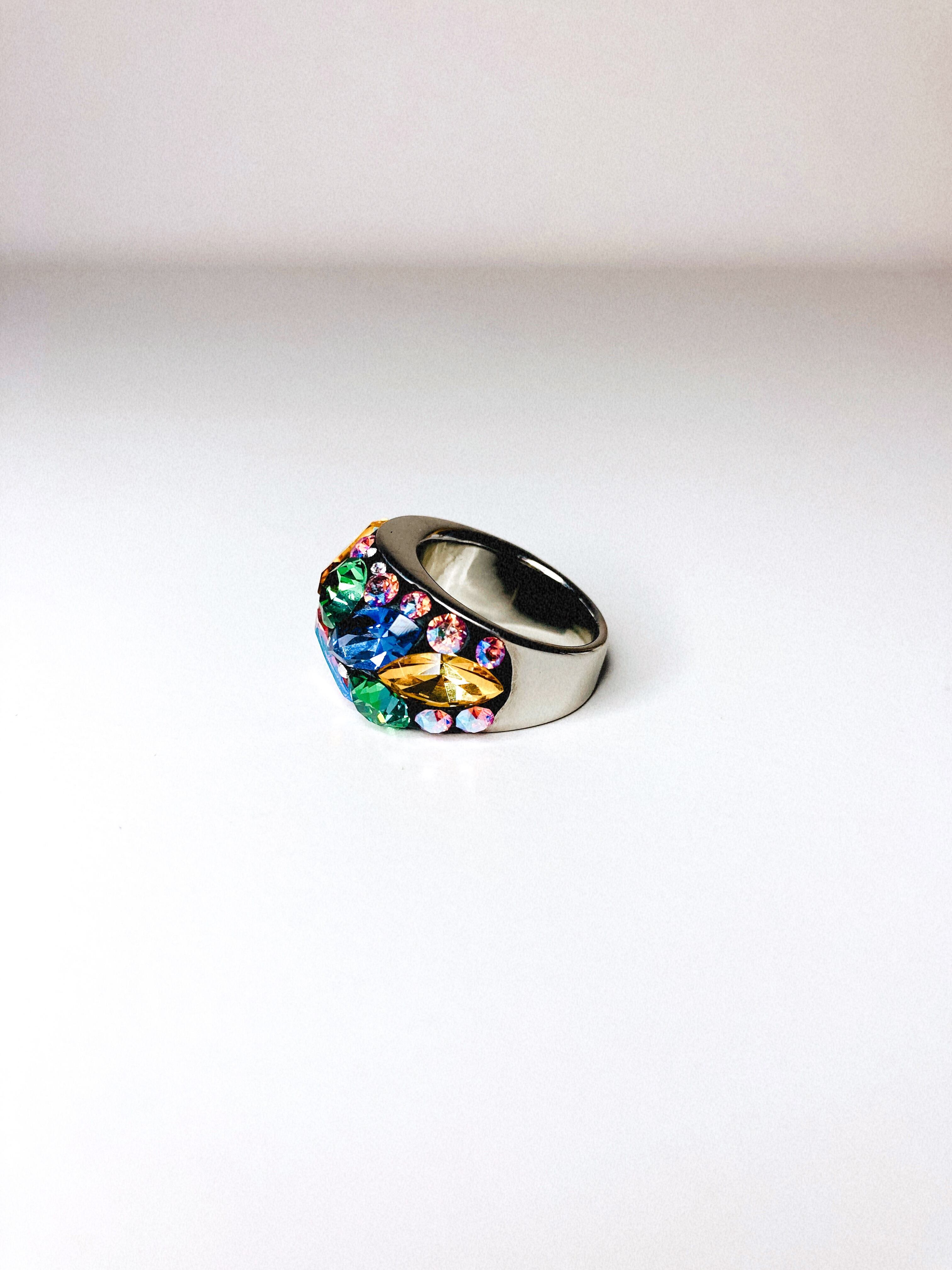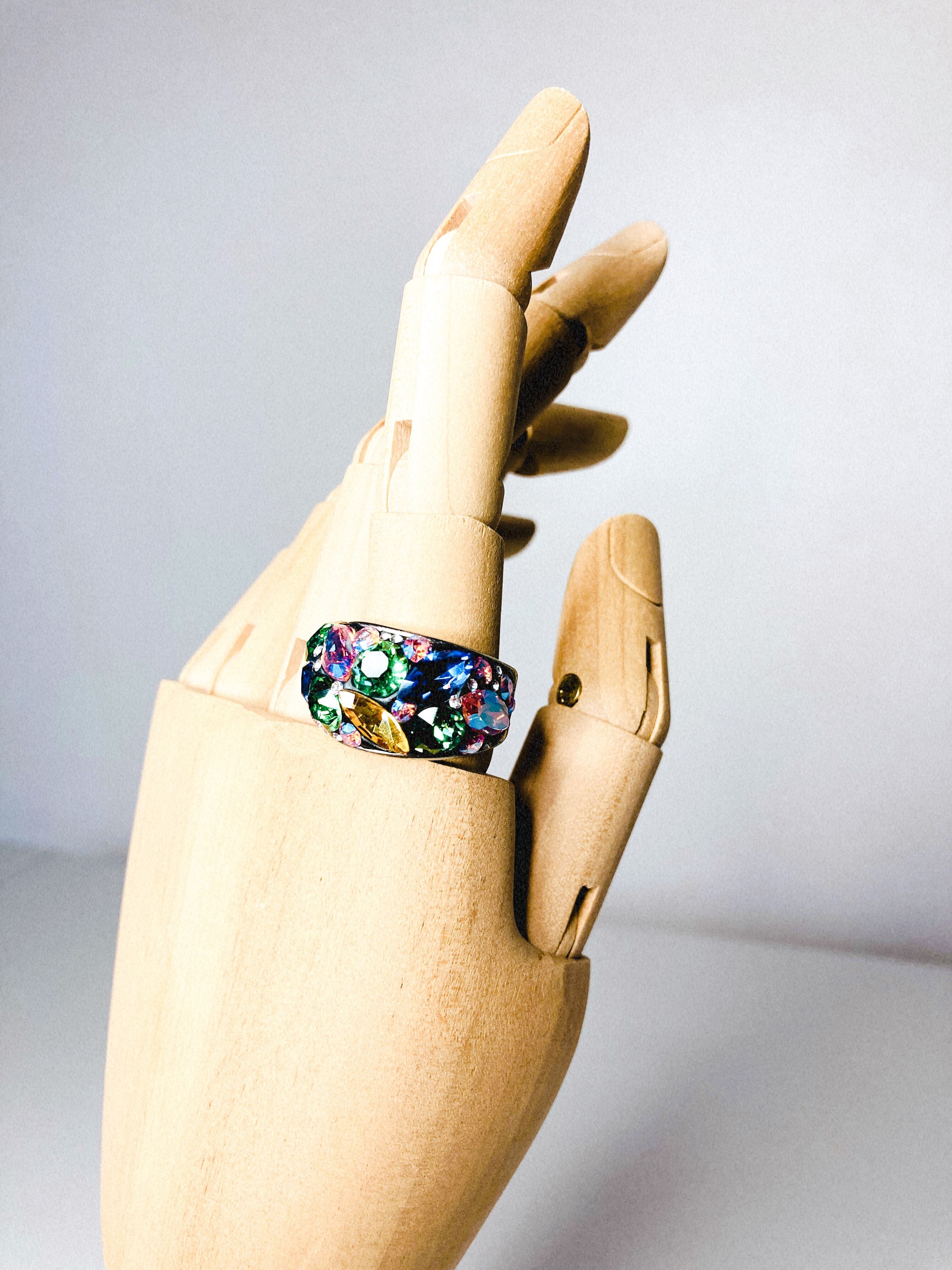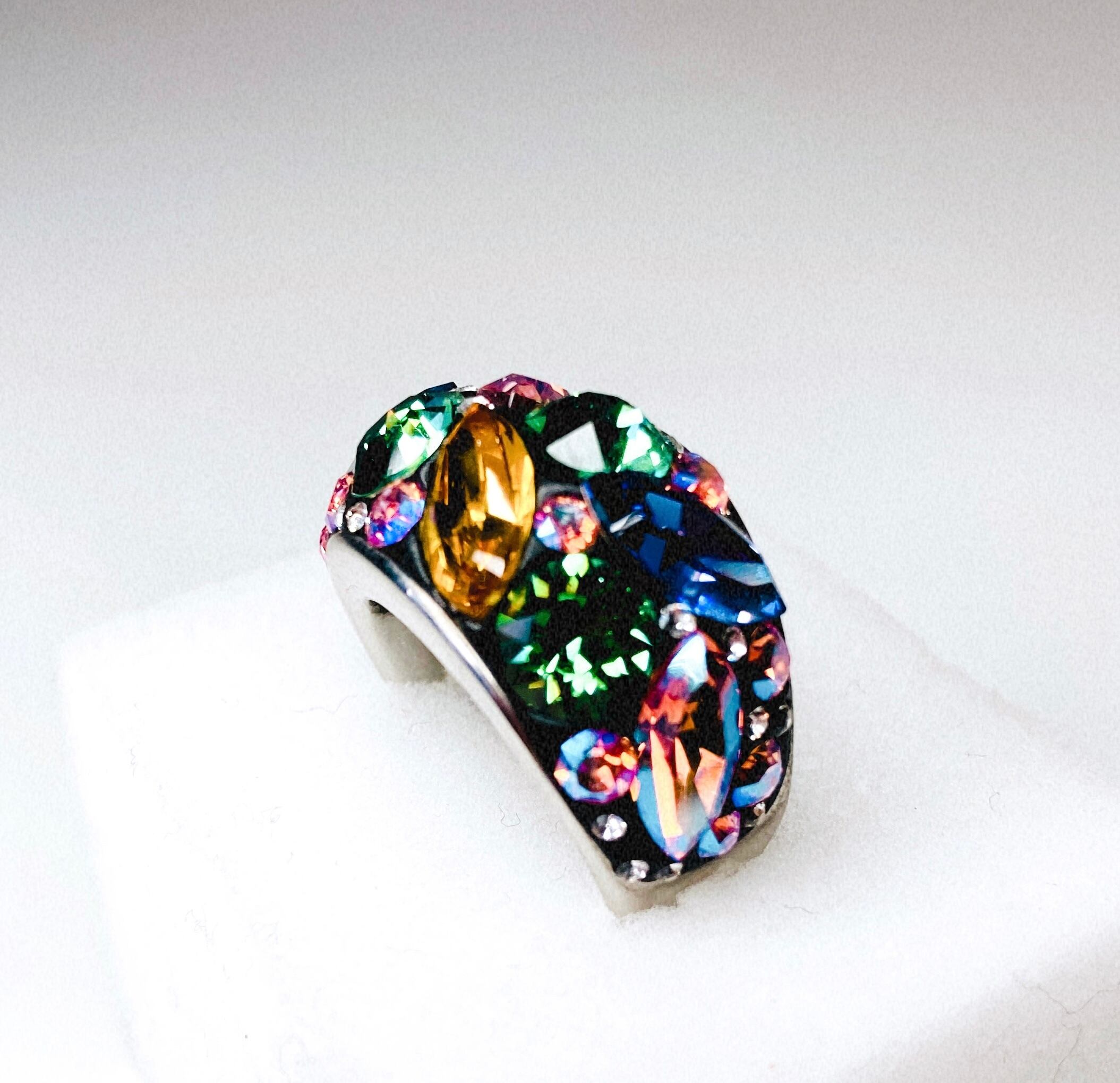 クリスタルには、今年のトレンドカラーでもあるシックなグリーン系、パープル、イエロー、ピンク系を使用し、ボリューミーでゴージャスなビジューリングに仕上げました。
