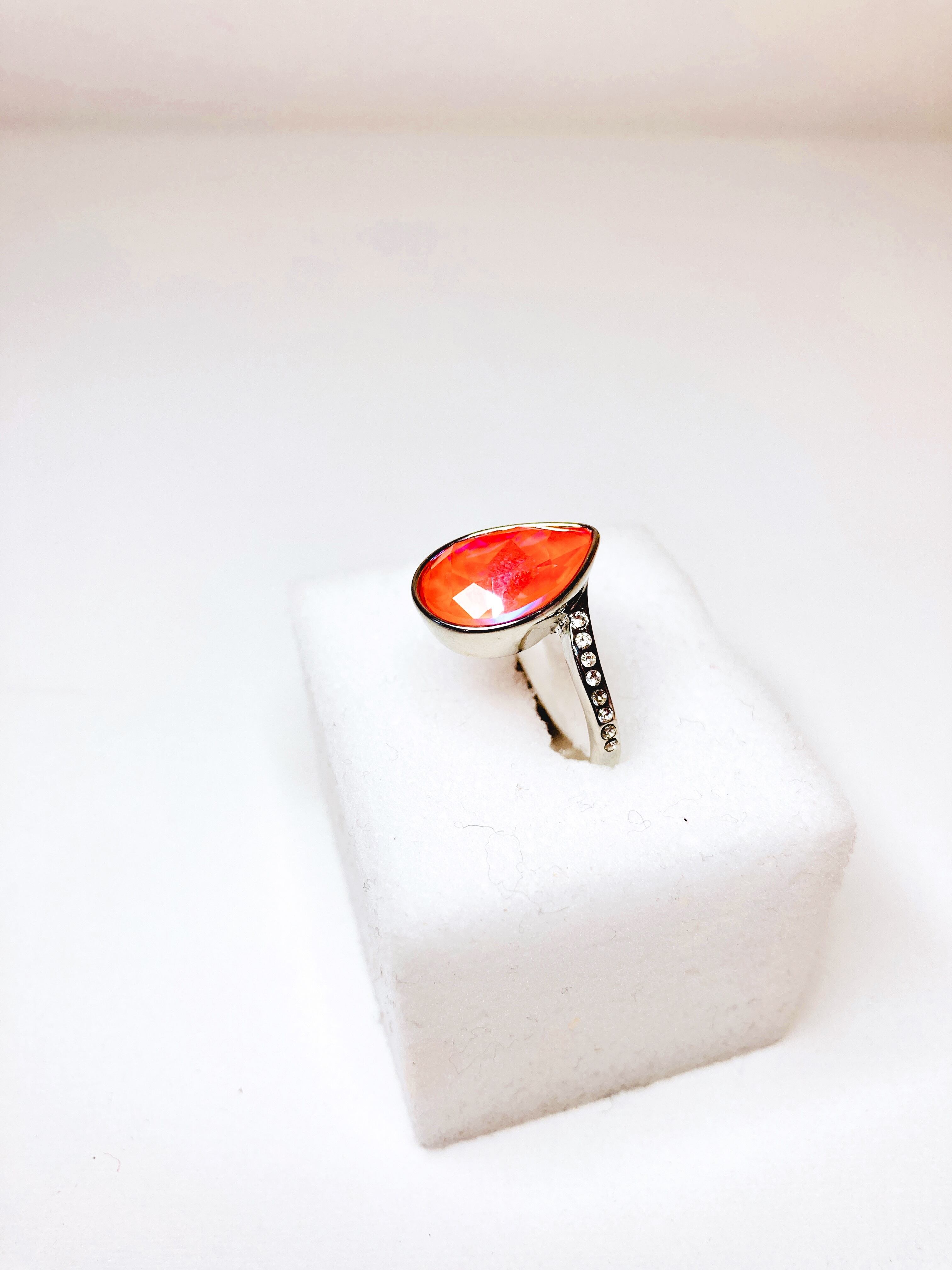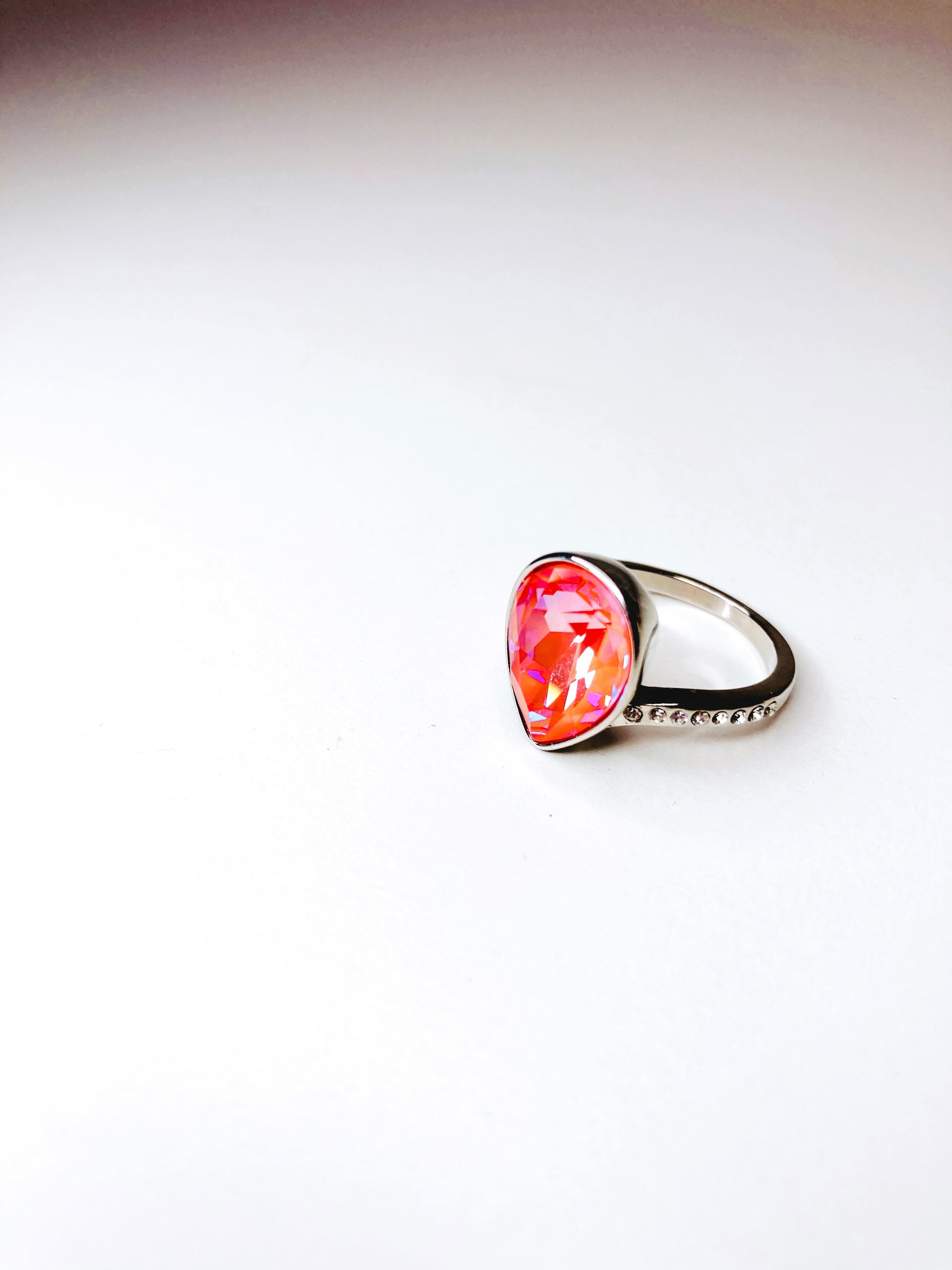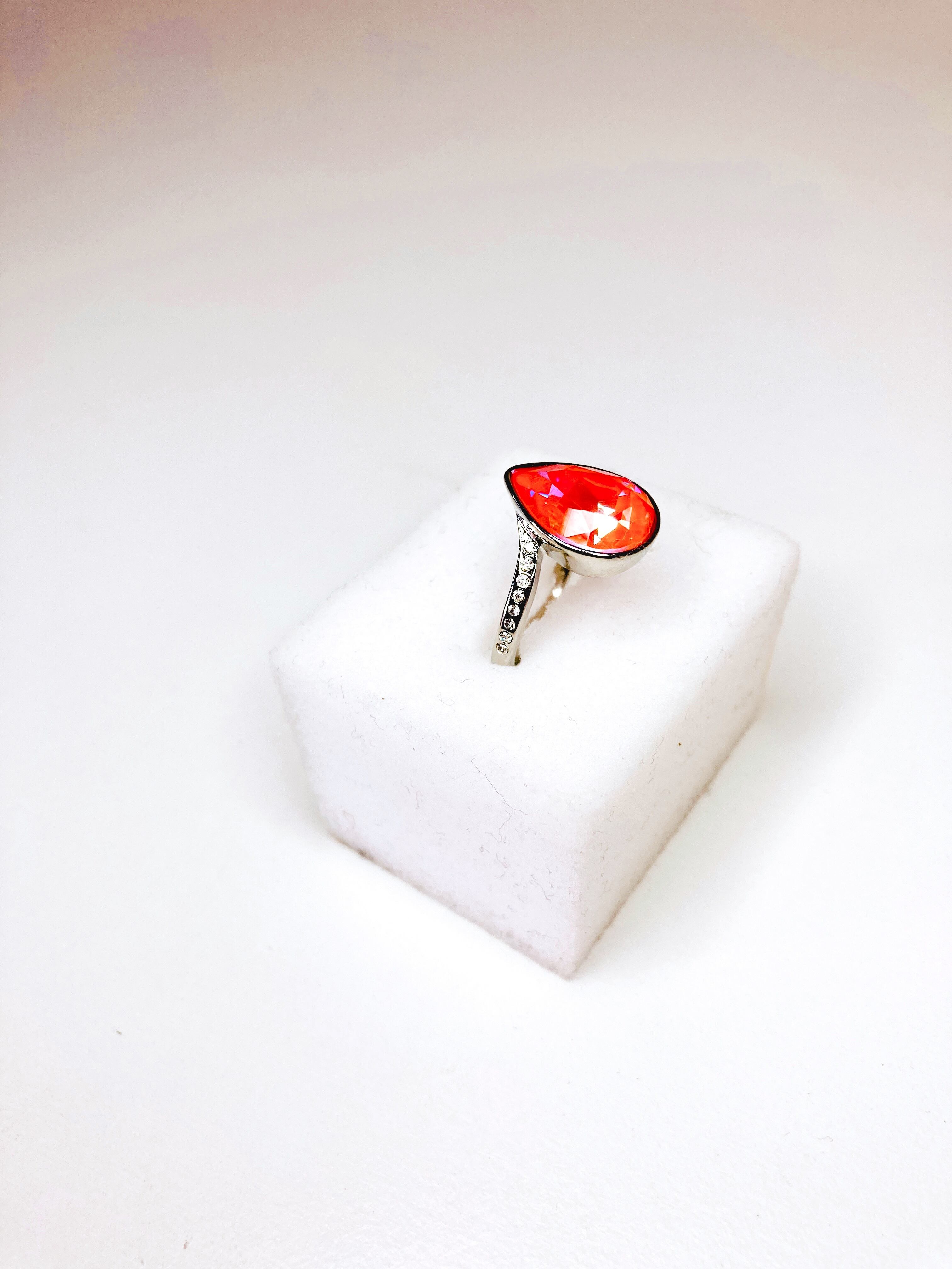 中央に大粒なドロップのクリスタルを1粒と、リング台の両サイドに小さなクリスタルを8粒ずつあしらったとってもゴージャスなリングです。