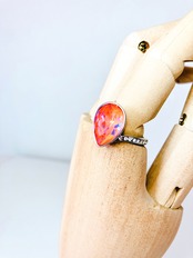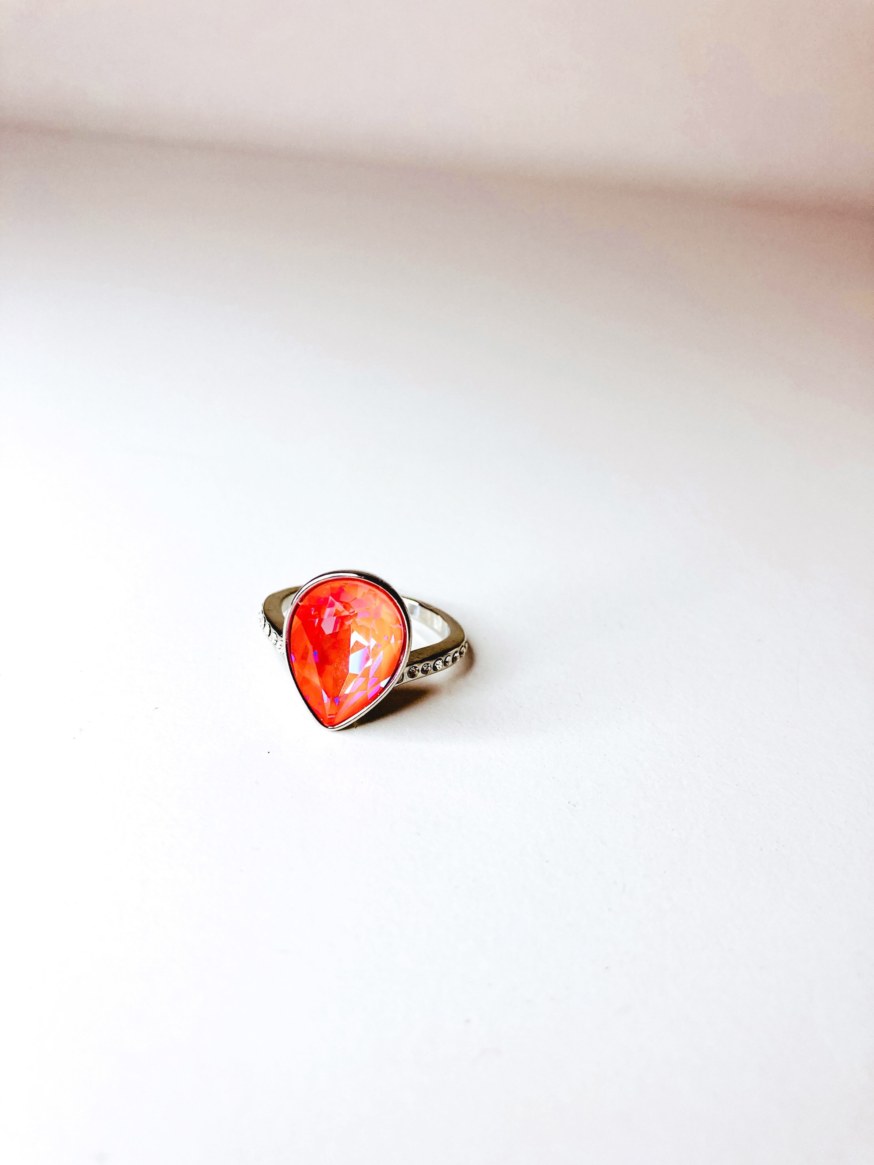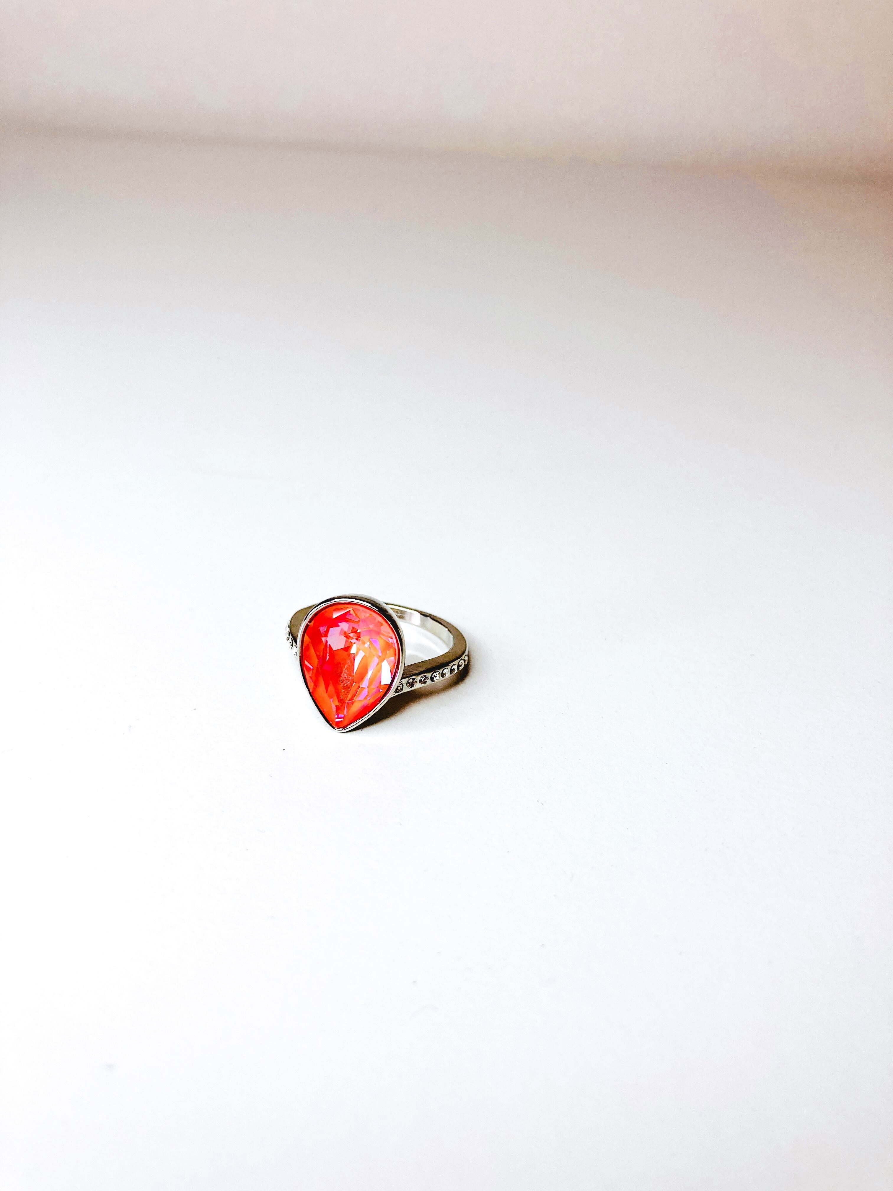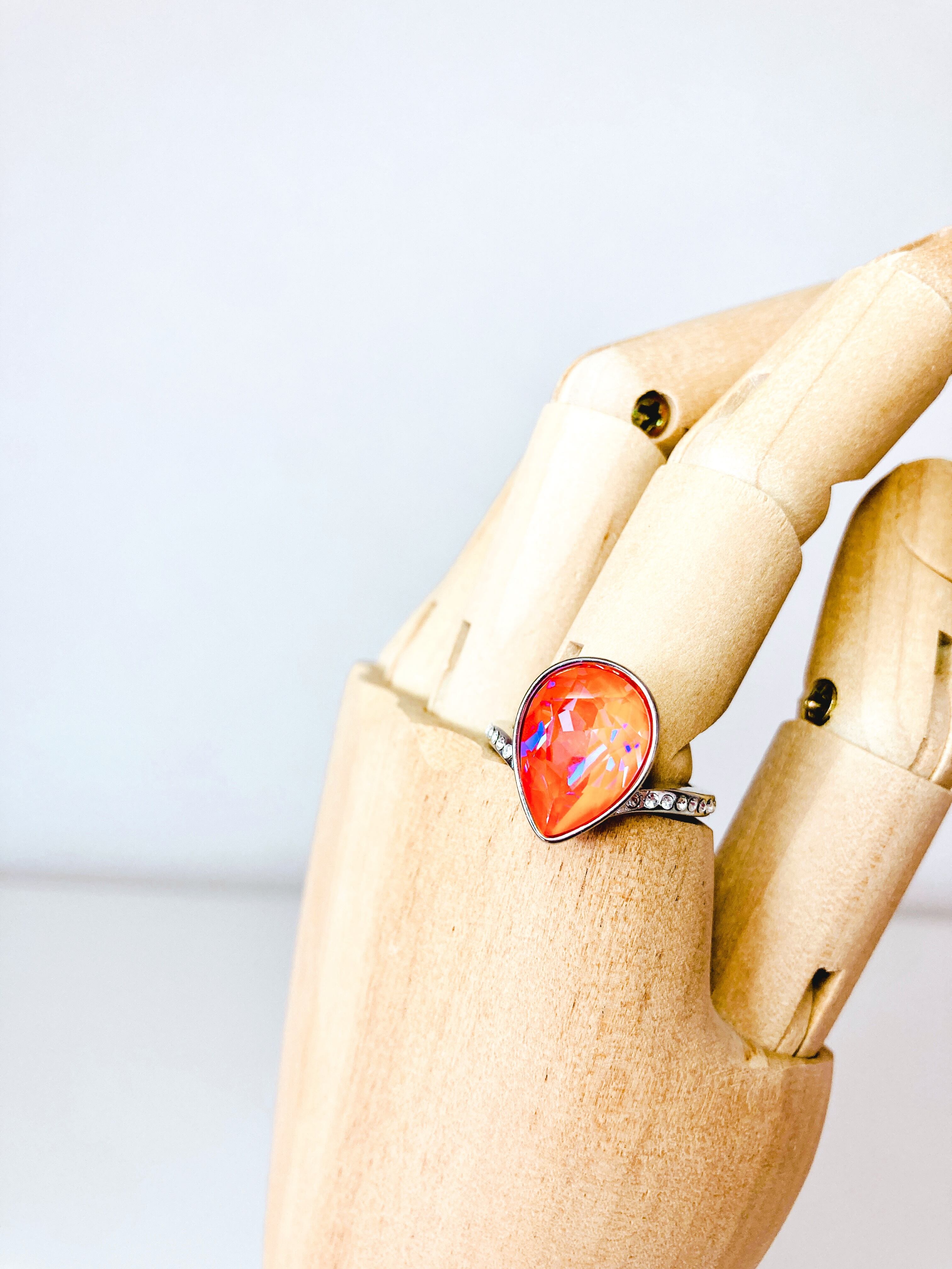 中央に大粒なドロップのクリスタルを1粒と、リング台の両サイドに小さなクリスタルを8粒ずつあしらったとってもゴージャスなリングです。
