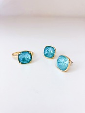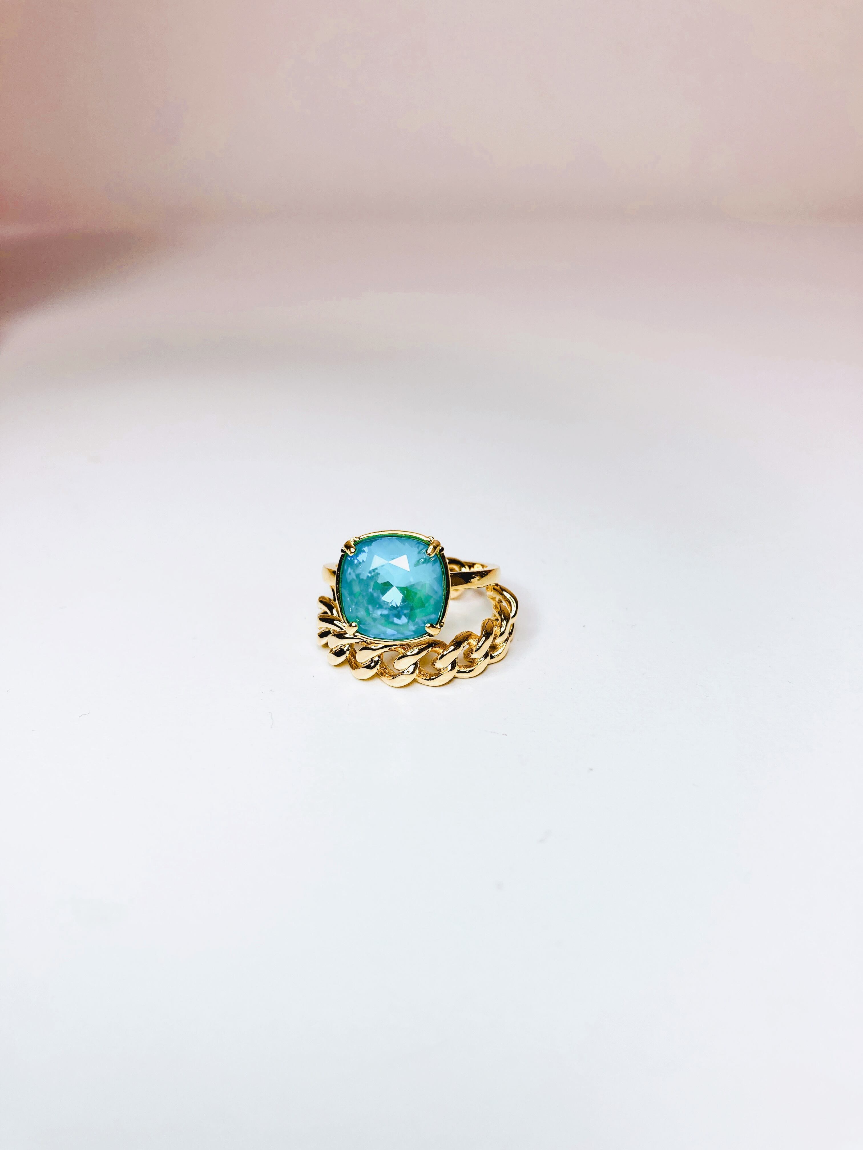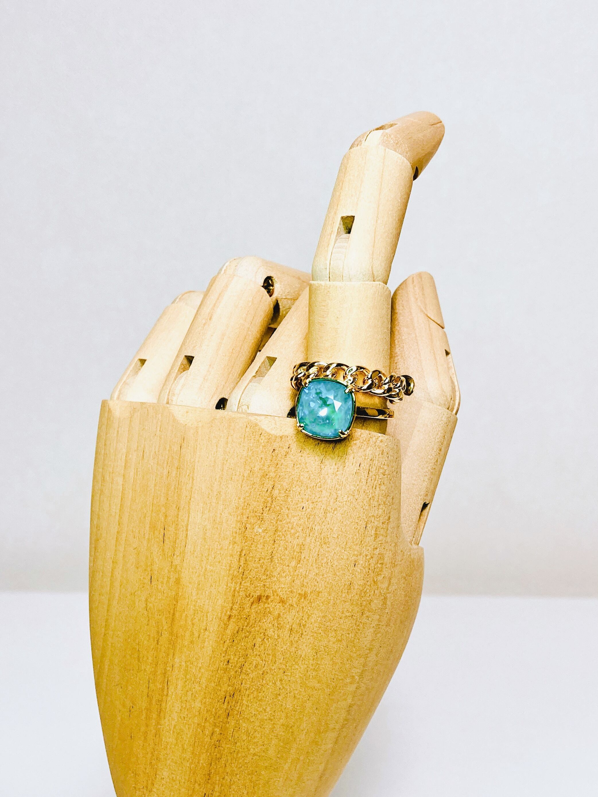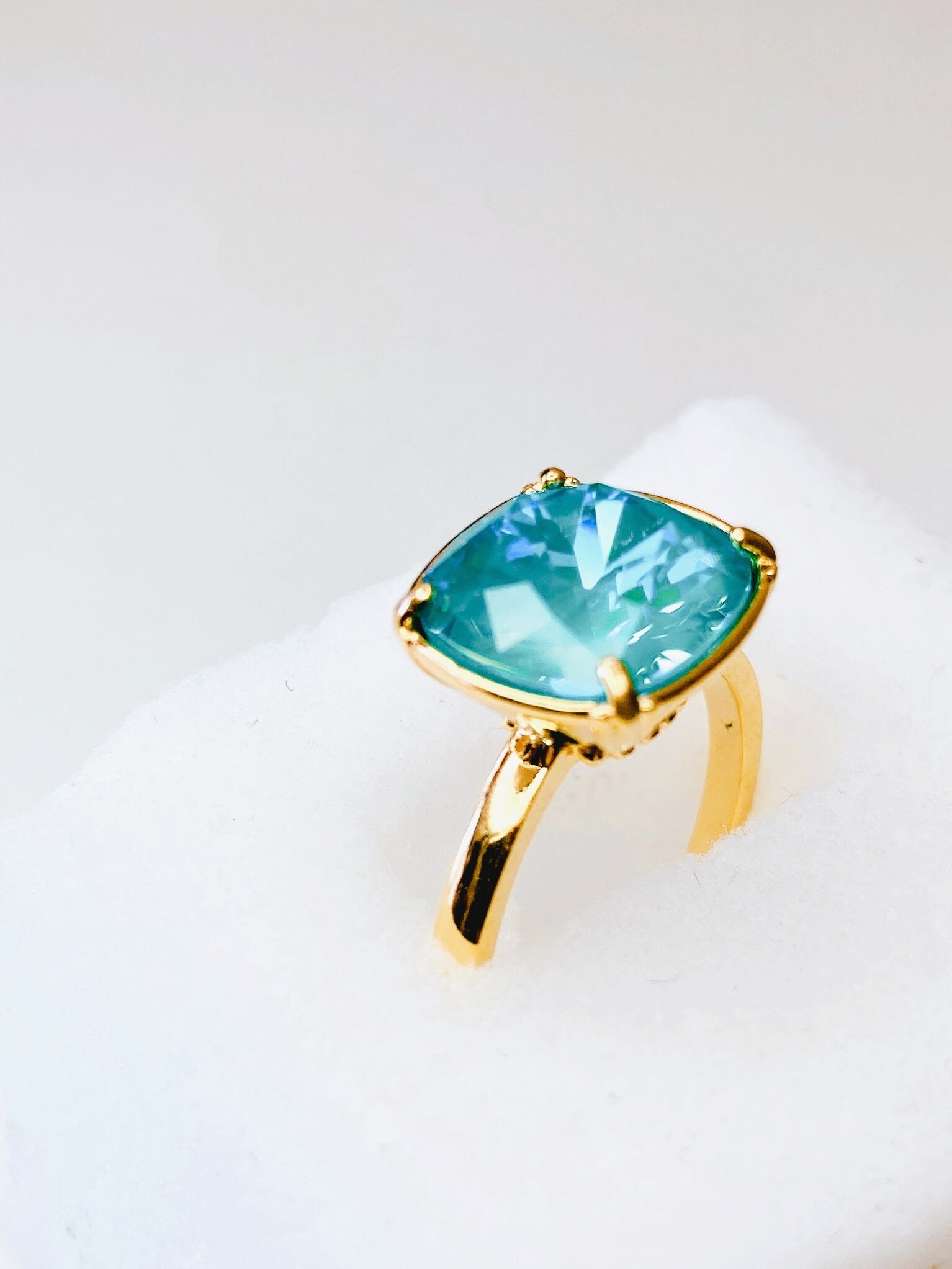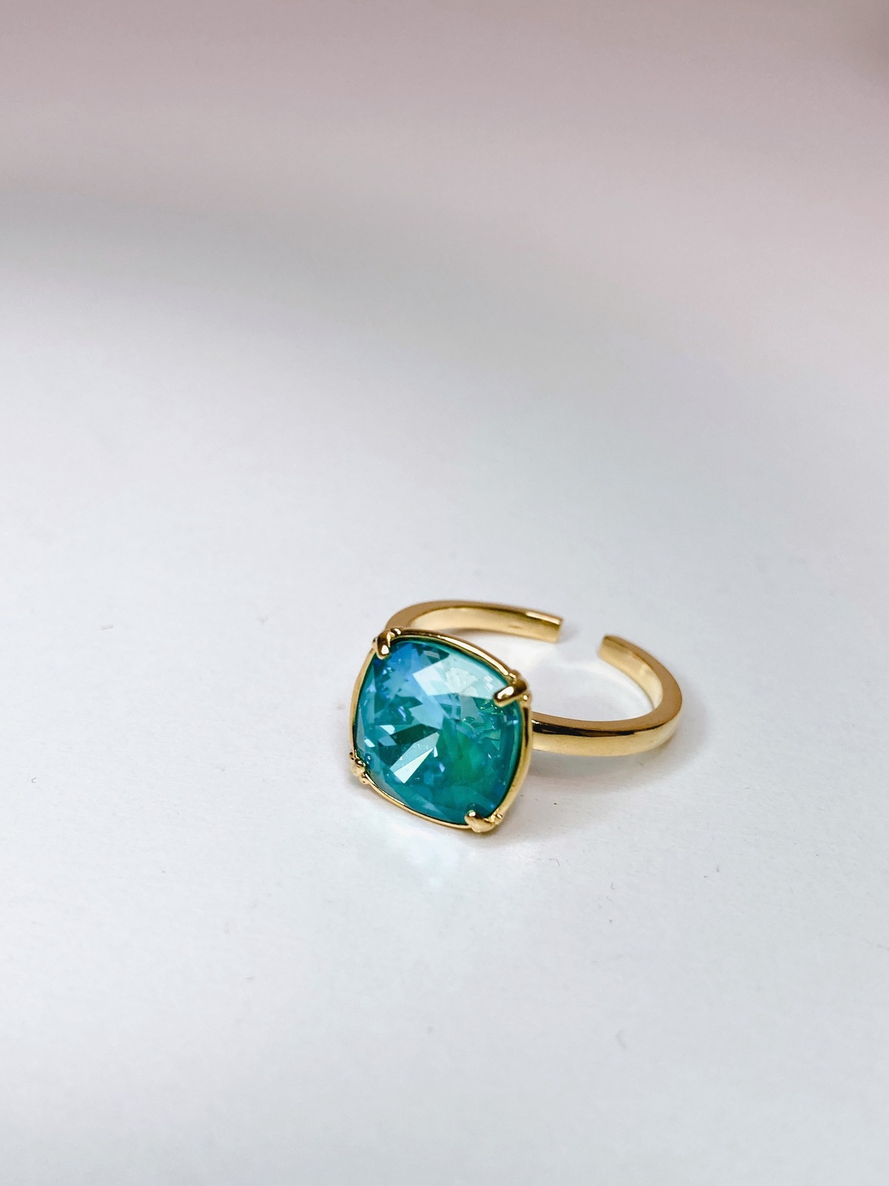 スクエアの大粒クリスタルを台座に乗せたリングです。