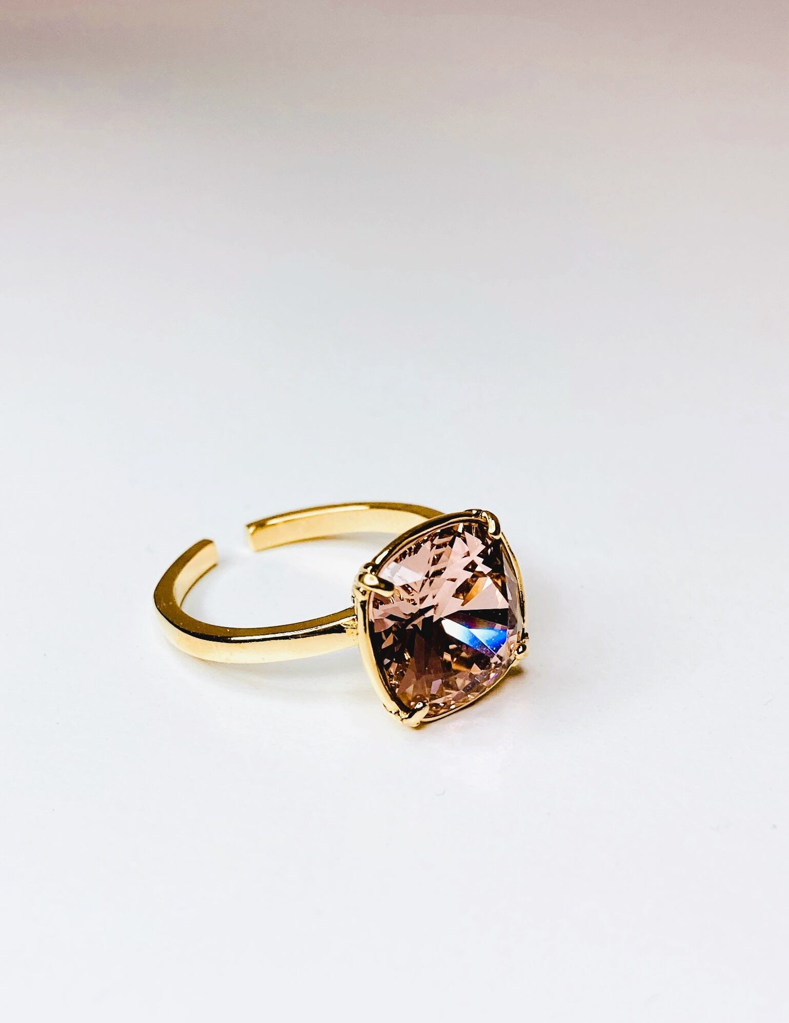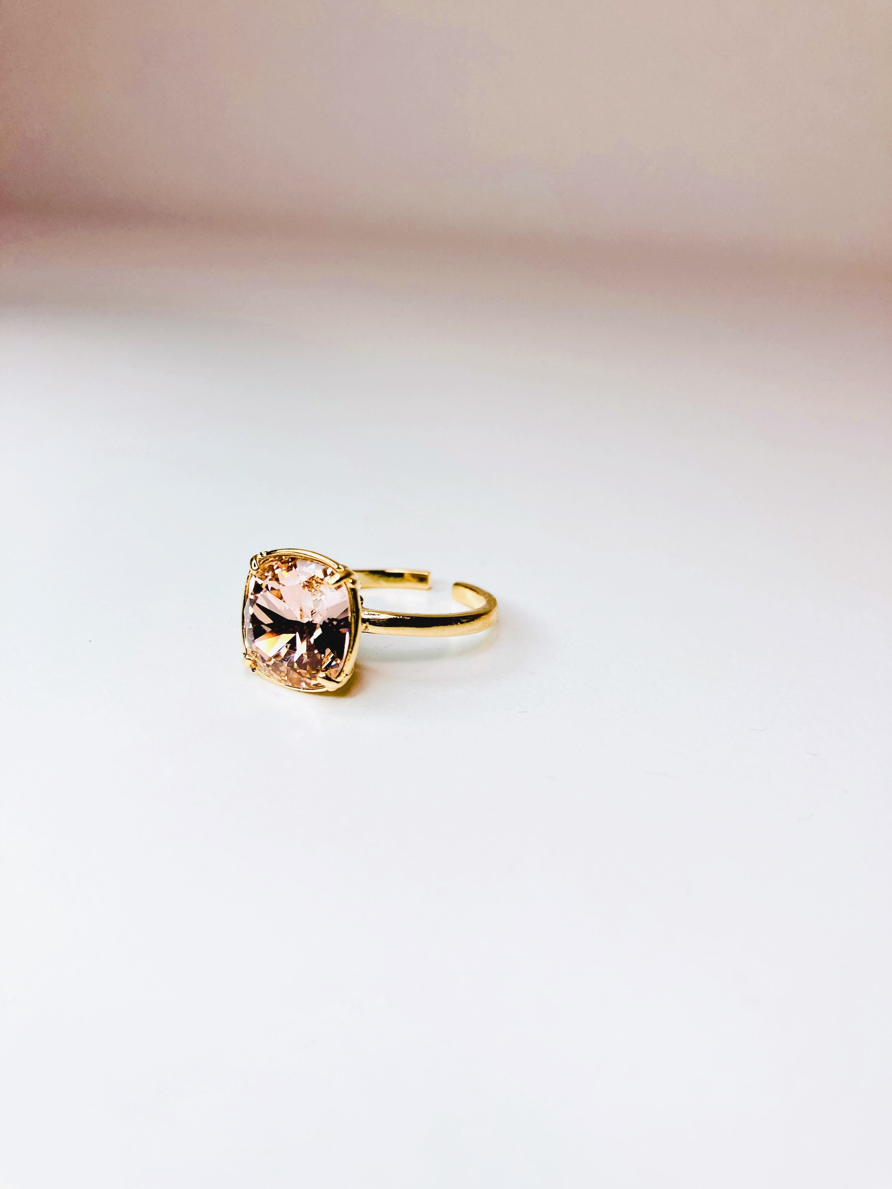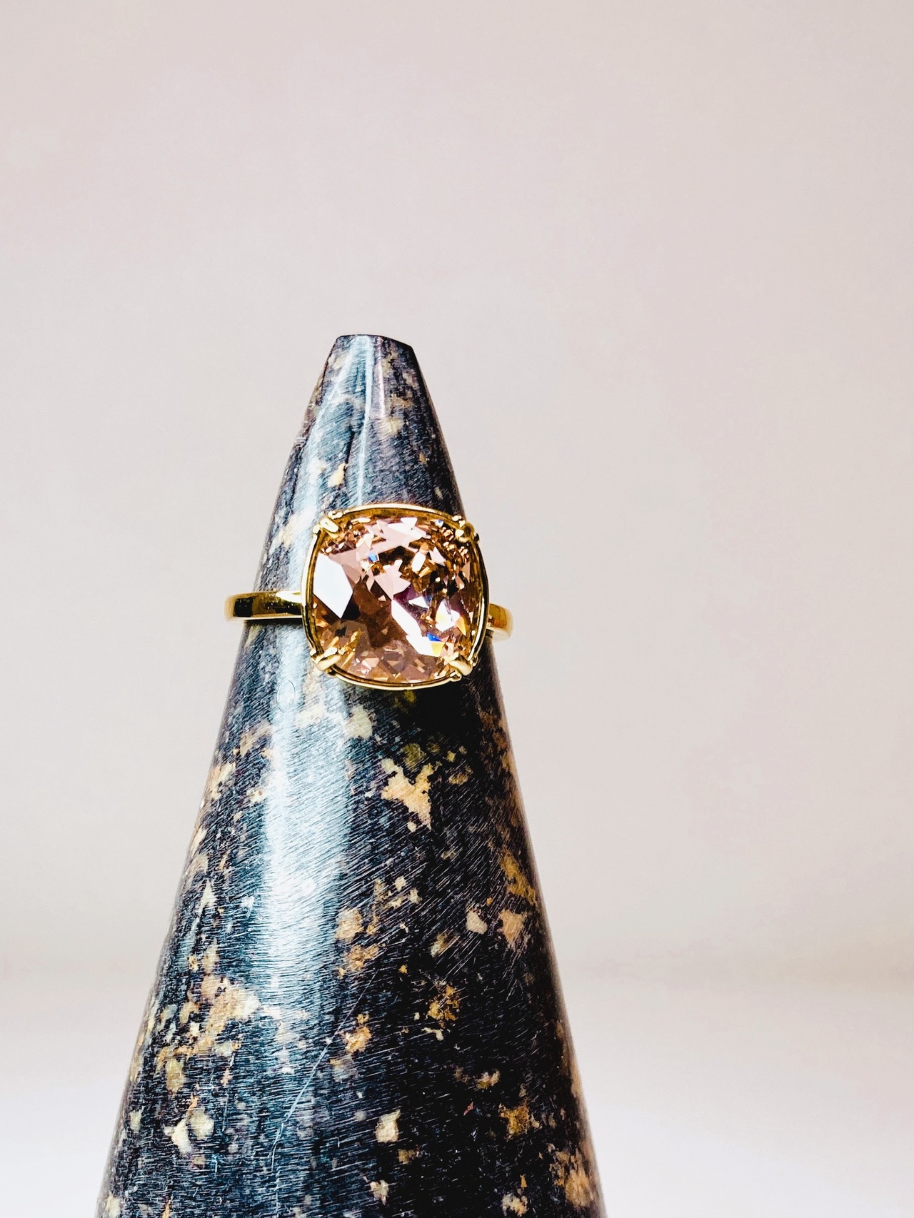 スクエアの大粒クリスタルを台座に乗せたリングです。