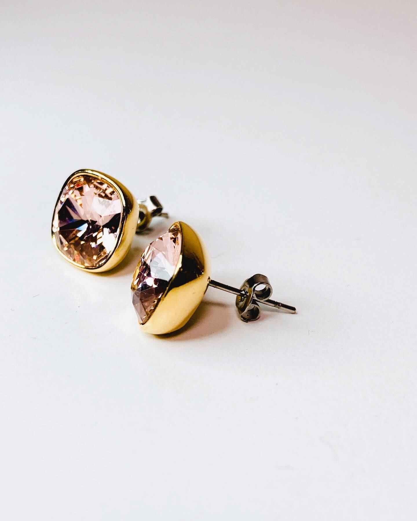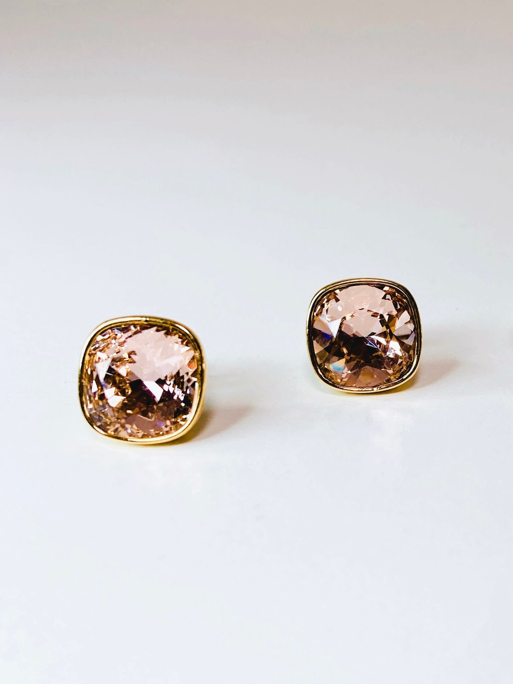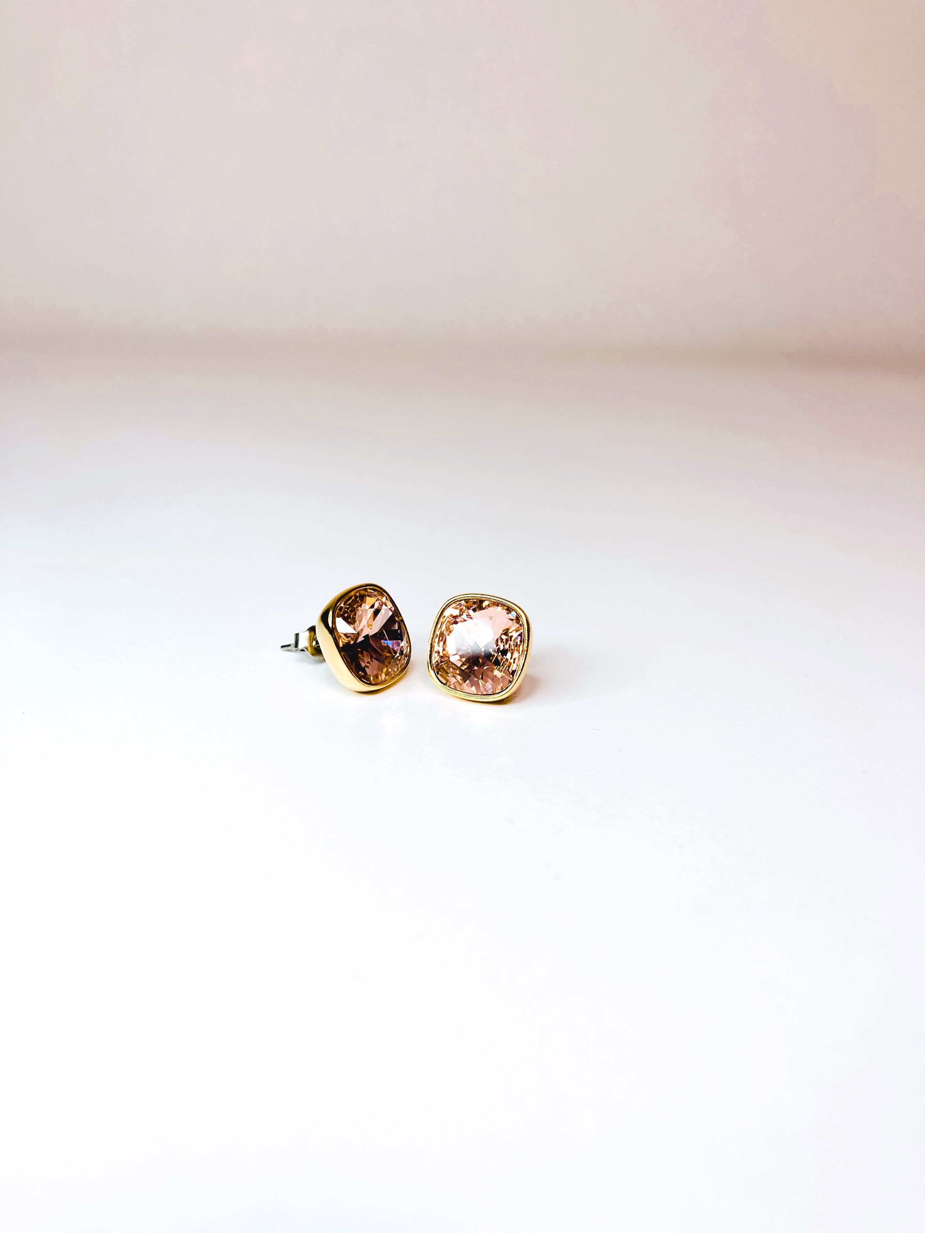 スクエアの大粒クリスタルを台座に乗せたピアスです。