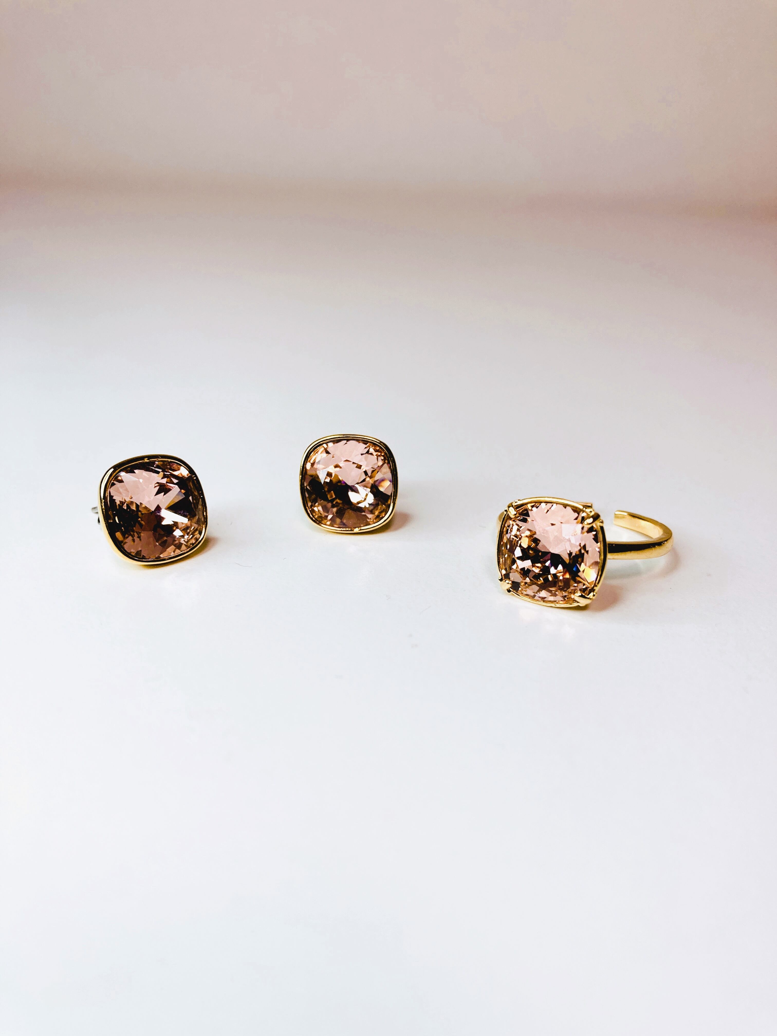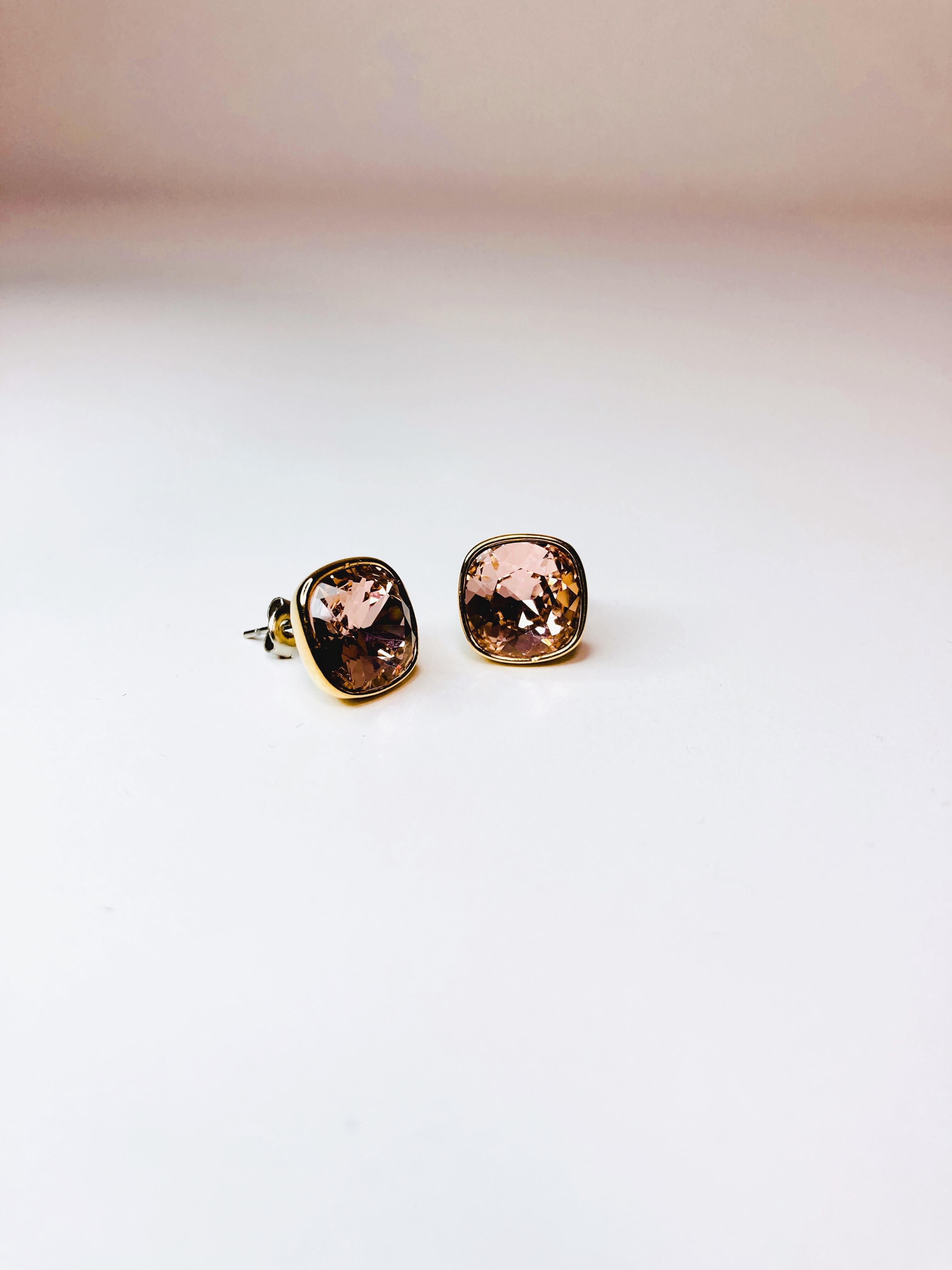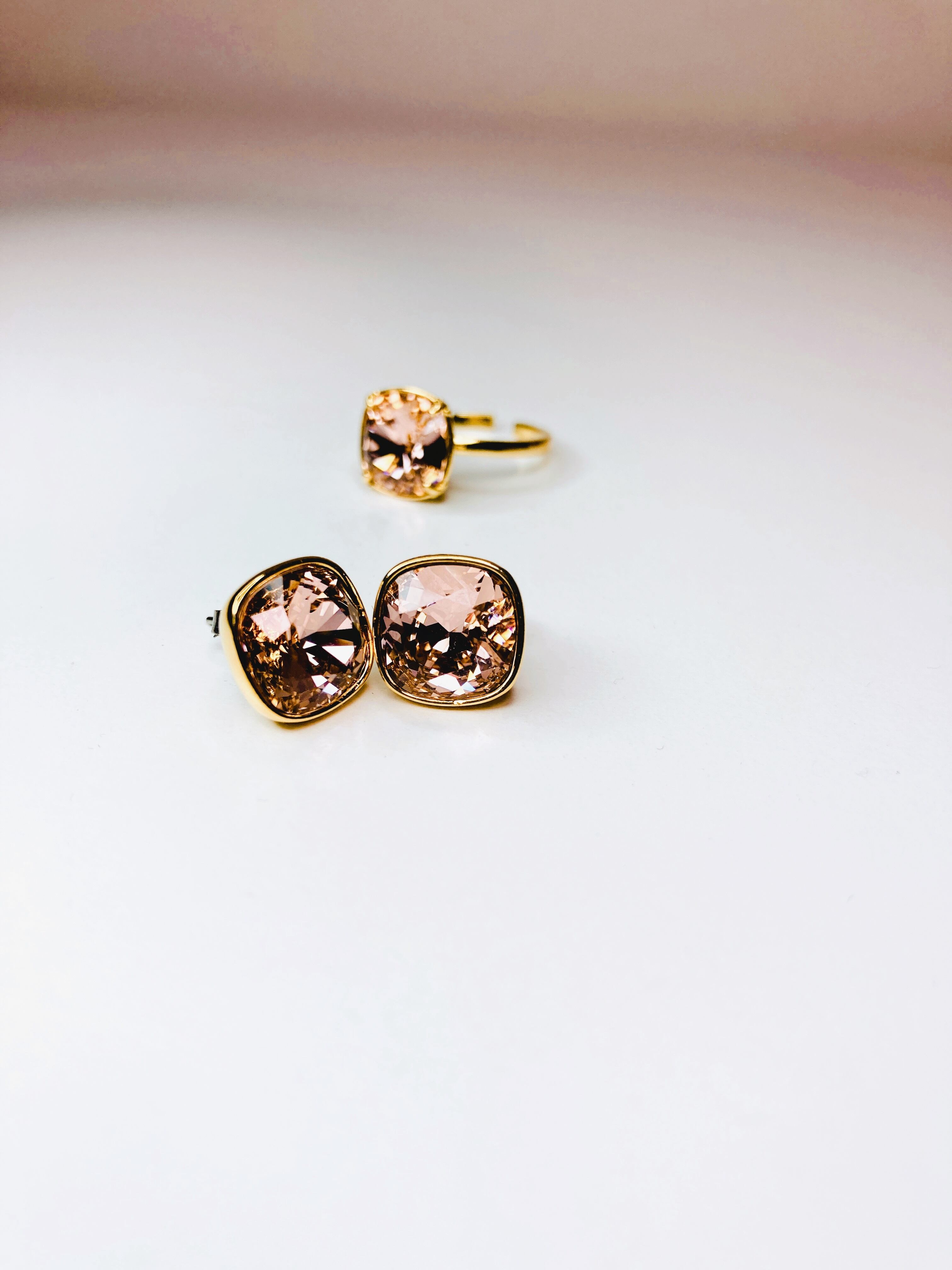 スクエアの大粒クリスタルを台座に乗せたピアスです。