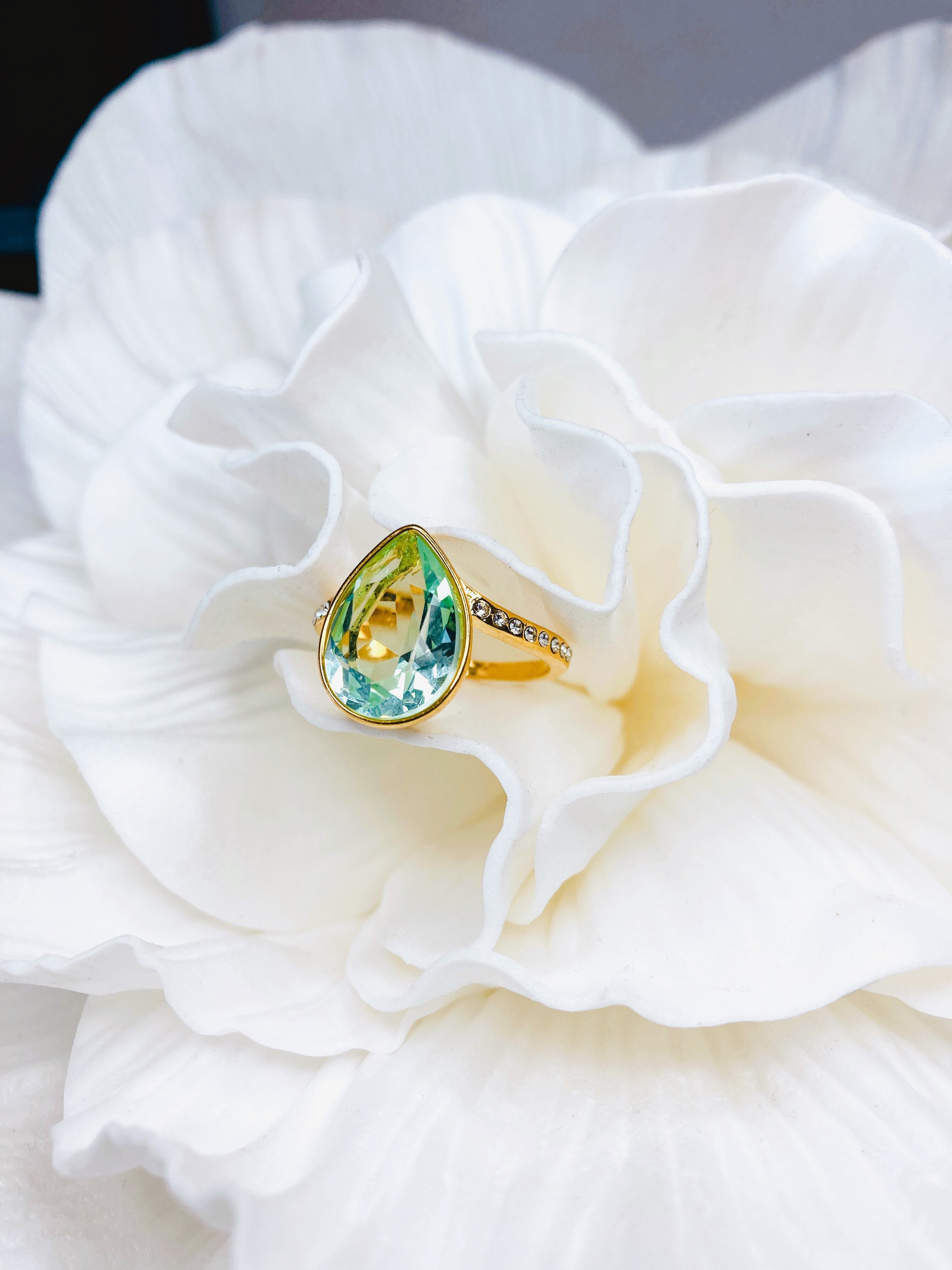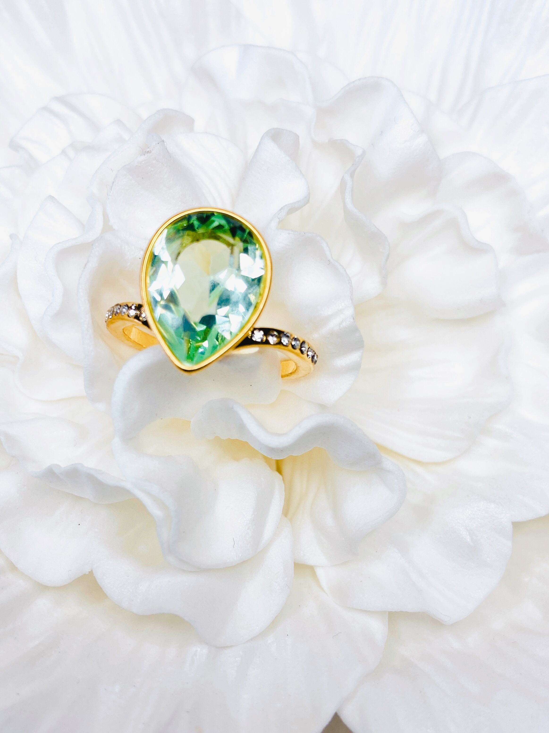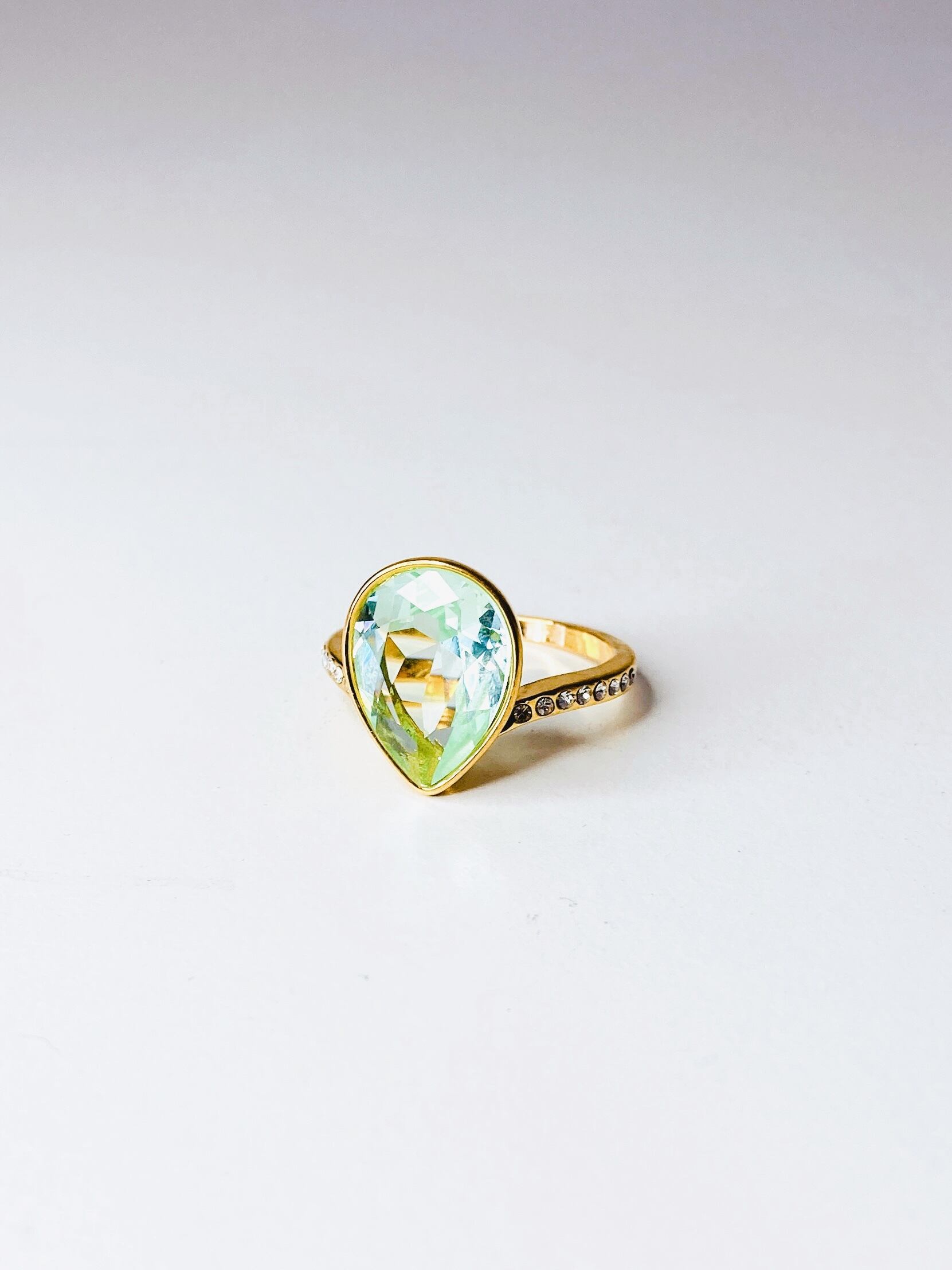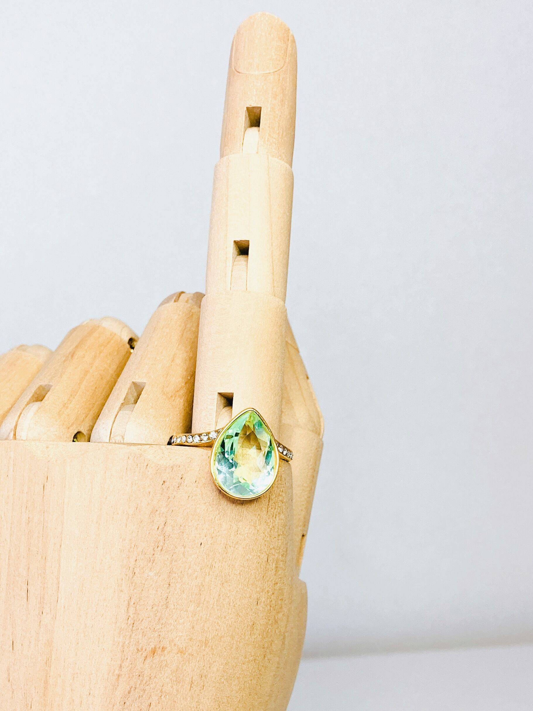 中央に大粒なドロップのクリスタルを1粒と、リング台の両サイドに小さなクリスタルを8粒ずつあしらった