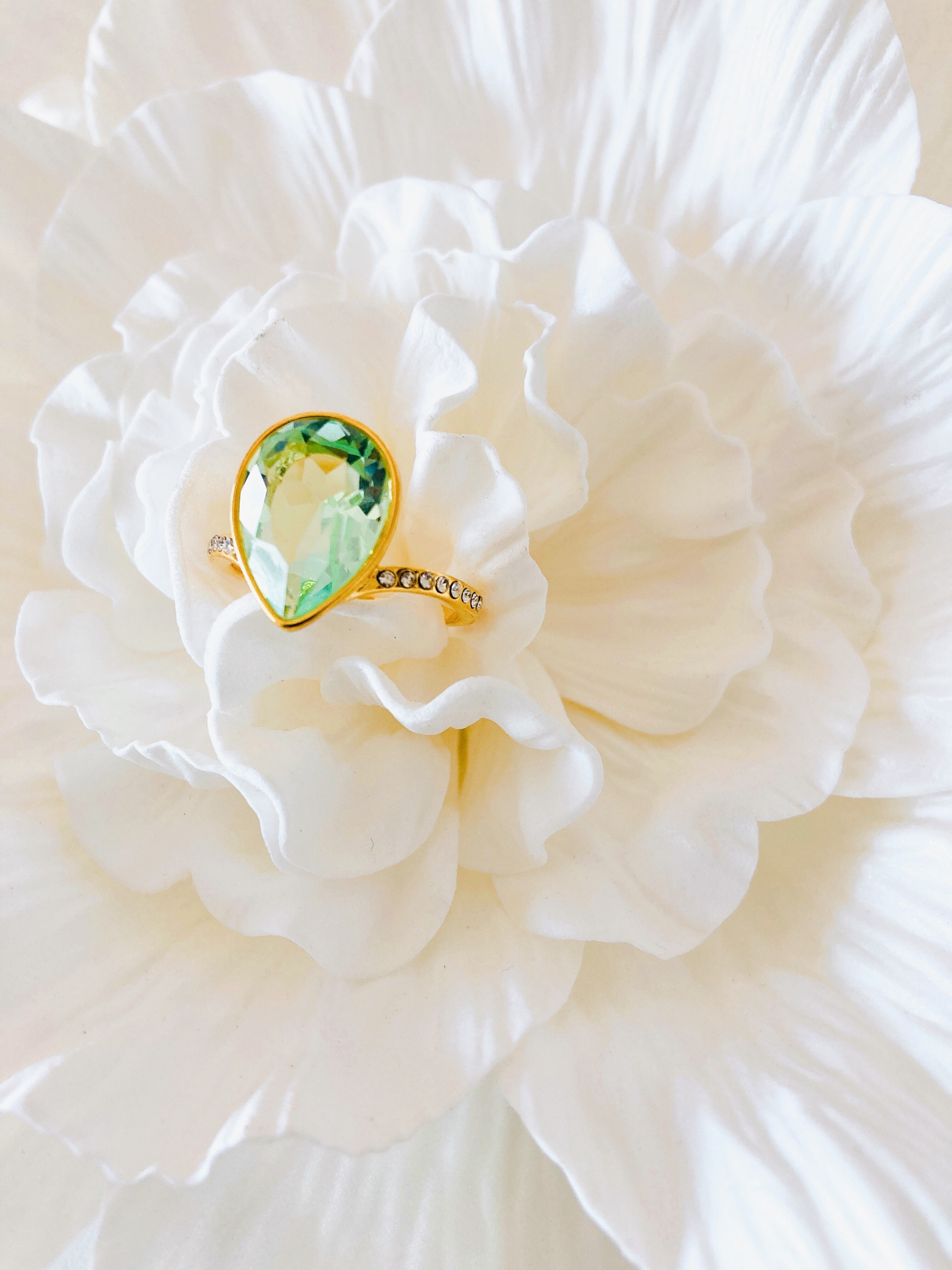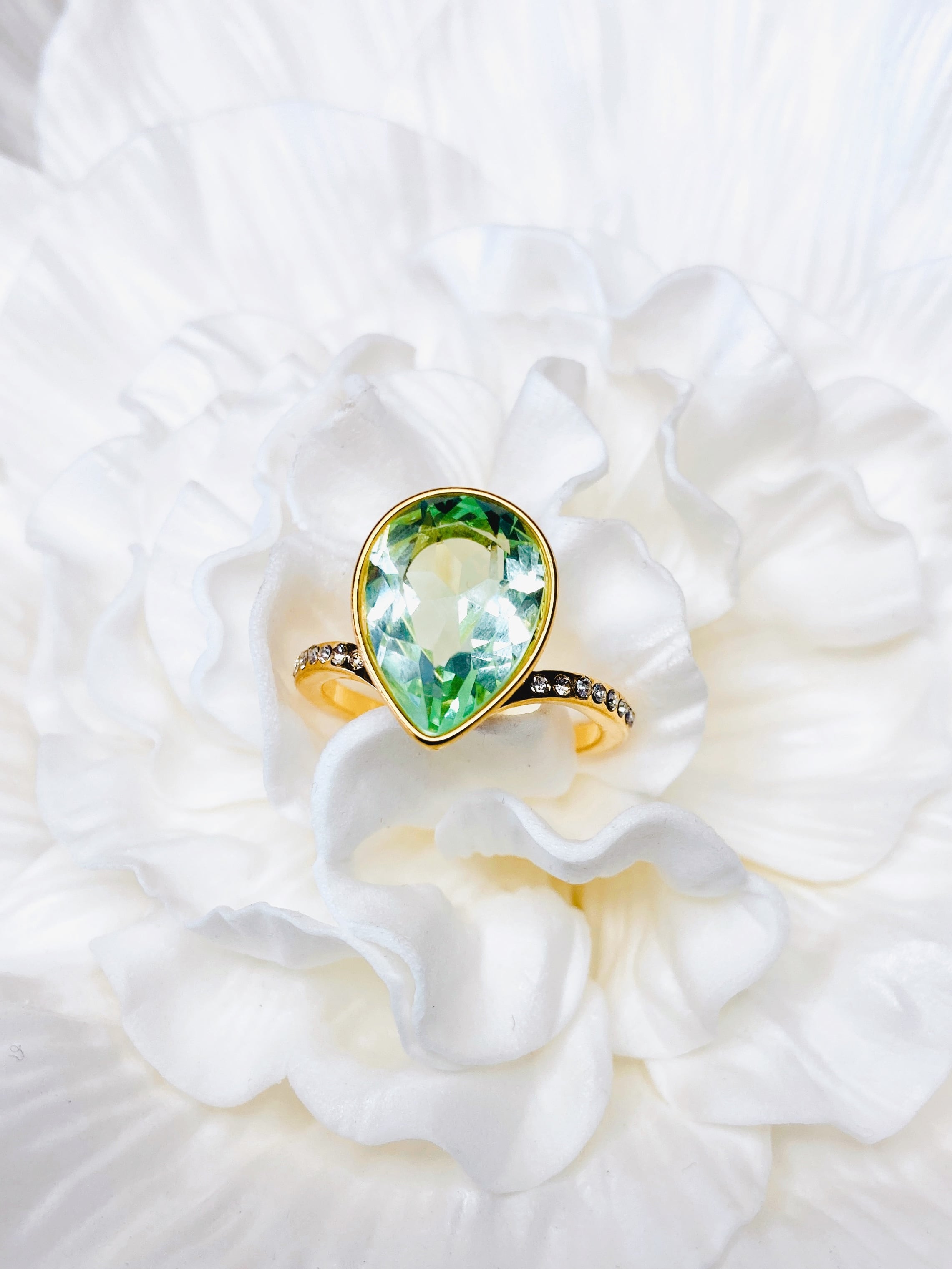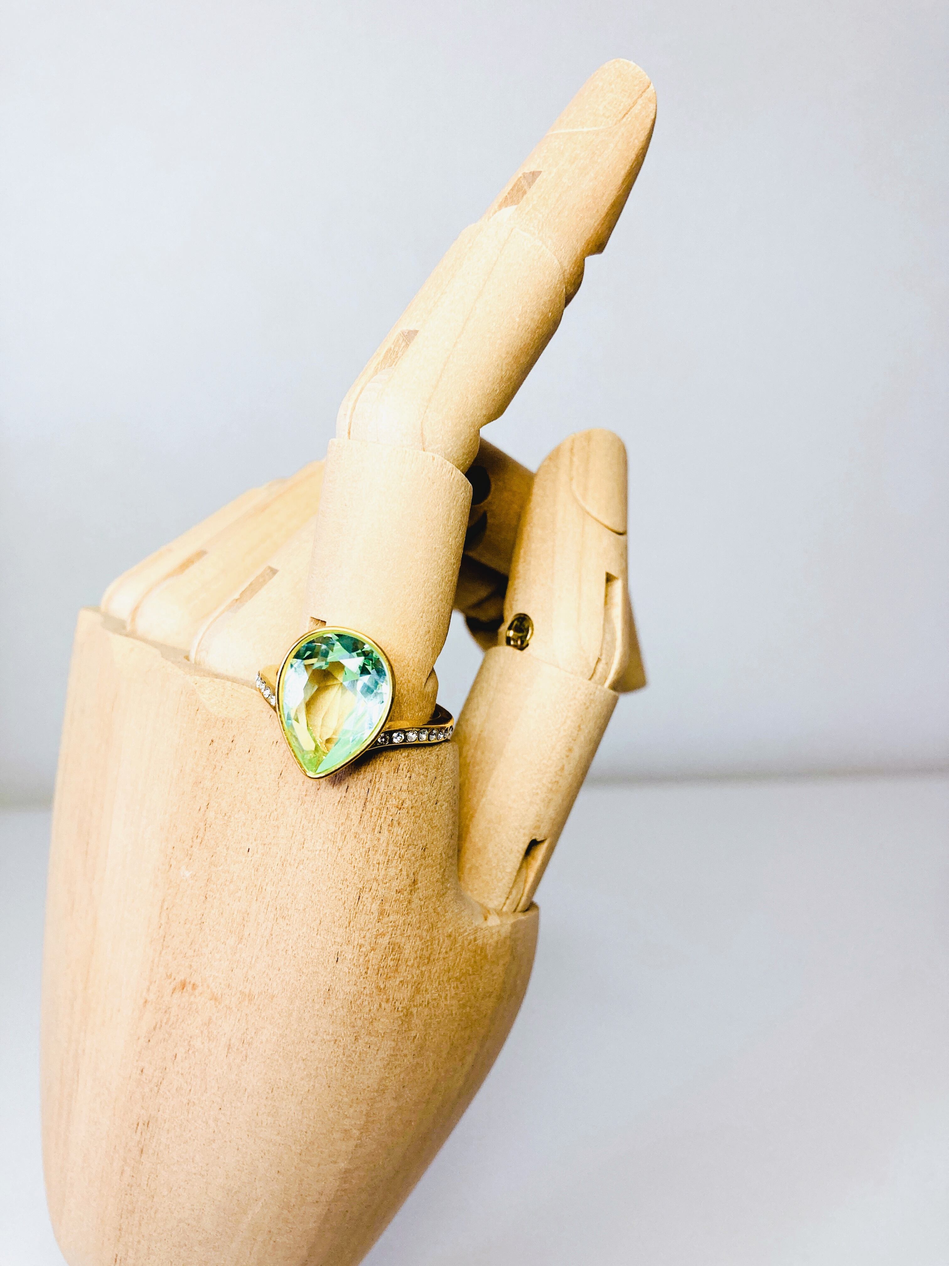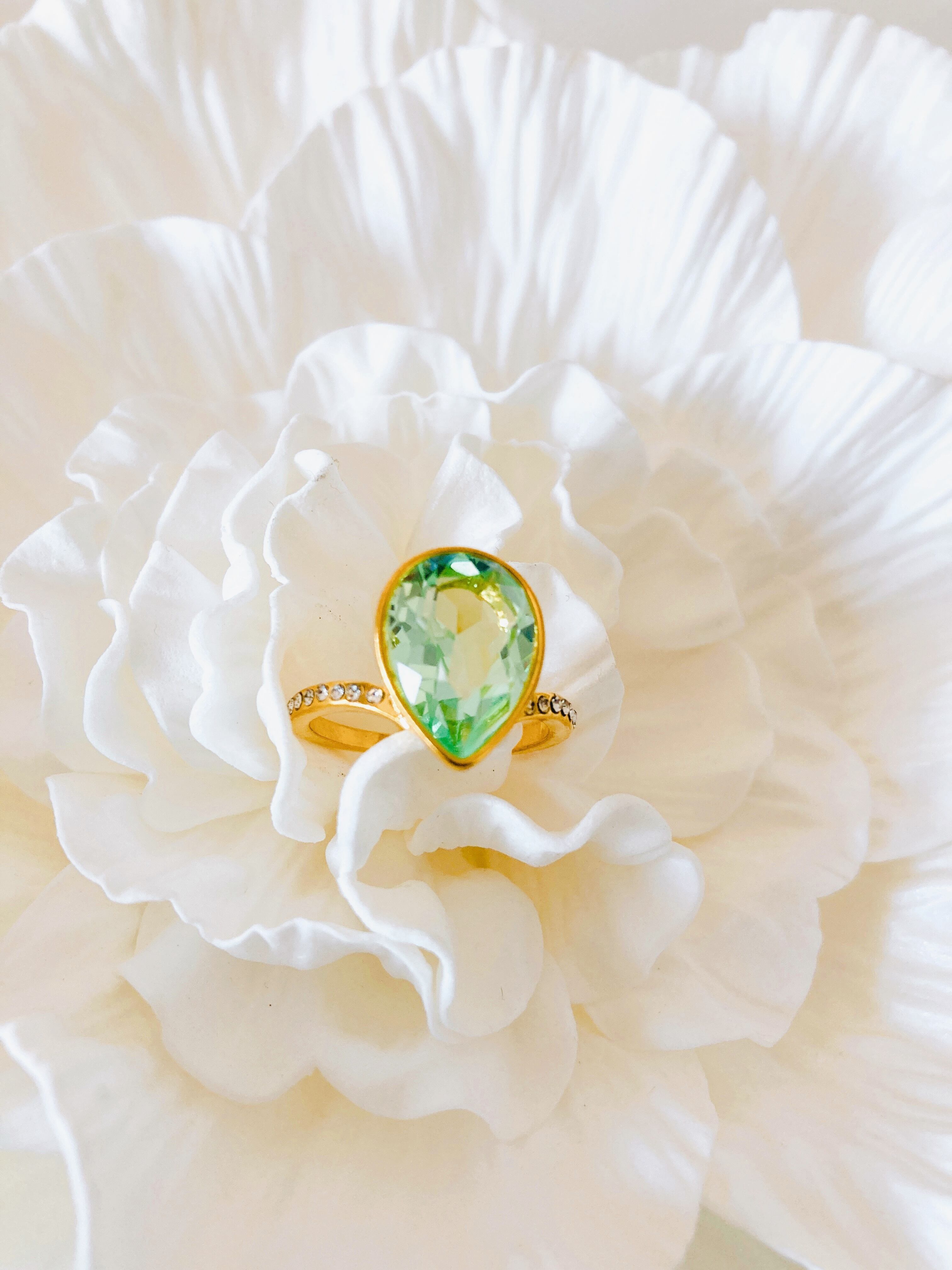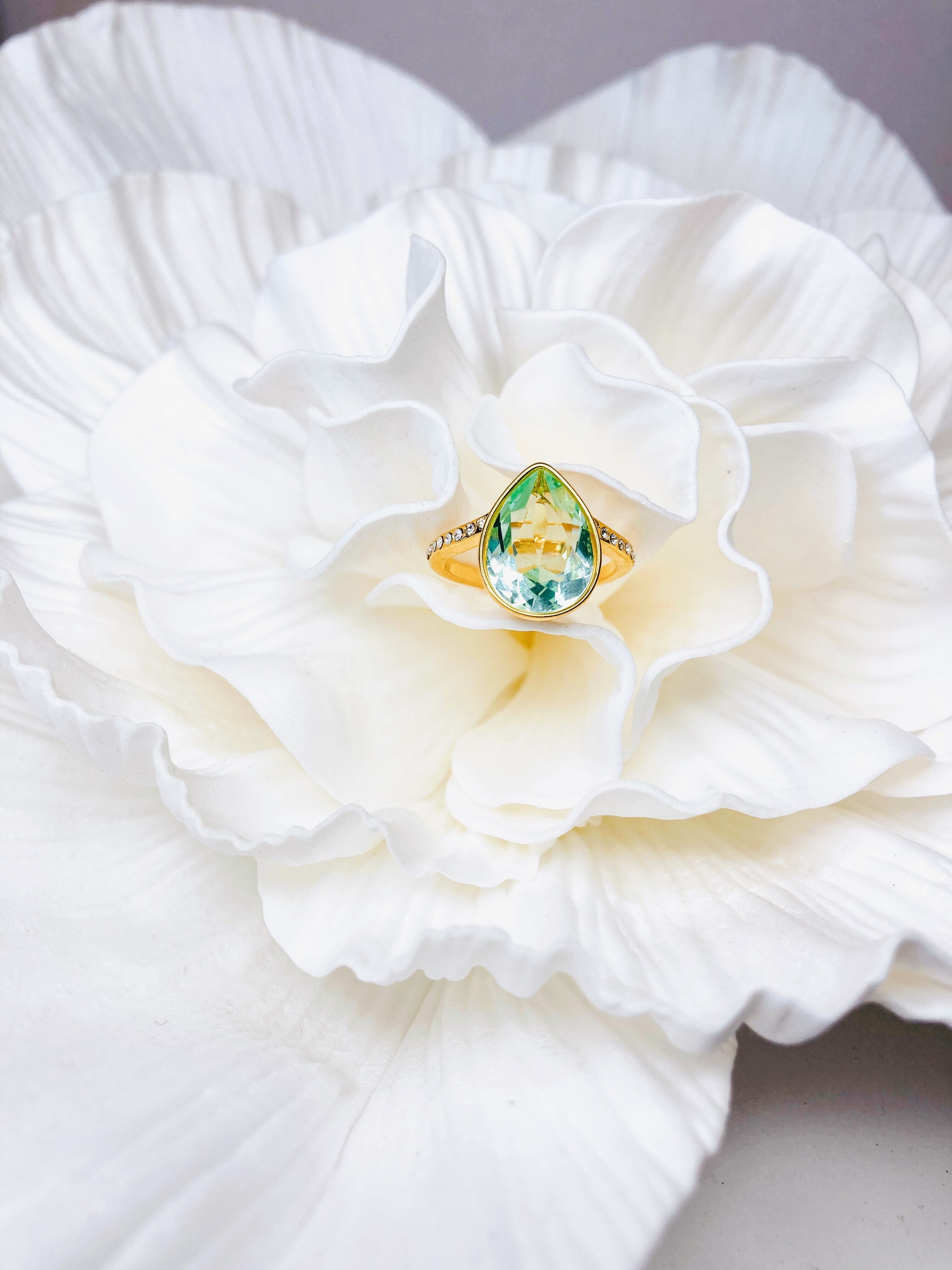 中央に大粒なドロップのクリスタルを1粒と、リング台の両サイドに小さなクリスタルを8粒ずつあしらった