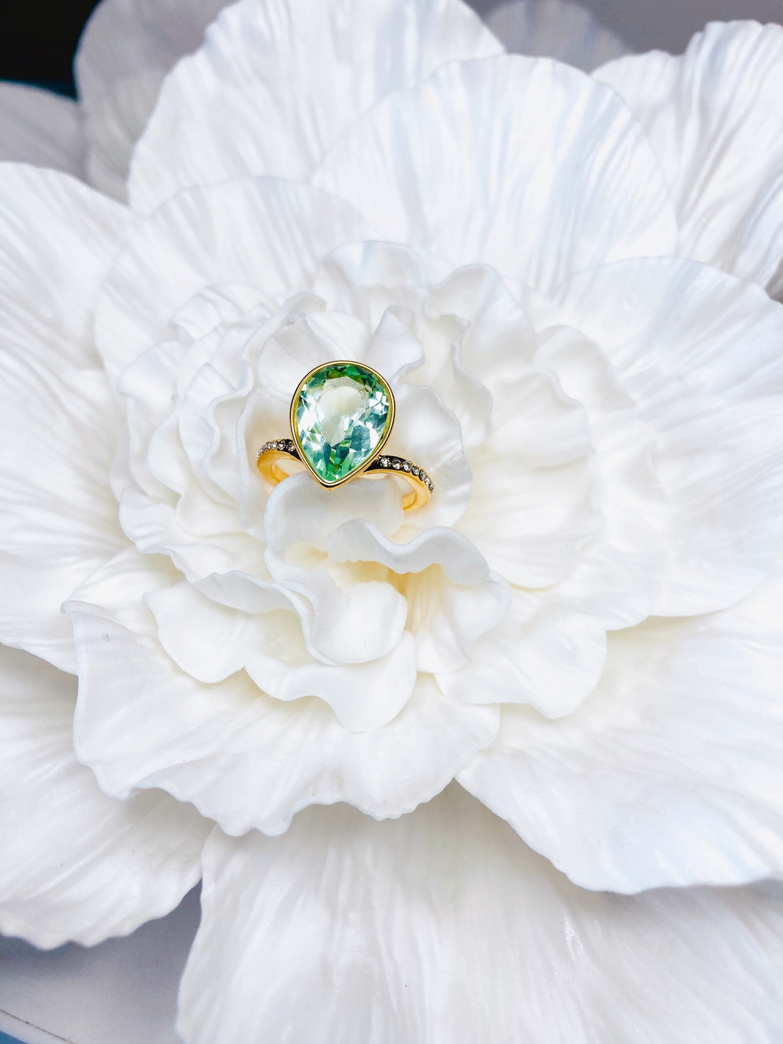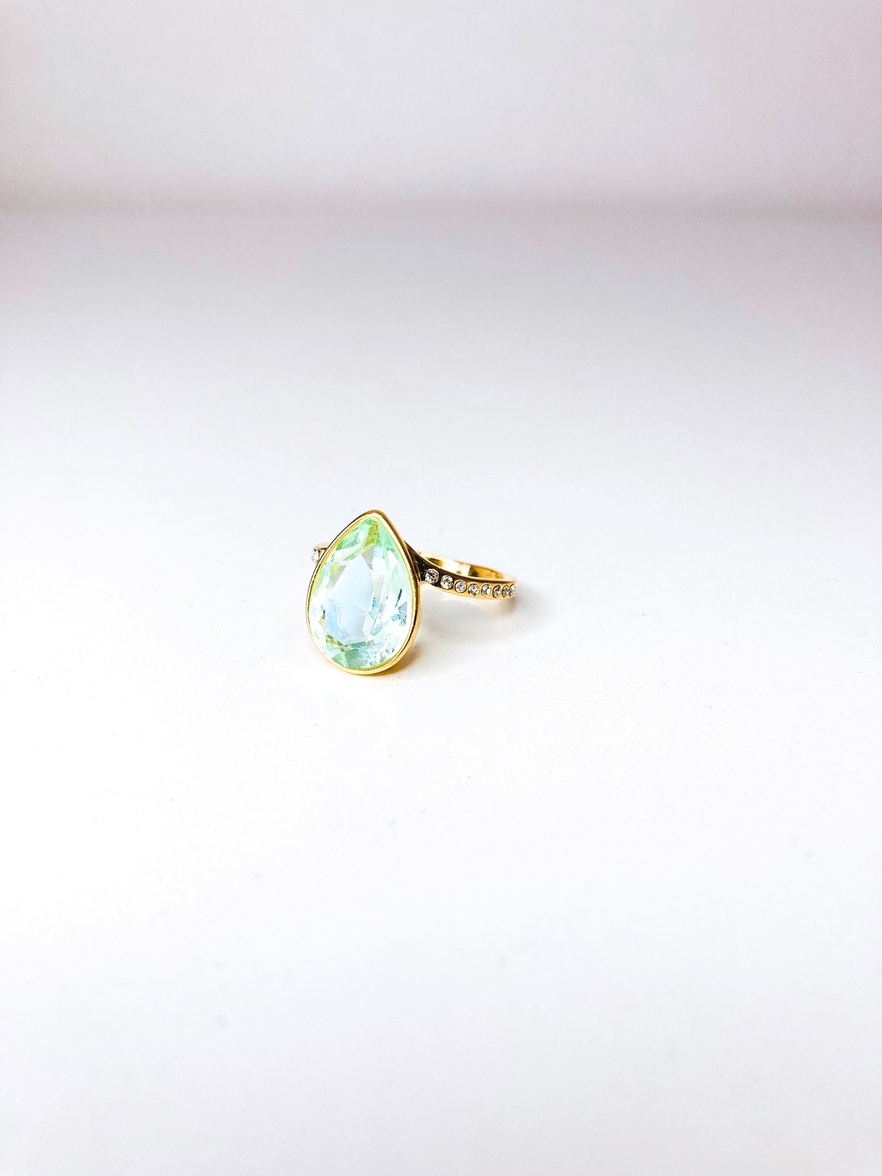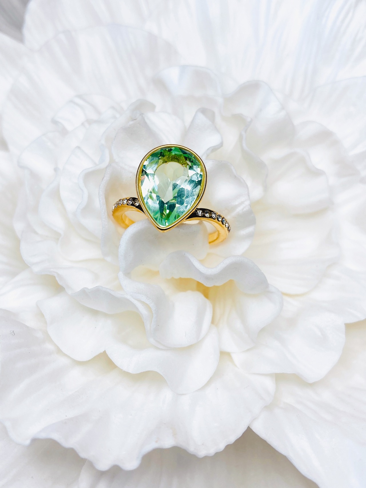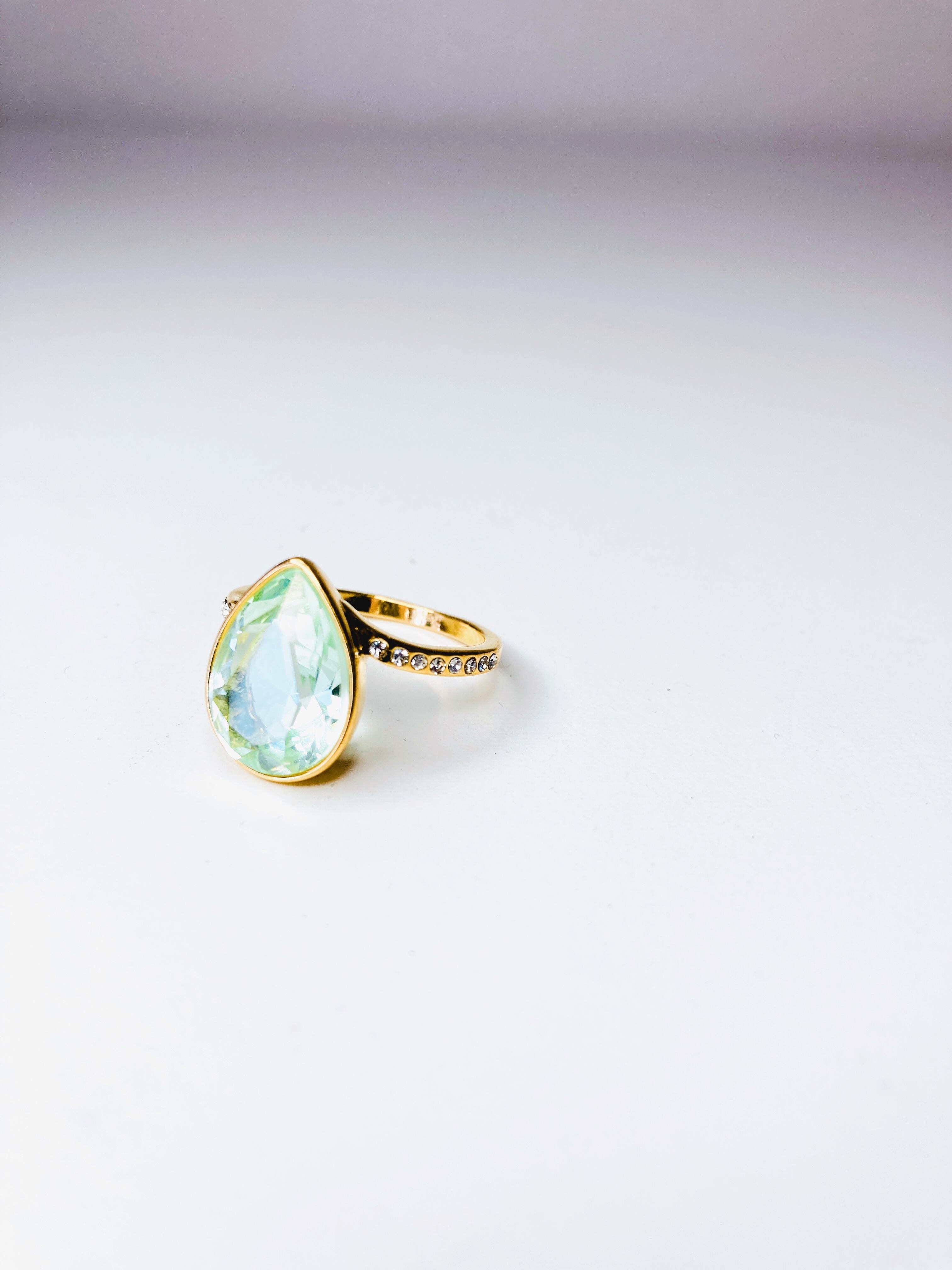 中央に大粒なドロップのクリスタルを1粒と、リング台の両サイドに小さなクリスタルを8粒ずつあしらった