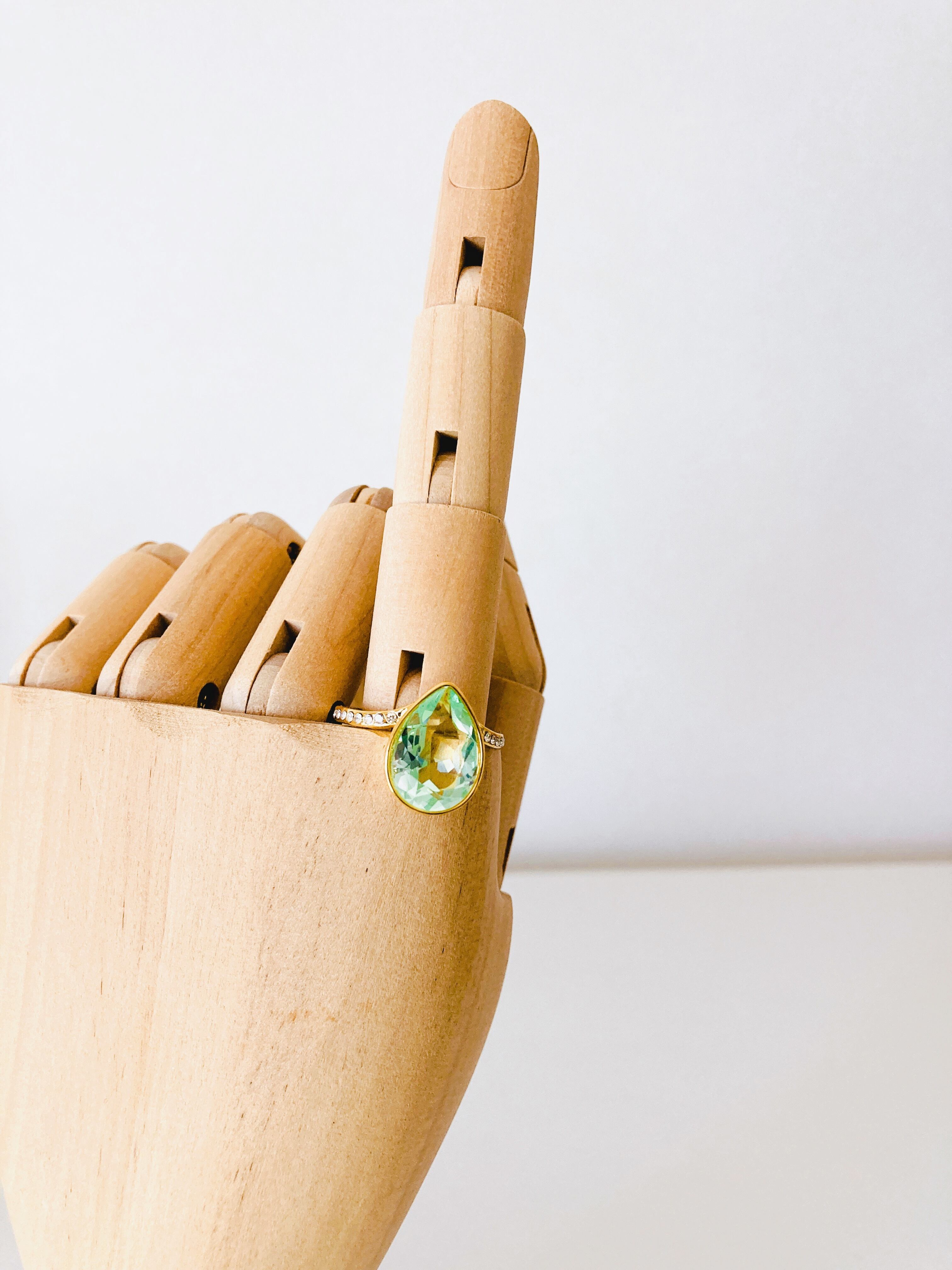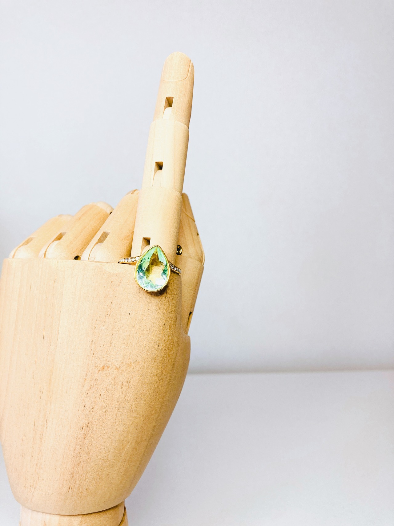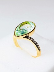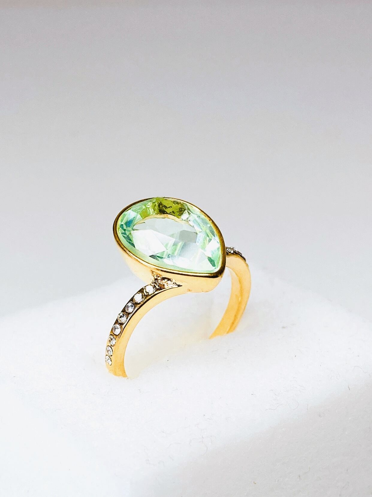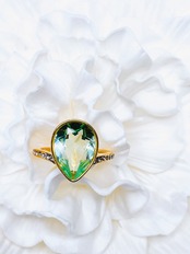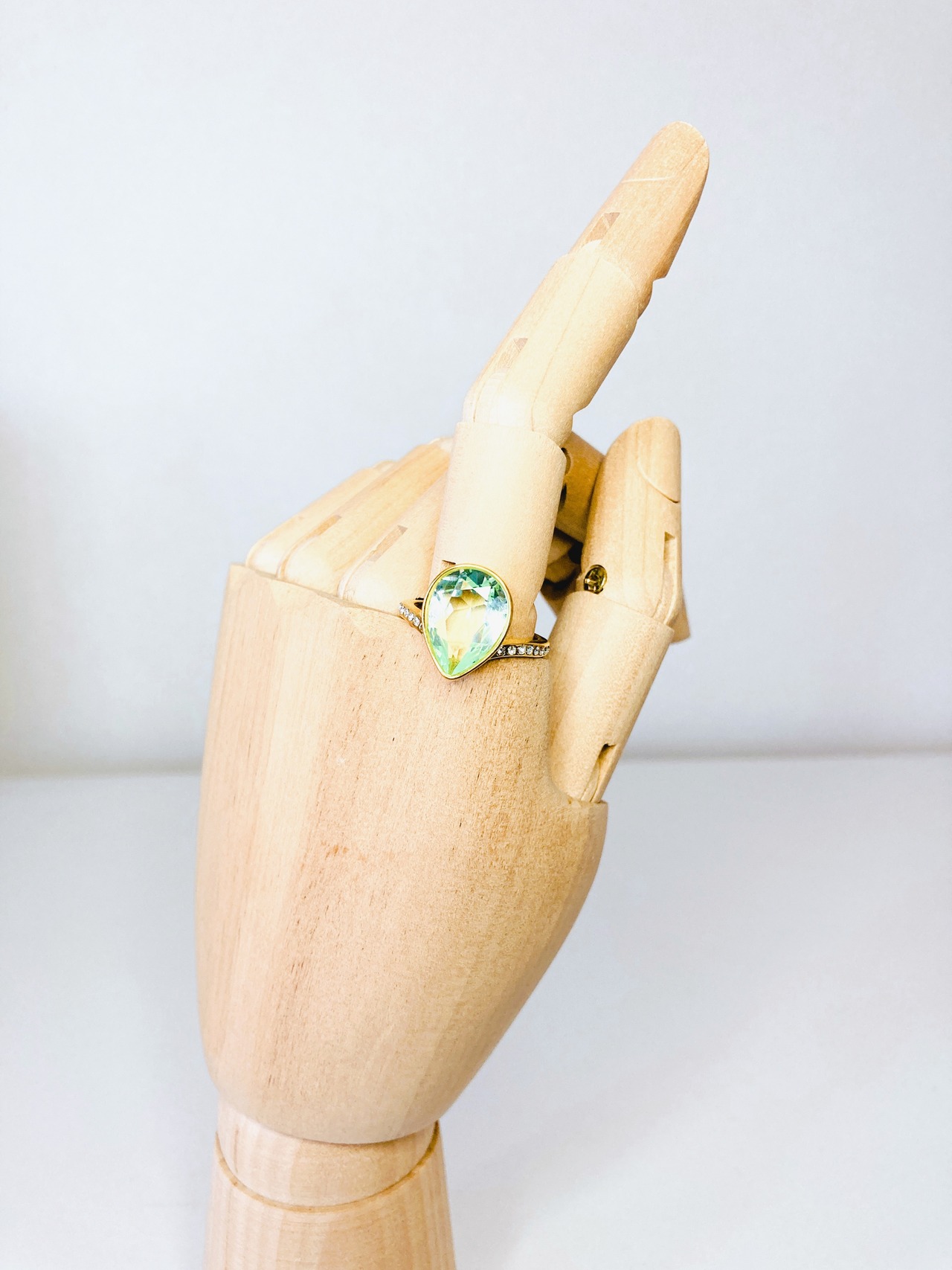 中央に大粒なドロップのクリスタルを1粒と、リング台の両サイドに小さなクリスタルを8粒ずつあしらった