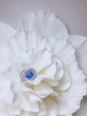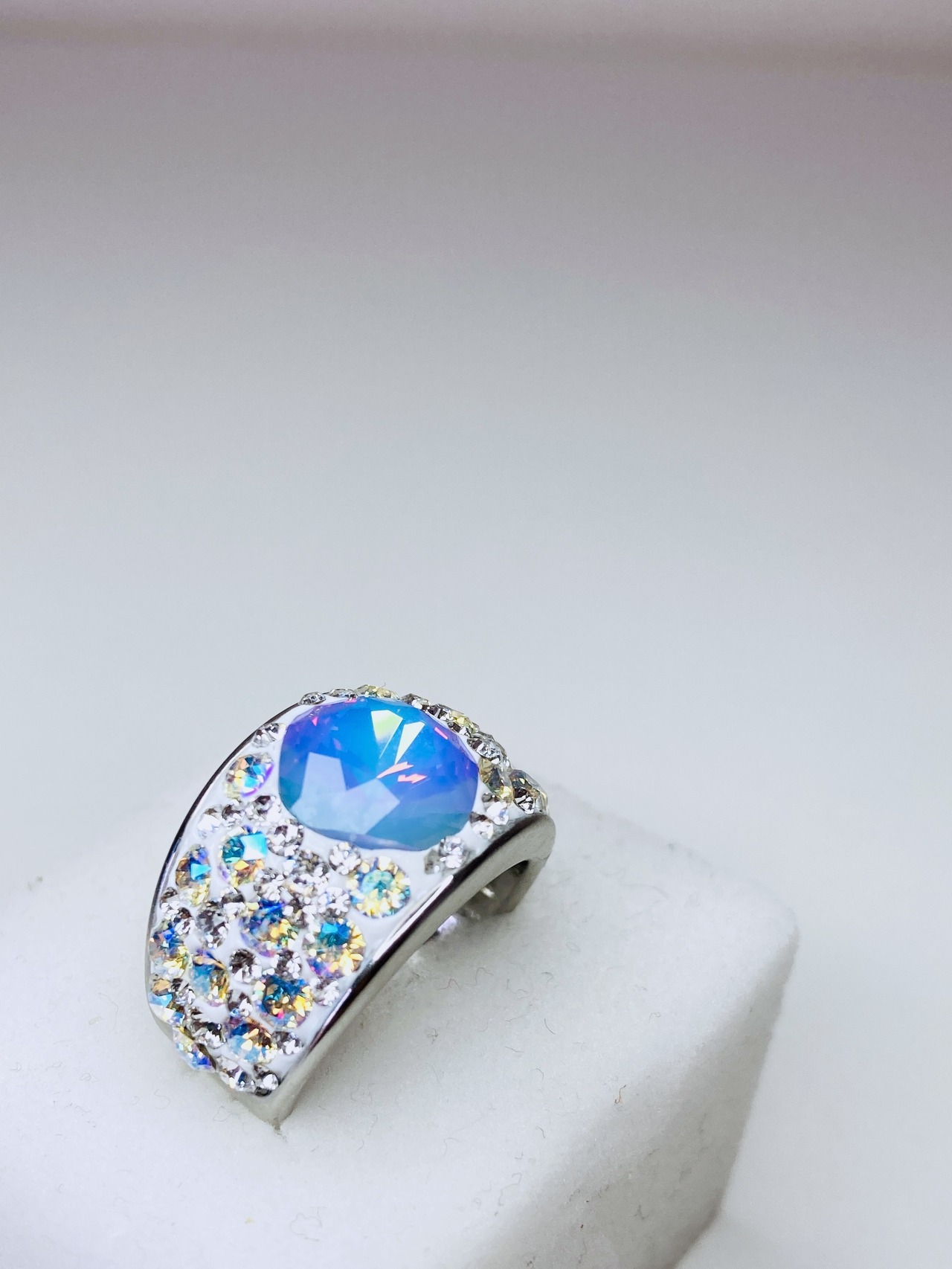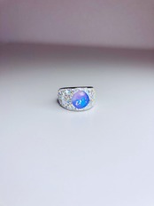 センターのスクエアタイプのクリスタルは、ミルキーなホワイトオパールに淡いパープルの煌めきをプラスした魅惑のカラー