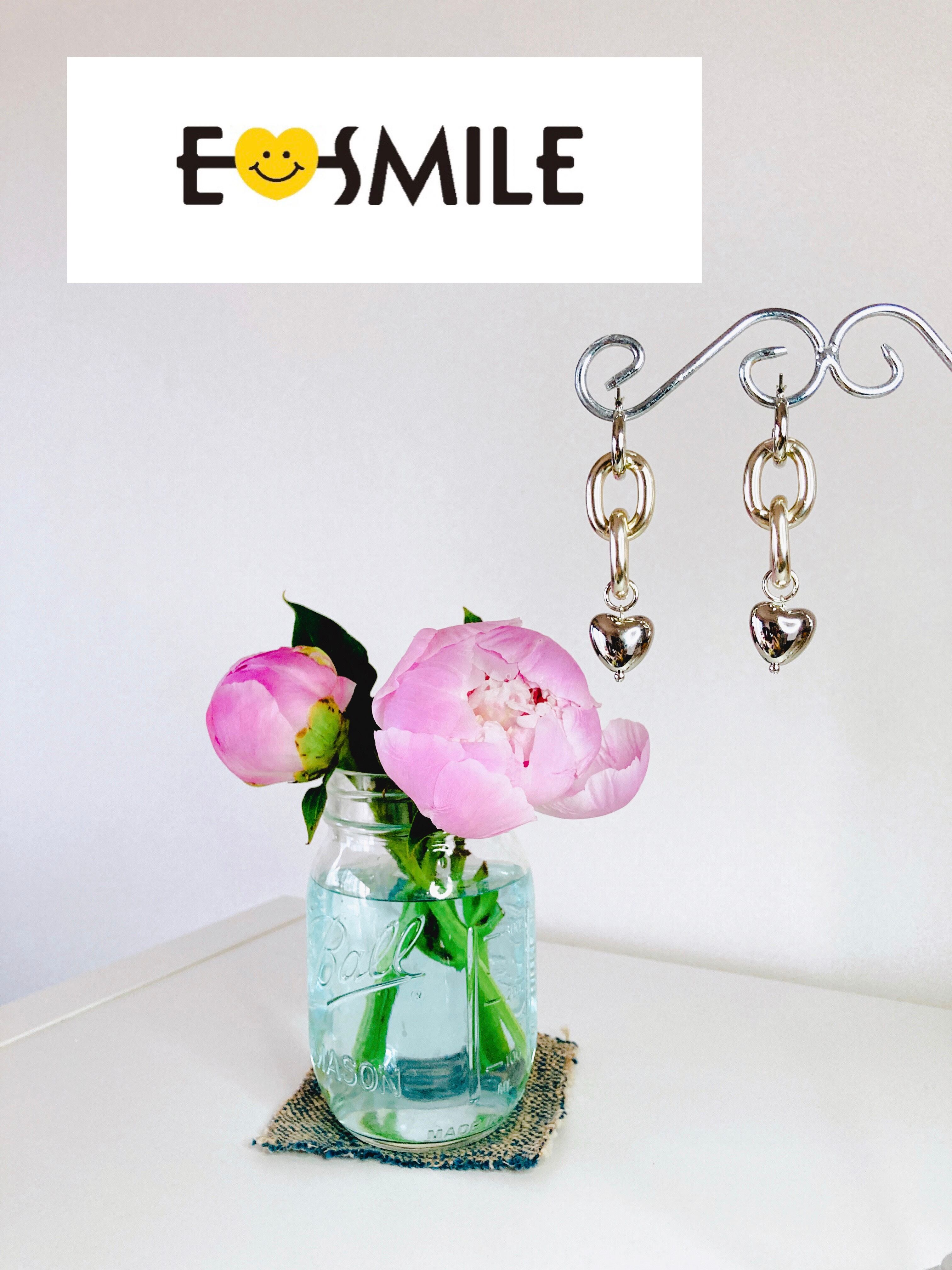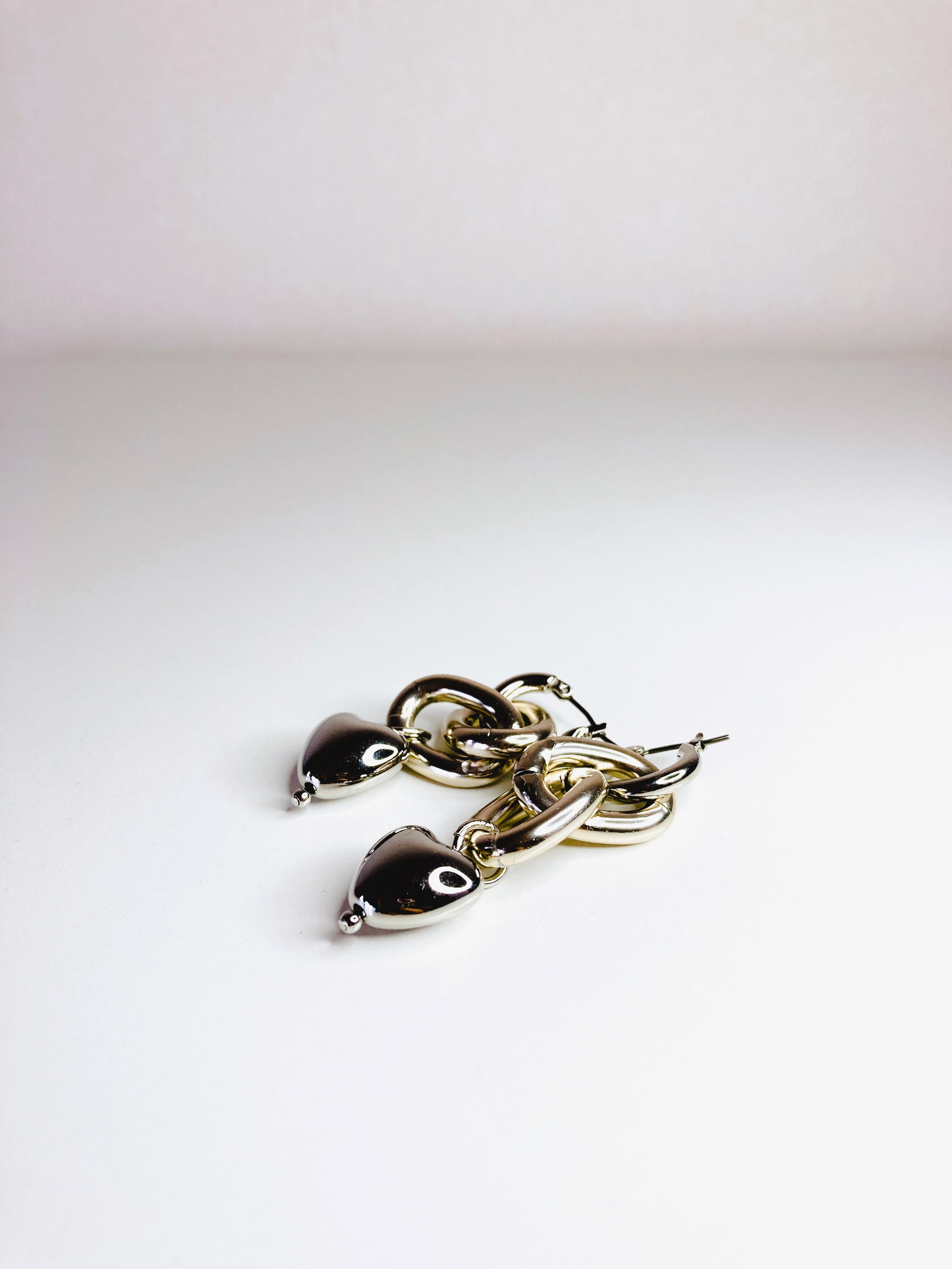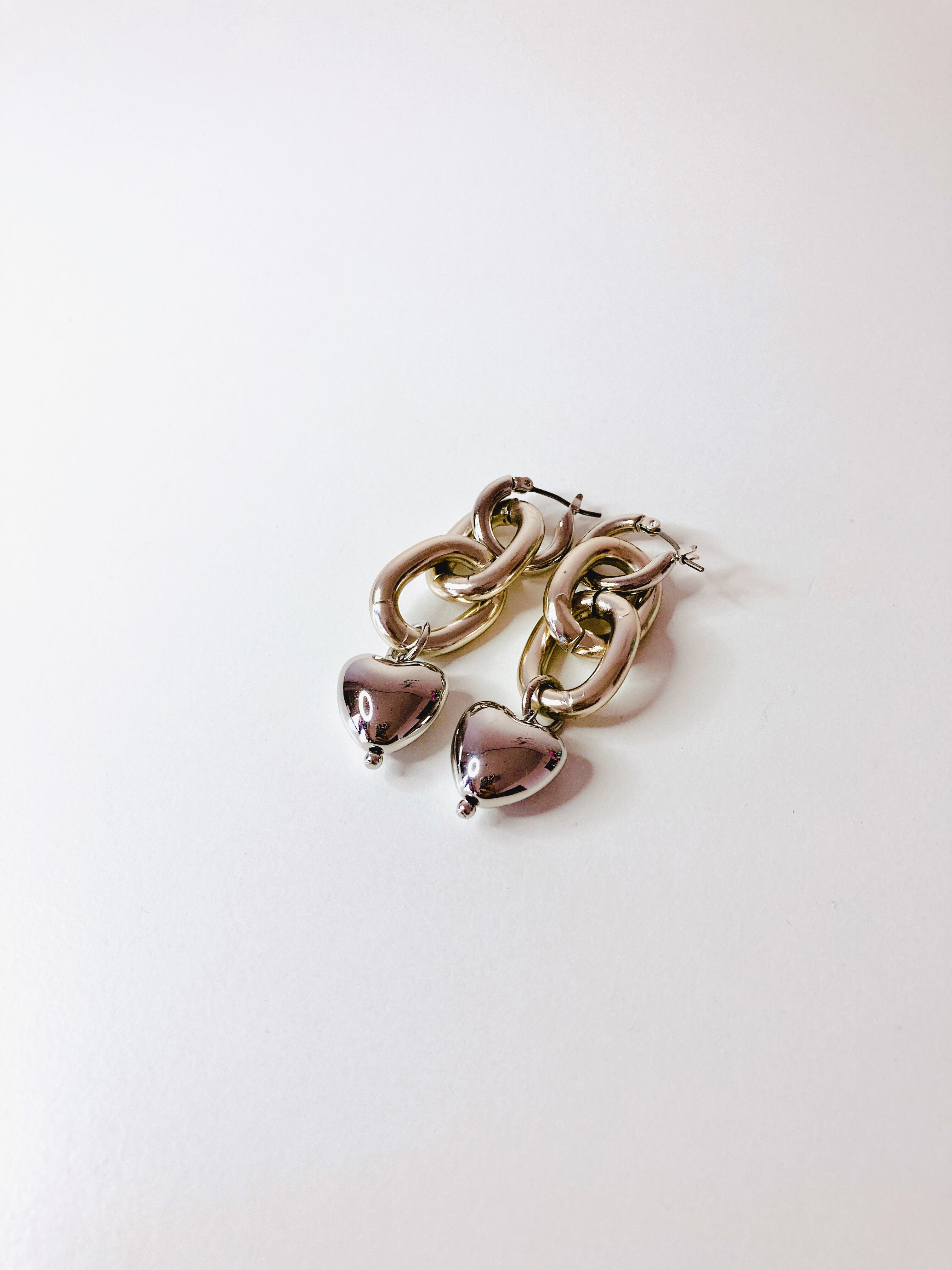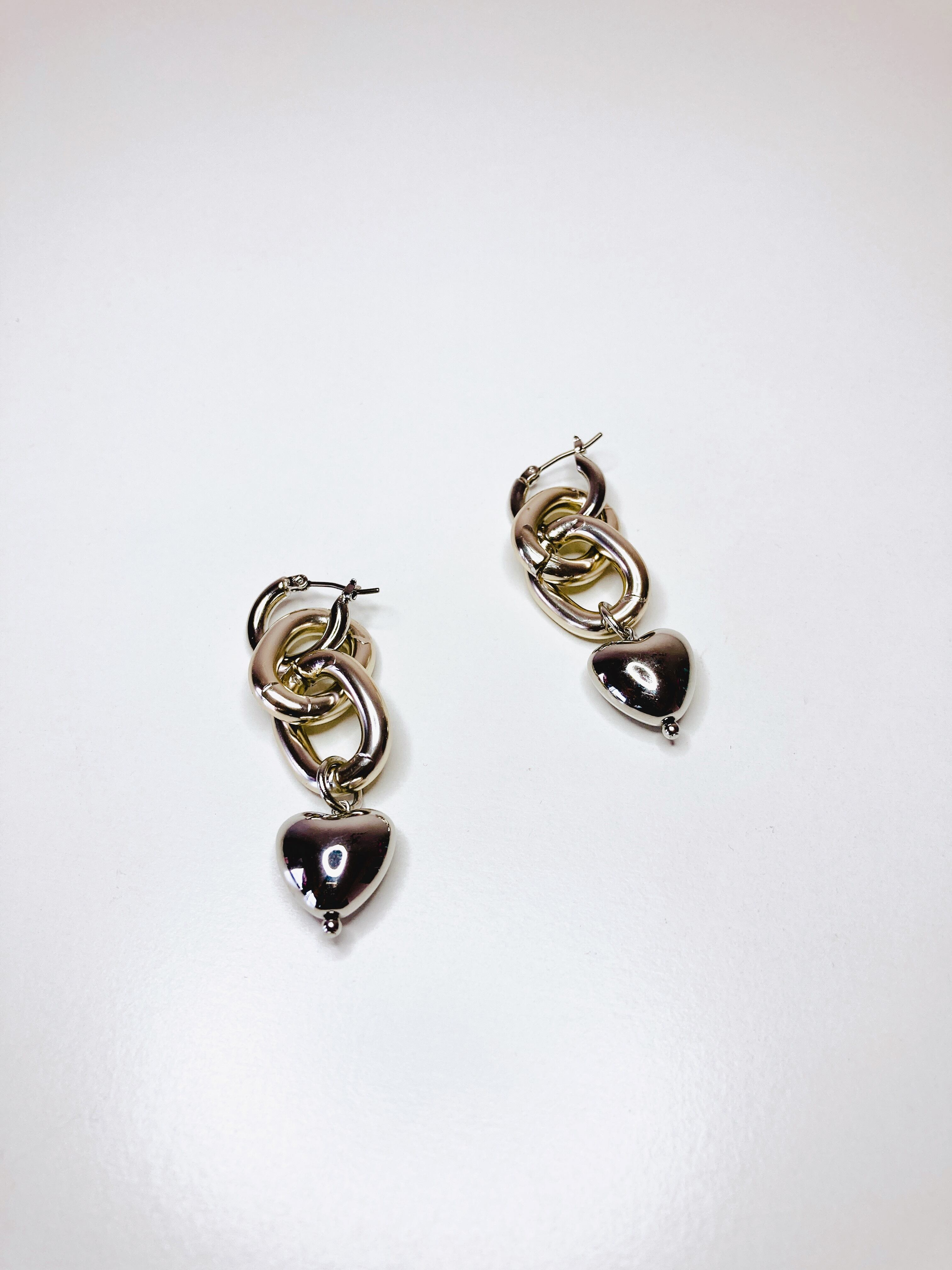 フープピアスにデザインチェーンを組み合わせ、さらにハート♡チャームを付けました。