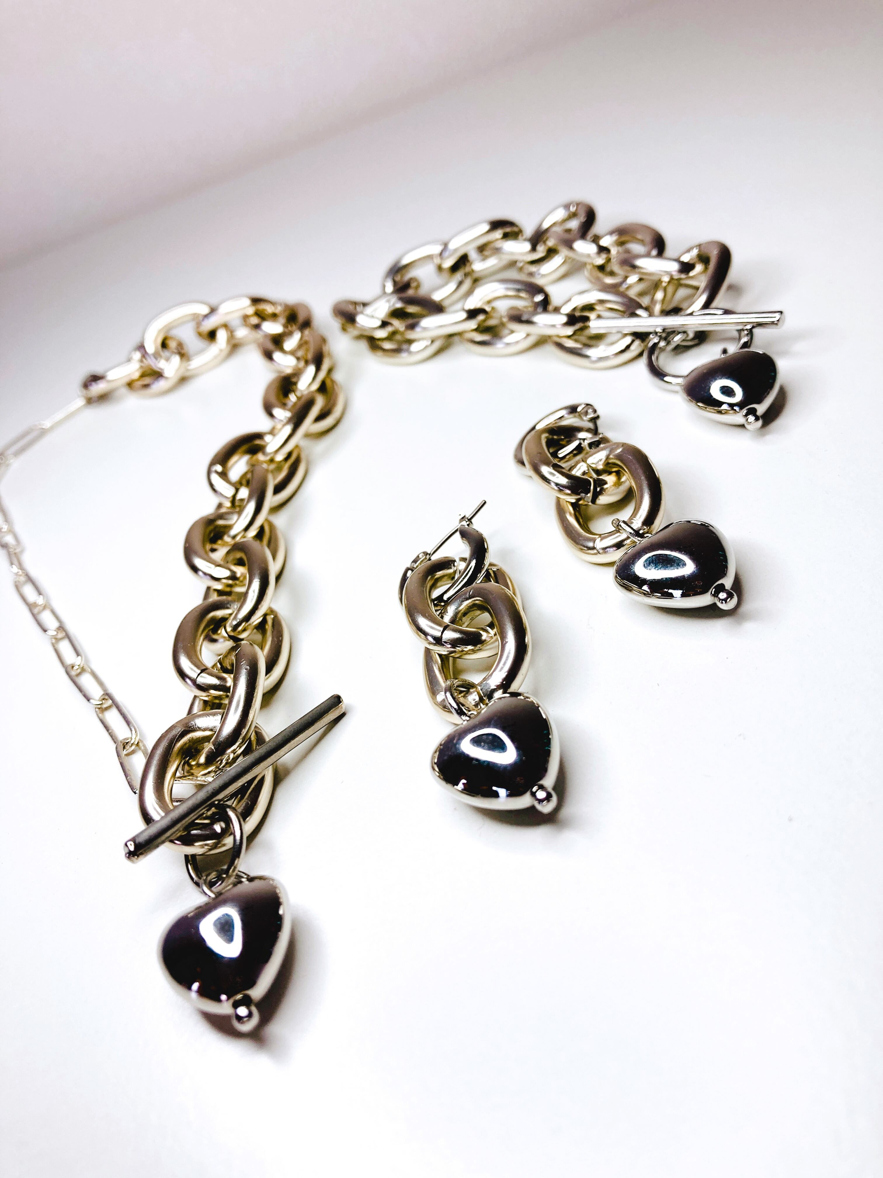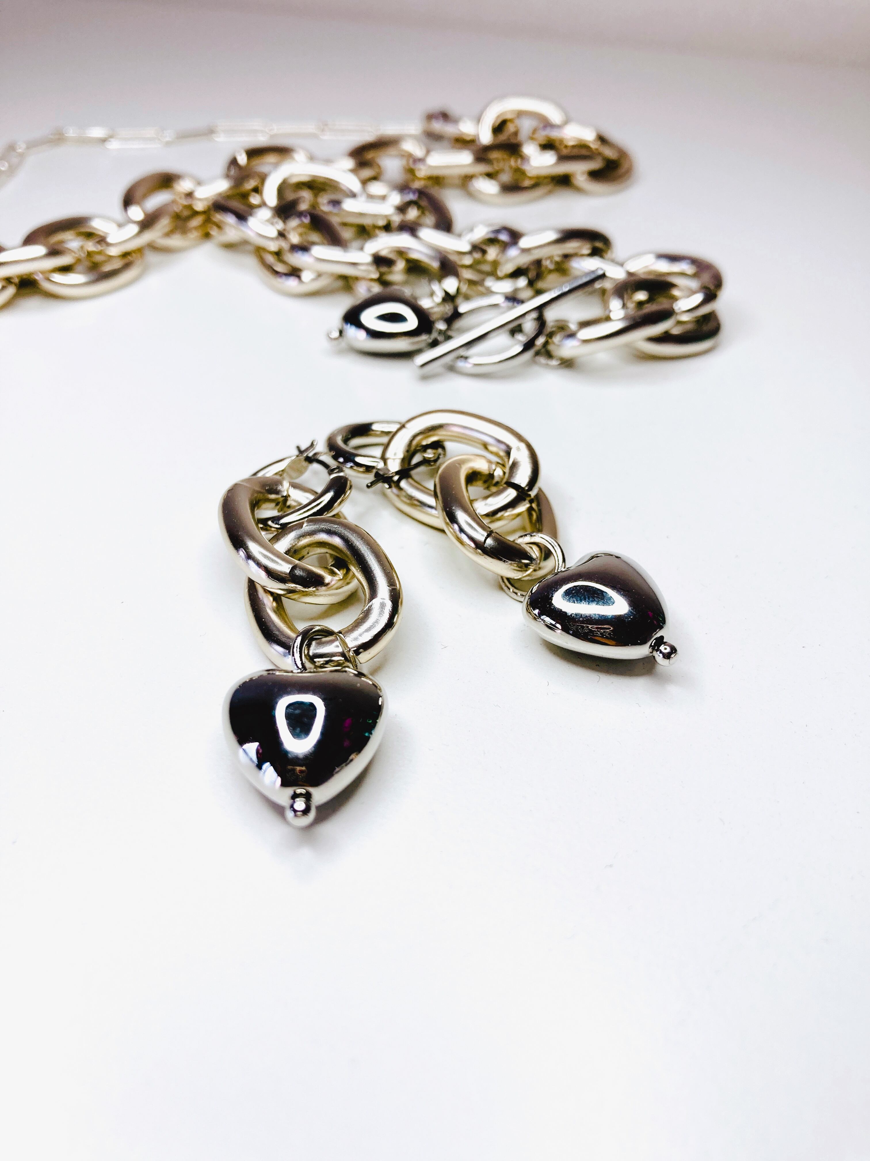 ボリュームのあるハードなチェーンの下に揺れるハートチャームでとってもキュートな仕上がりです。