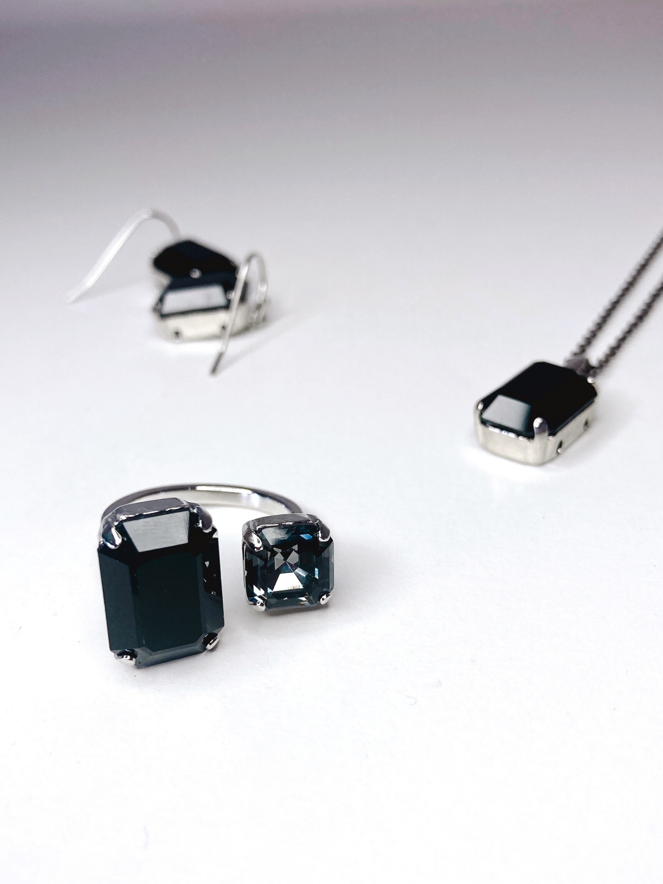 オープンな上部の両脇に2粒のブラック系クリスタルを配置しました。