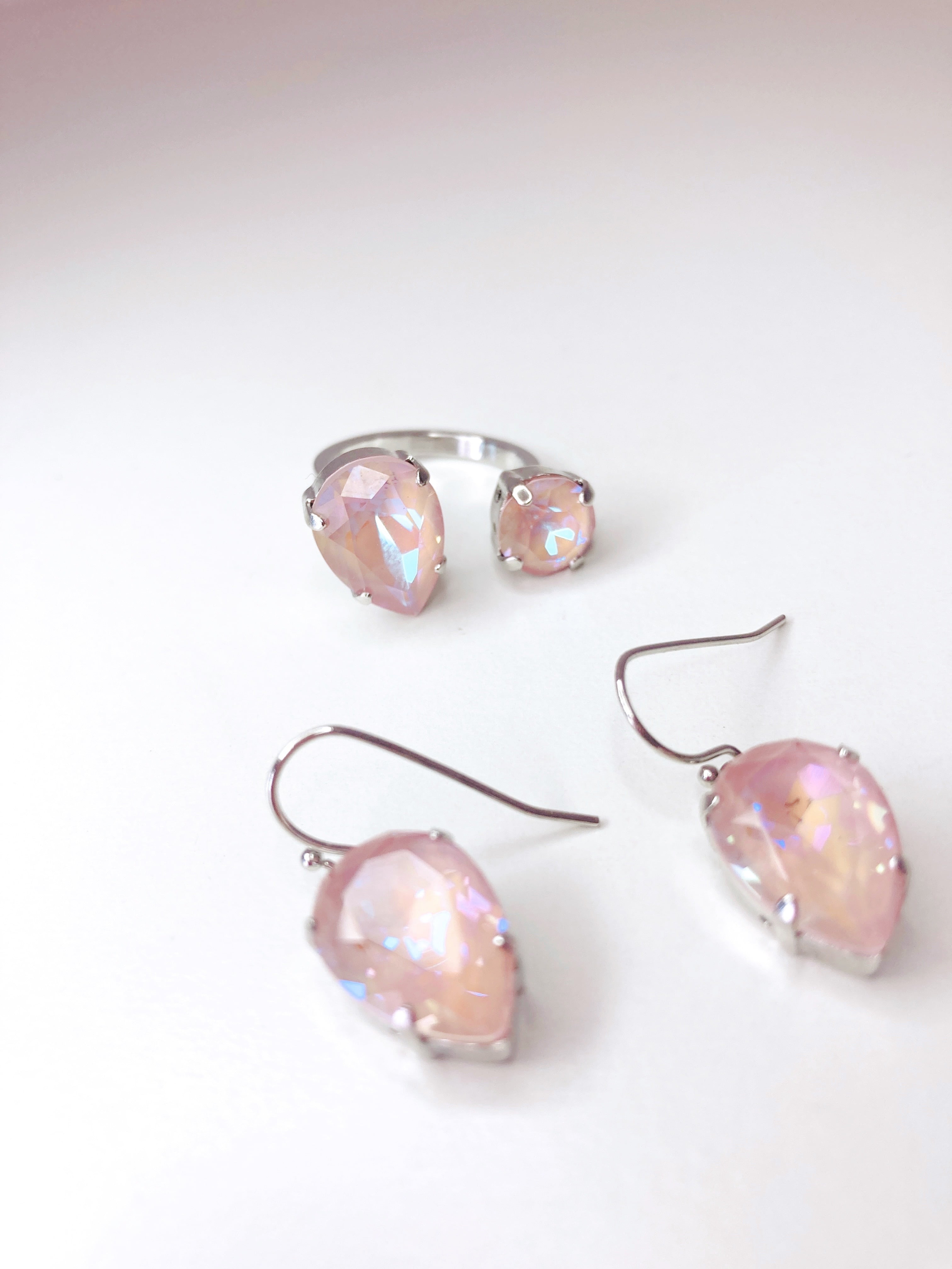 クリスタルは、ダスティピンクディライトという角度によって多彩な色味を放つ加工が施されているカラー使用しております。