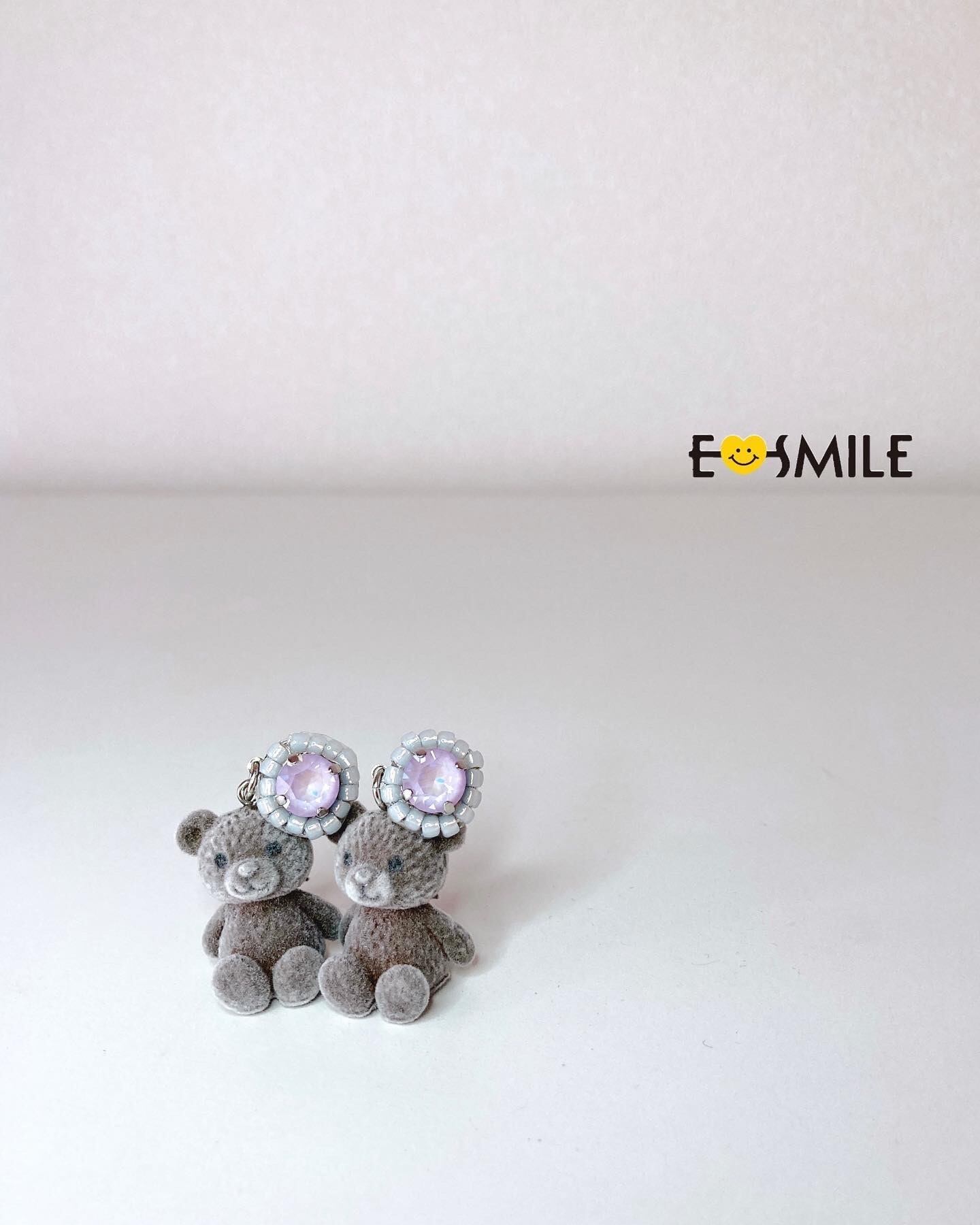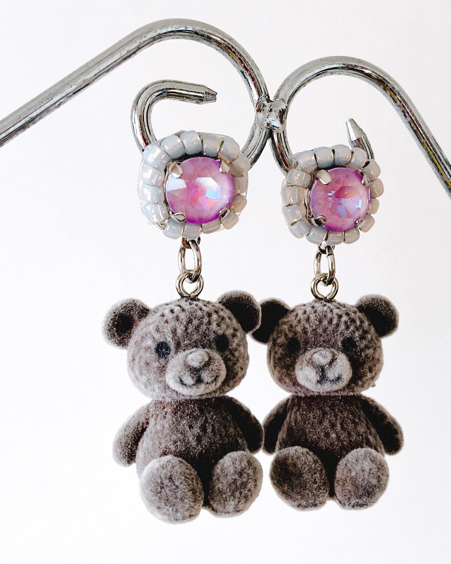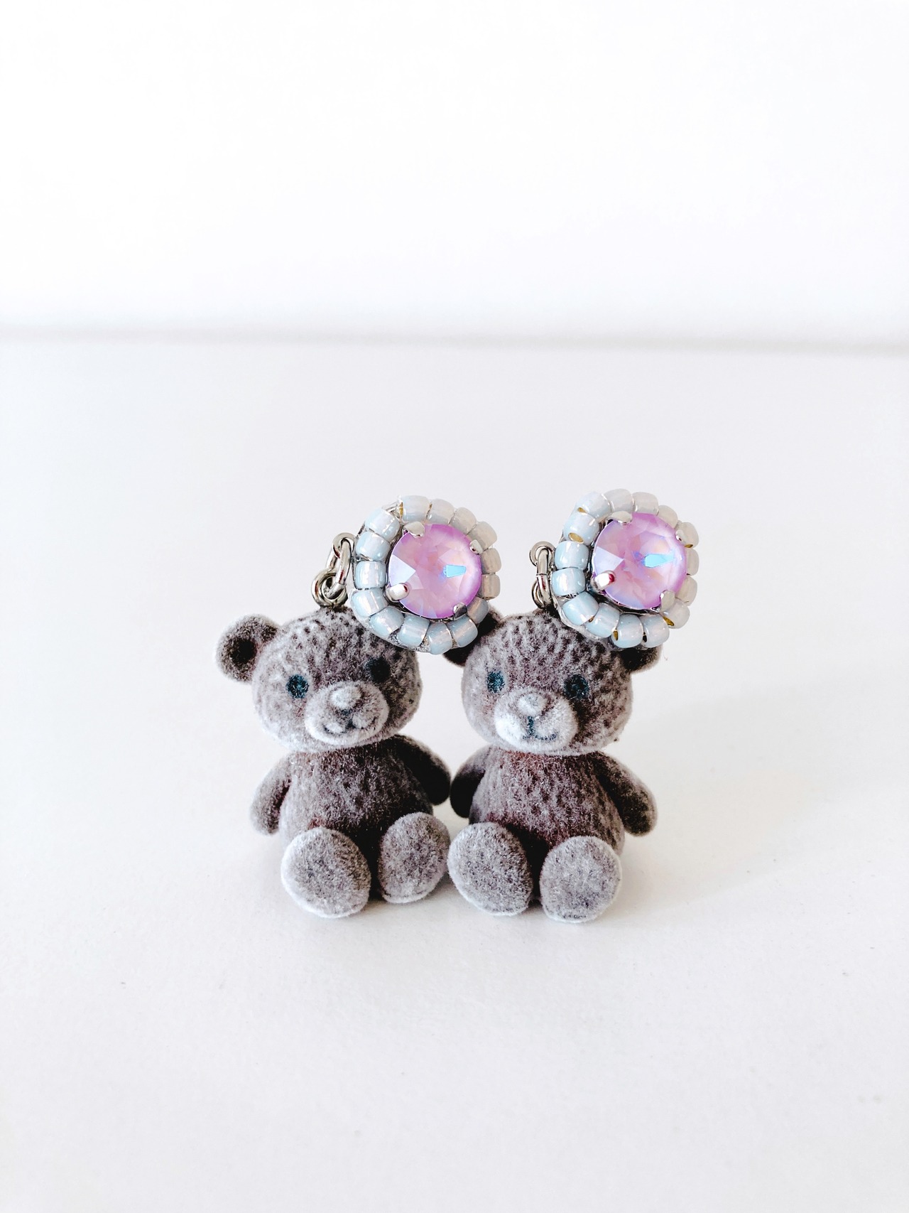淡いピンククリスタルの周囲には淡いグレーのビーズ、その下に可愛いくまさんがぶら下がってます。