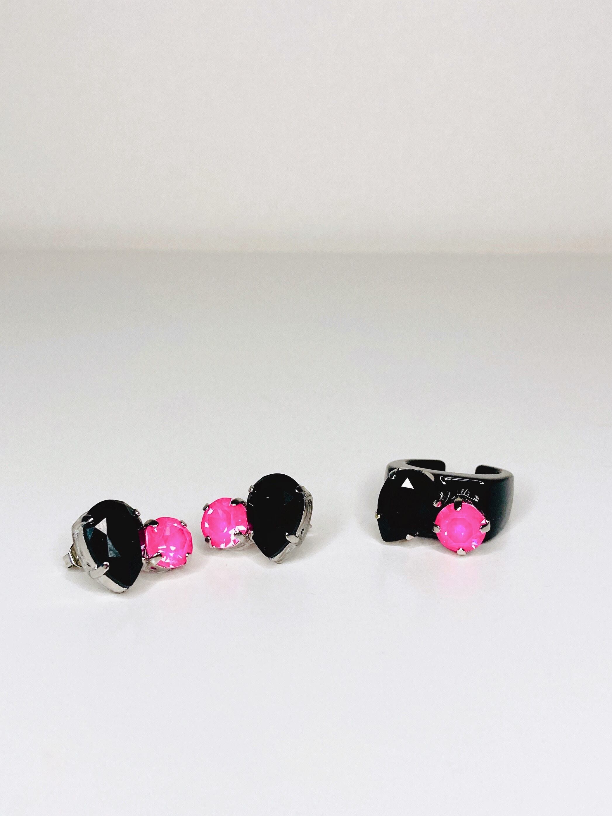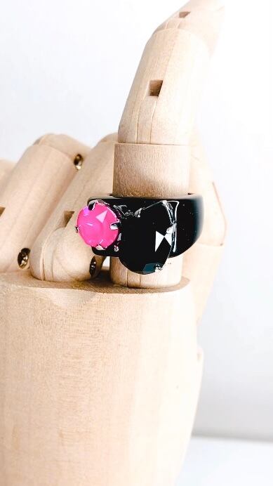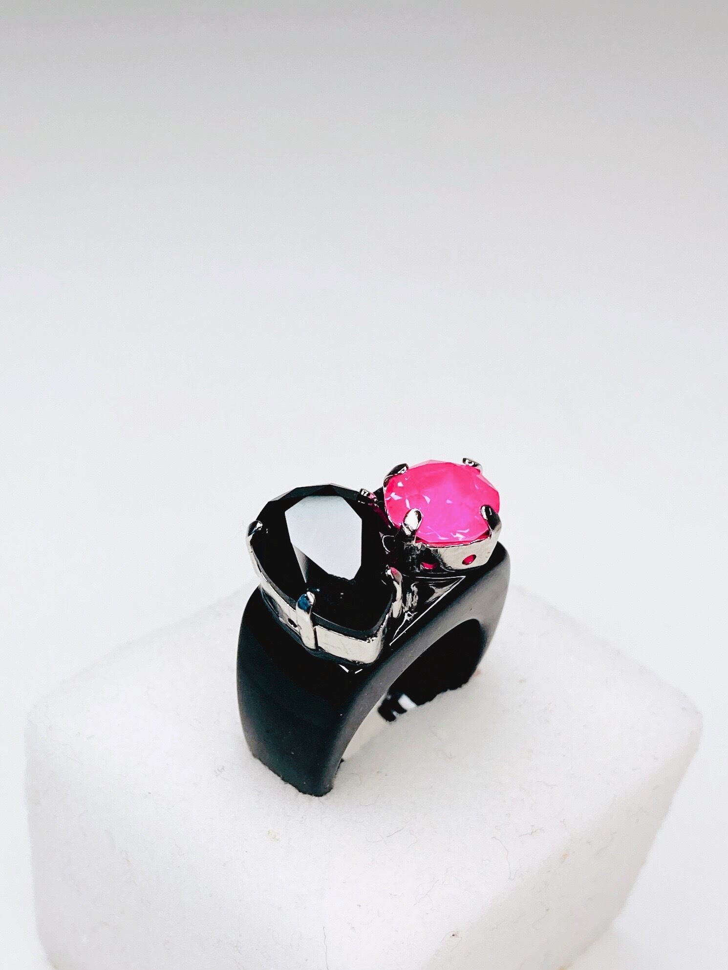 ティアドロップのブラッククリスタルと、ビビッドなピンククリスタルを合わせたリングです。