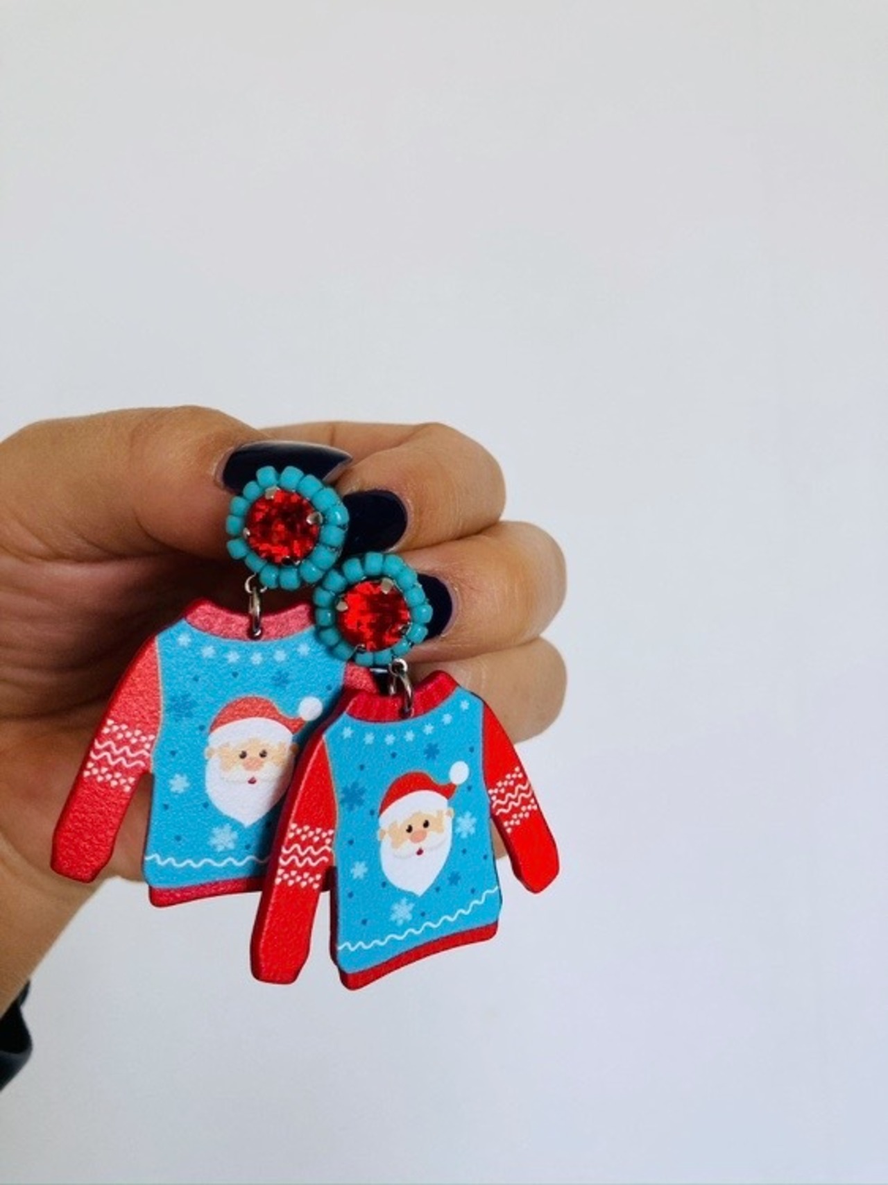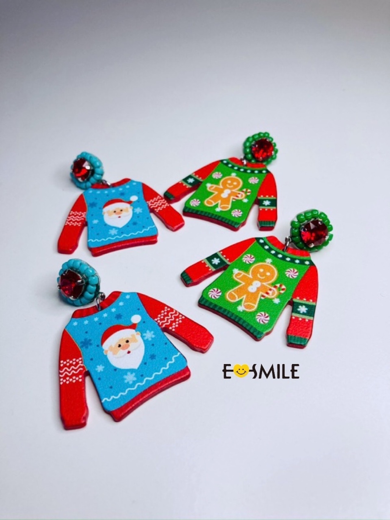 赤いクリスタルを1粒と、その周りにビーズを施し、その下部にアグリーセーターをつけてキュートに仕上がってます‼︎
