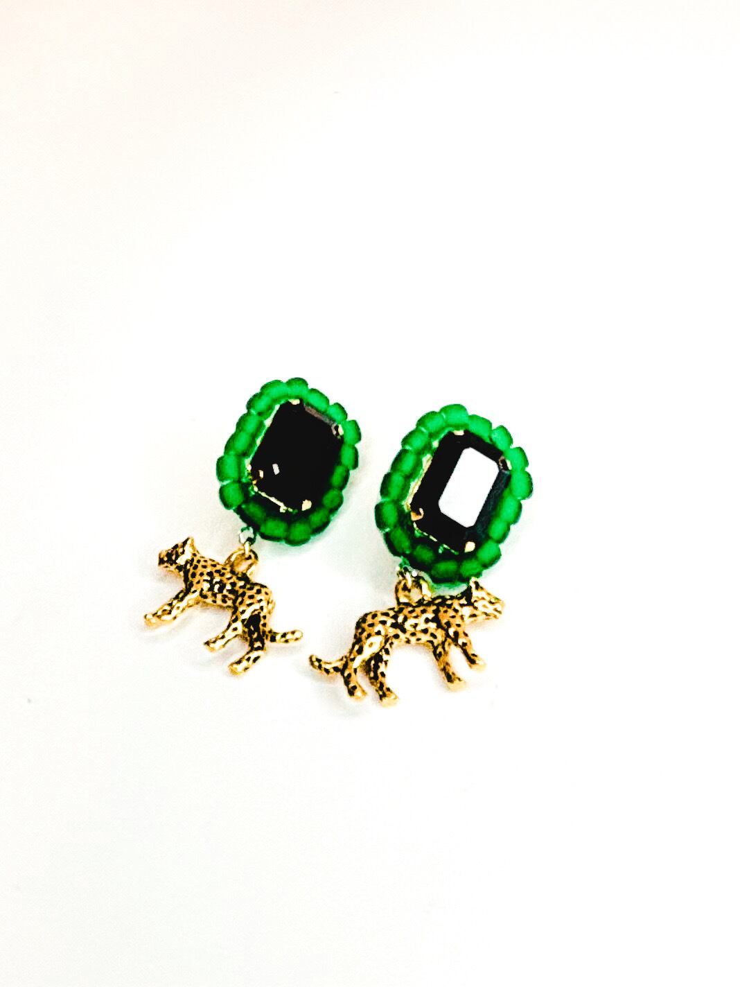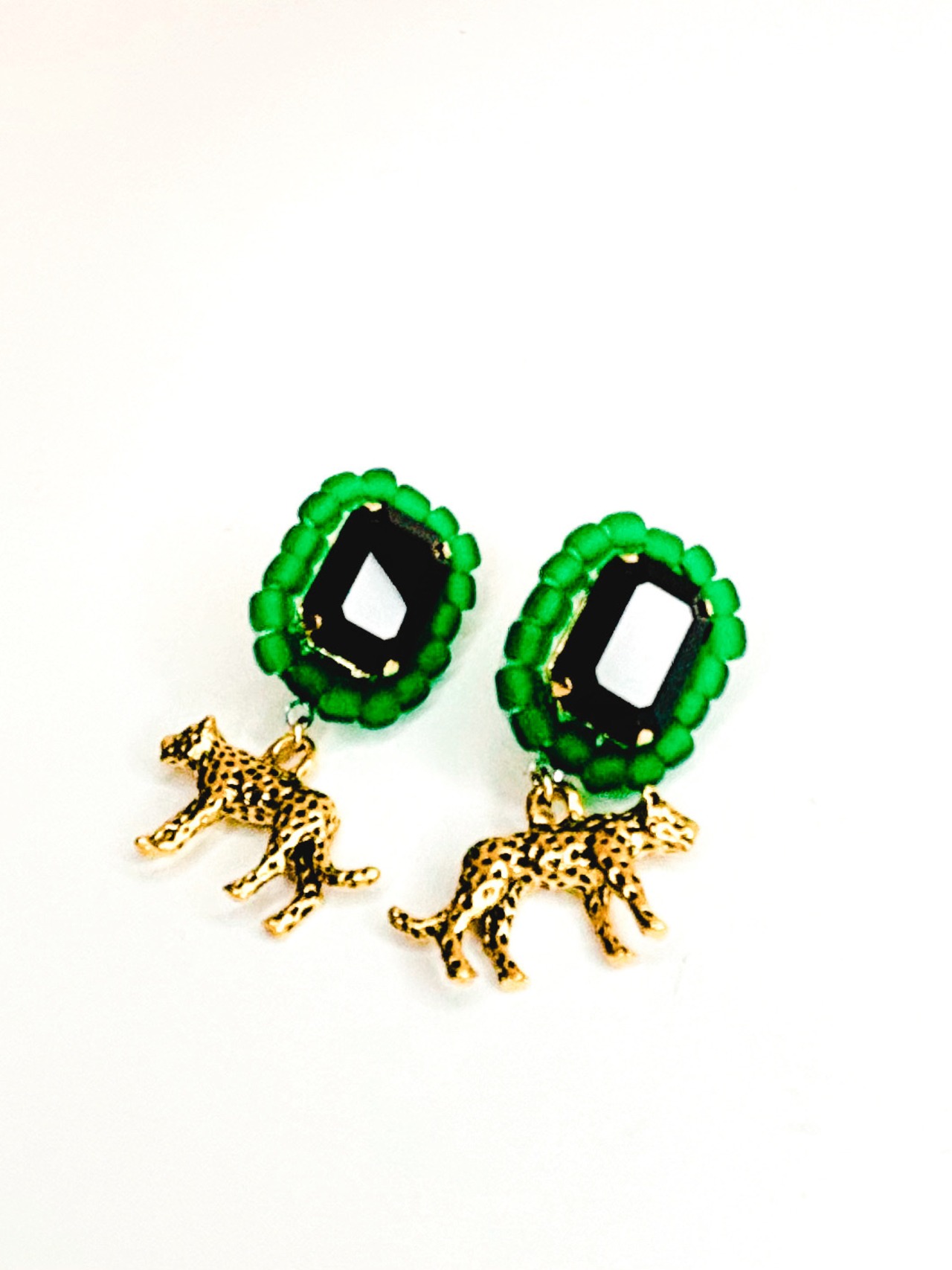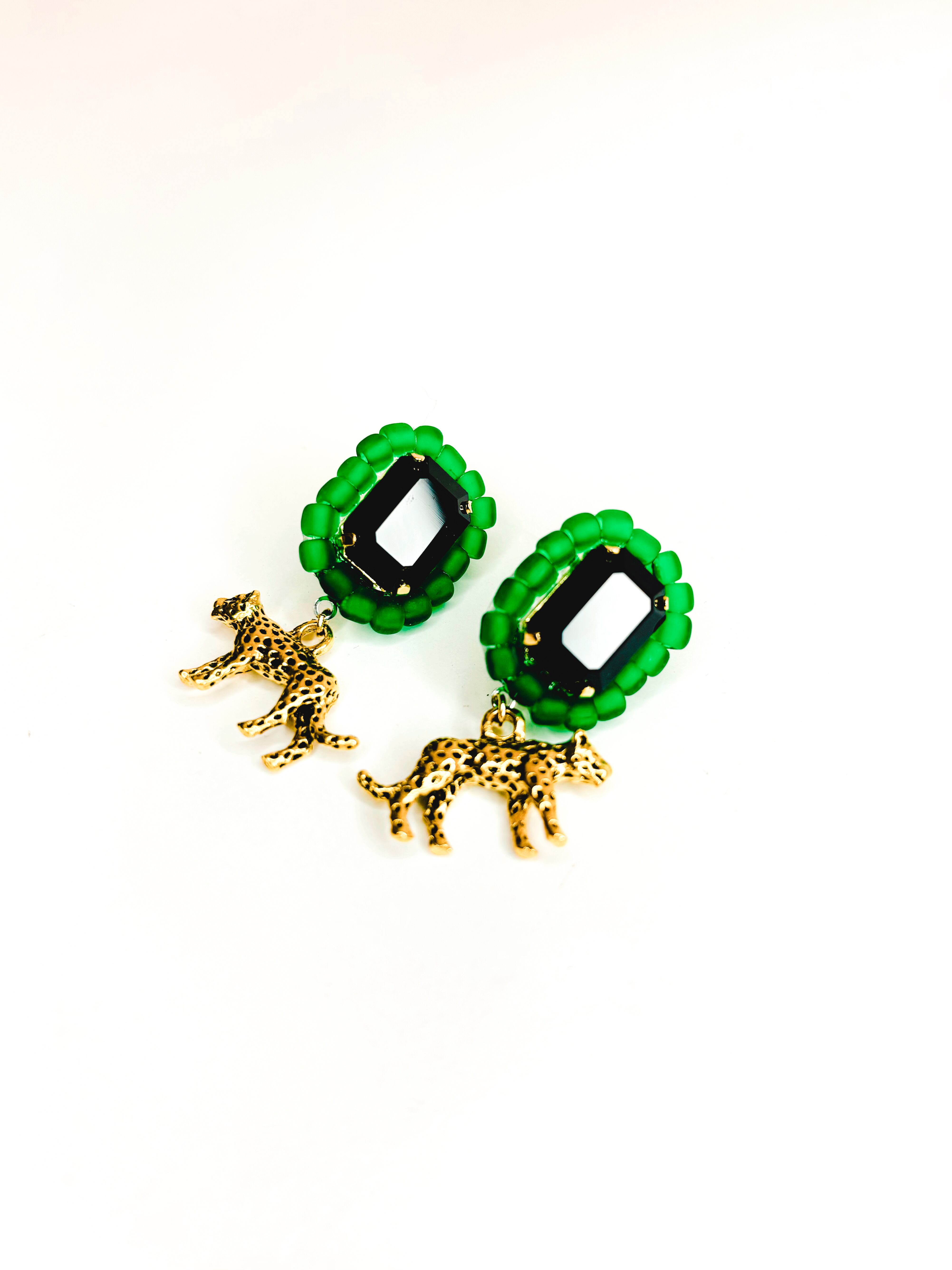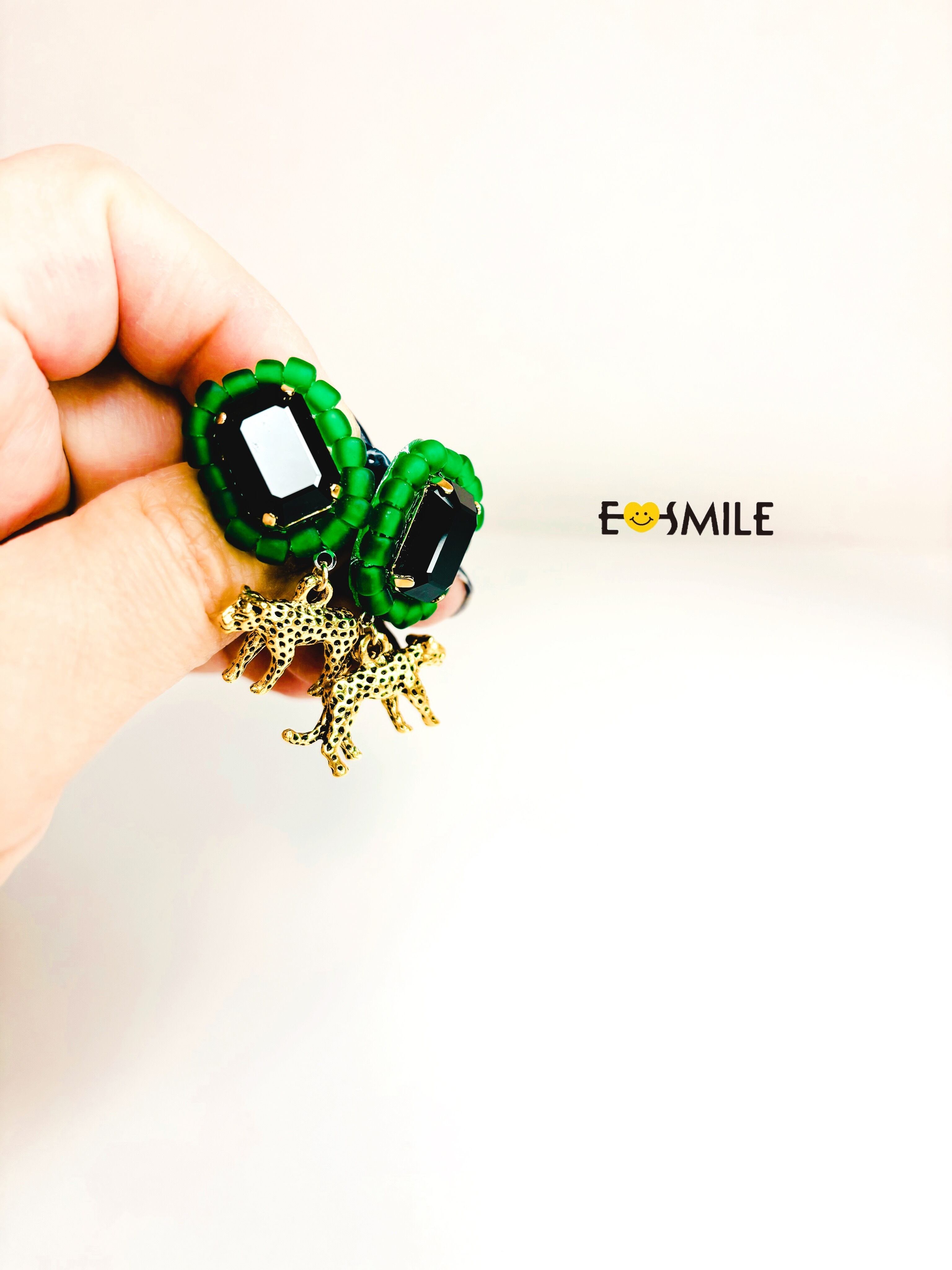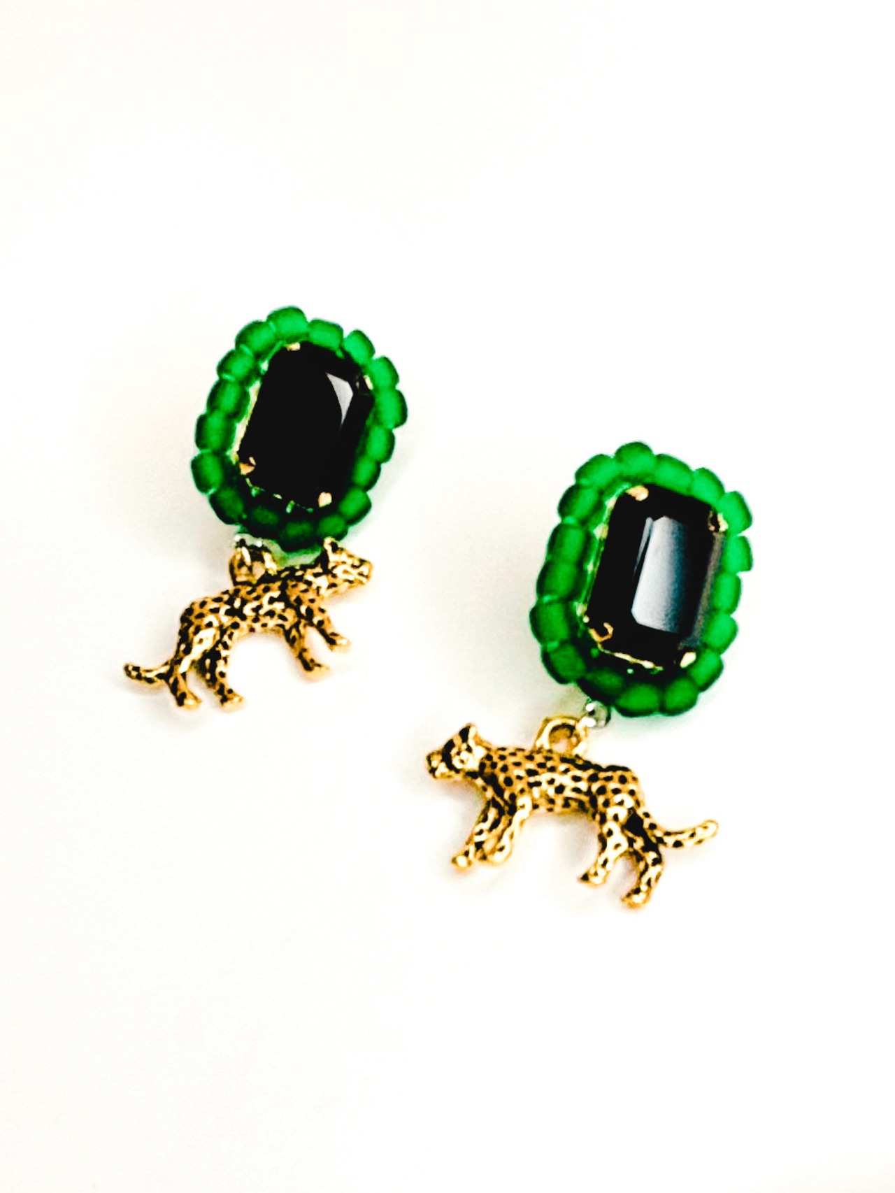 長方形のブラッククリスタルの周囲に深めのグリーンビーズを施し、その下にはレオパードを配置。
