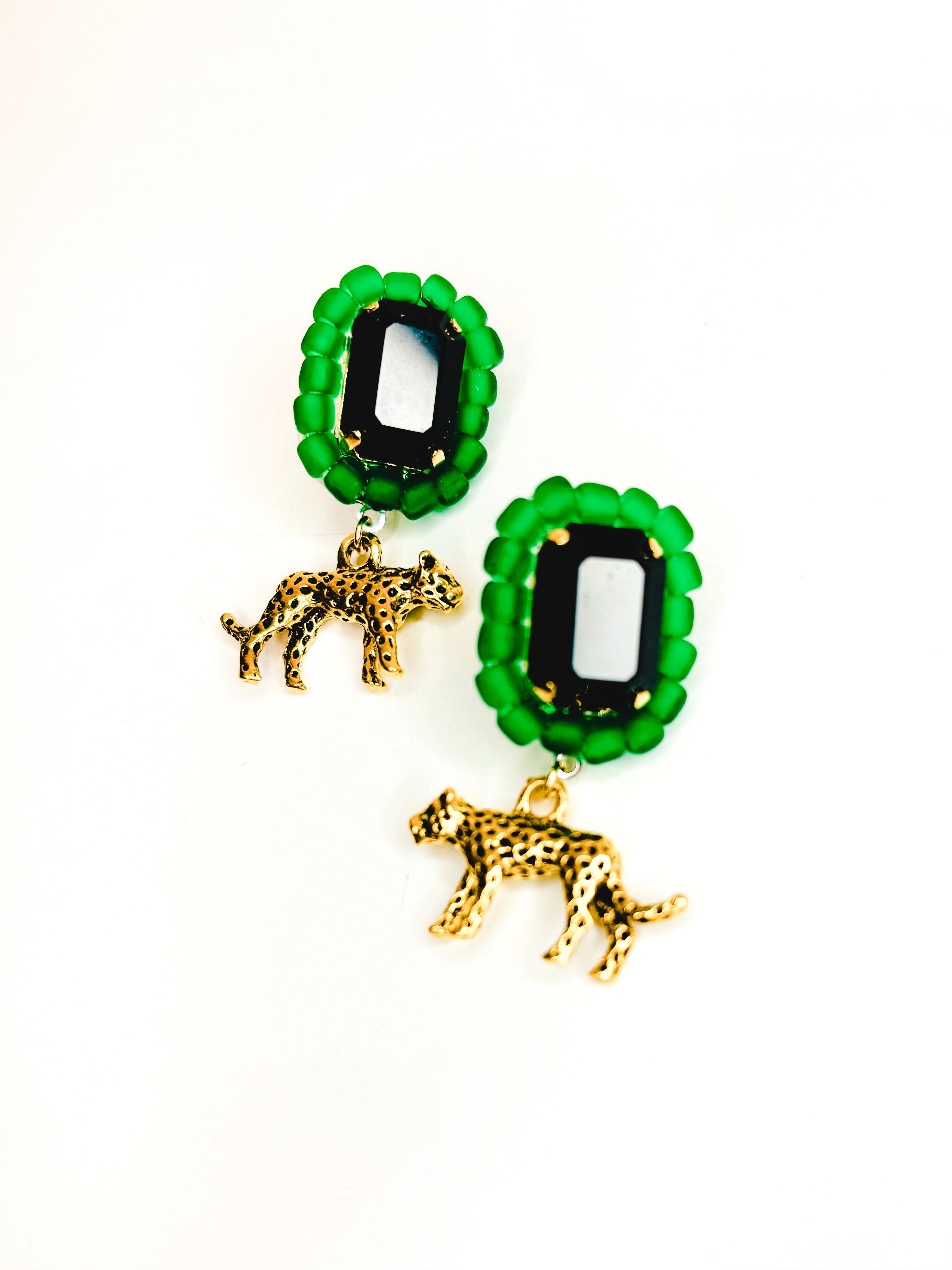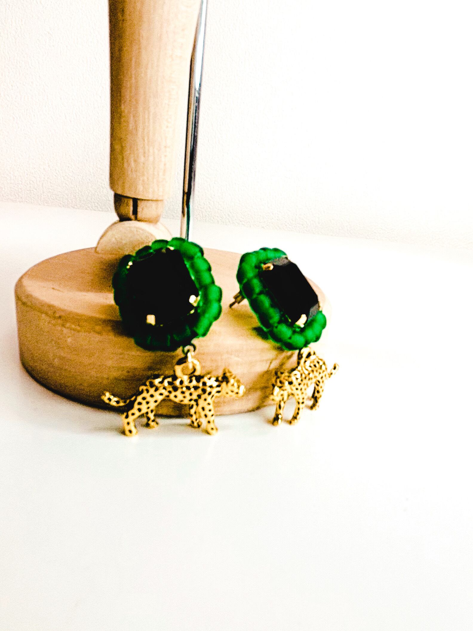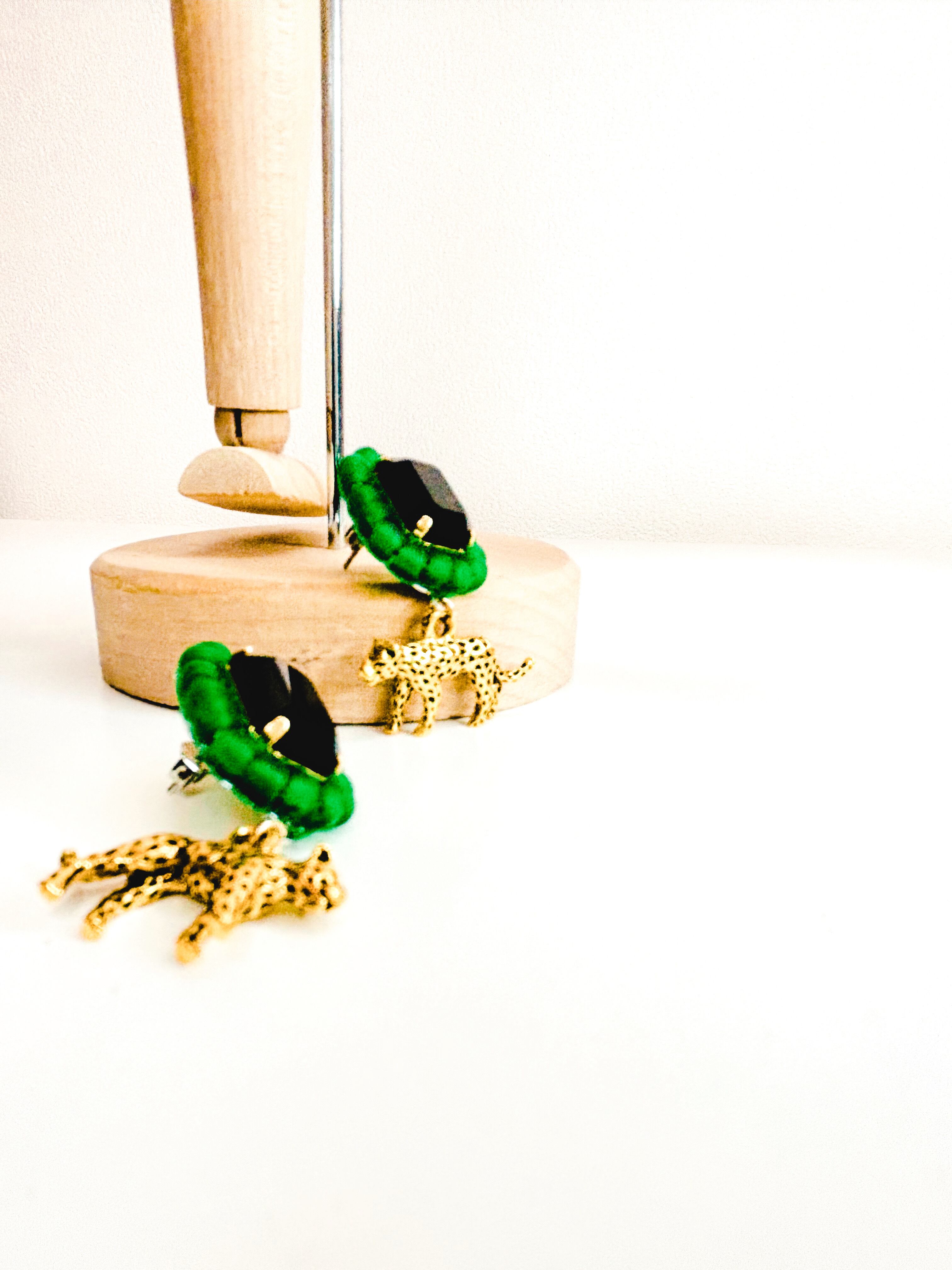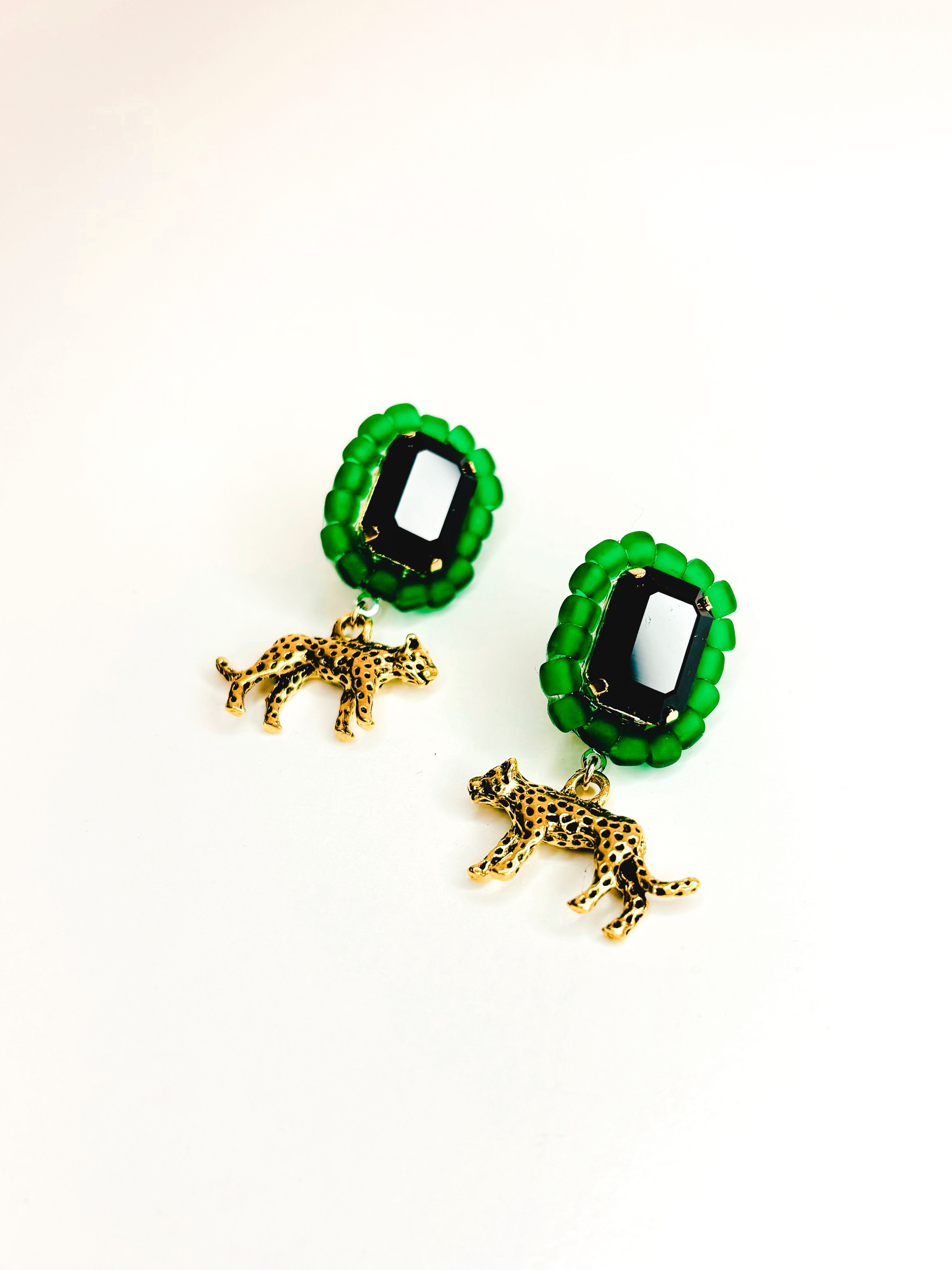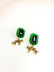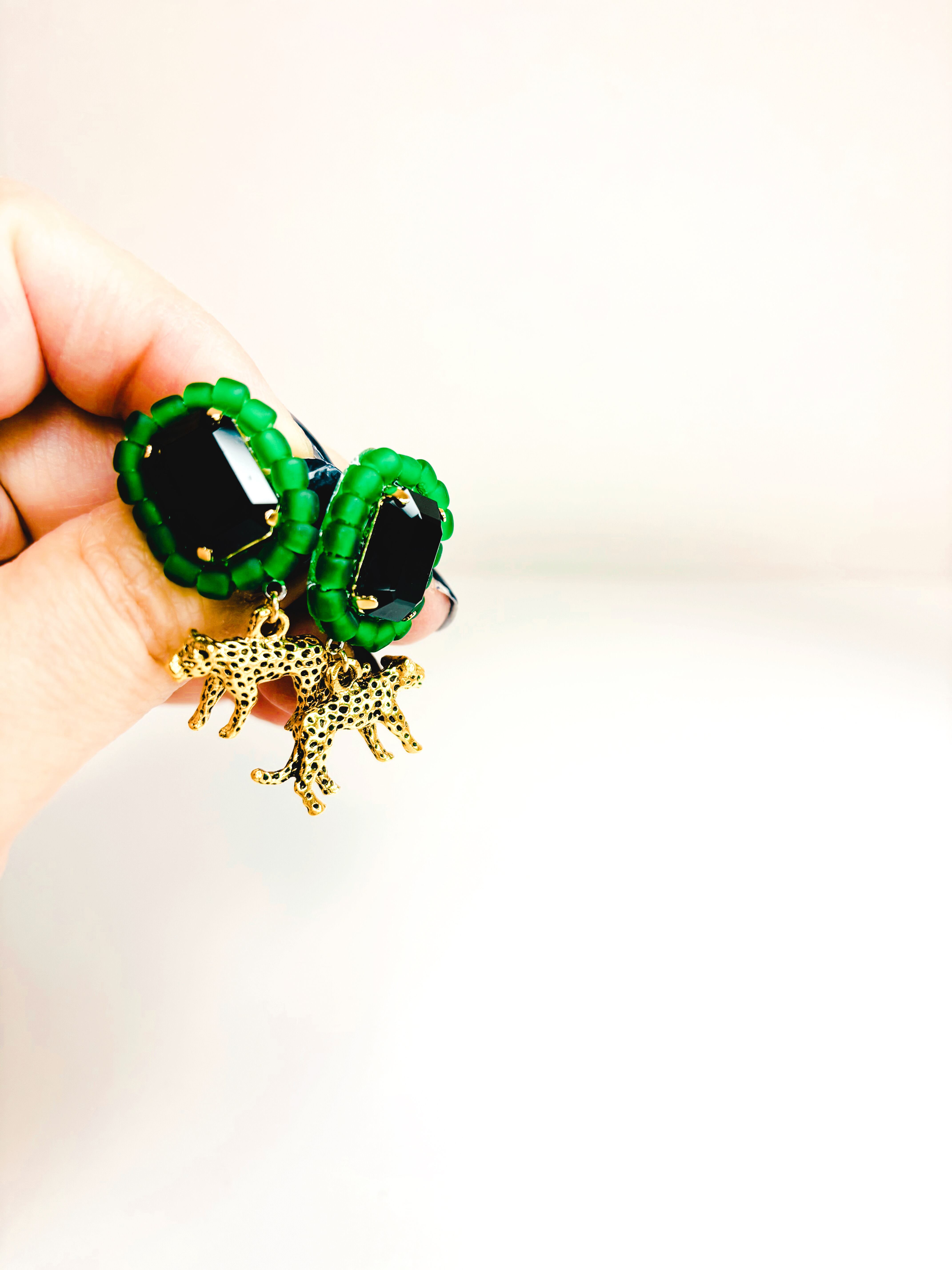 長方形のブラッククリスタルの周囲に深めのグリーンビーズを施し、その下にはレオパードを配置。