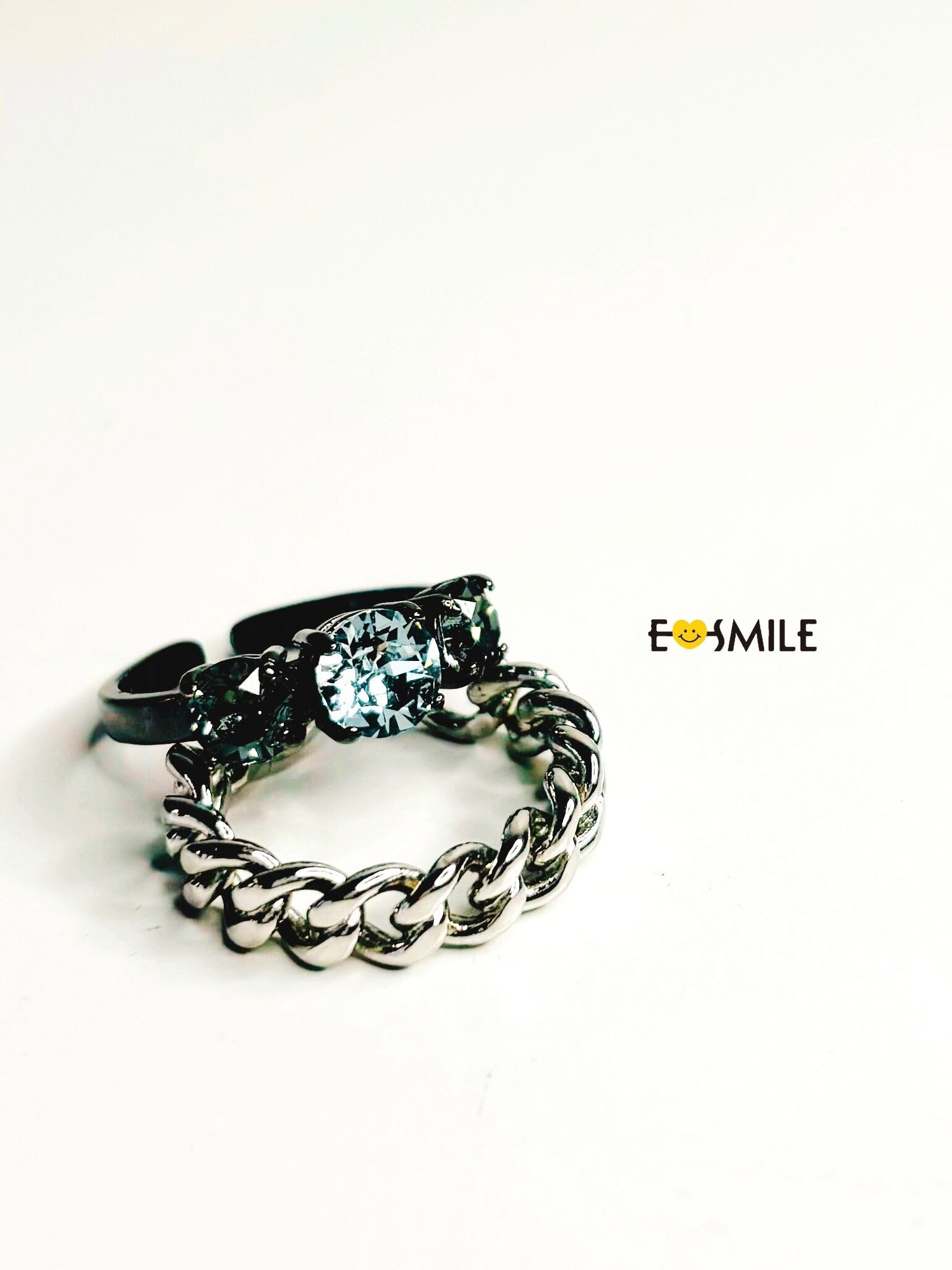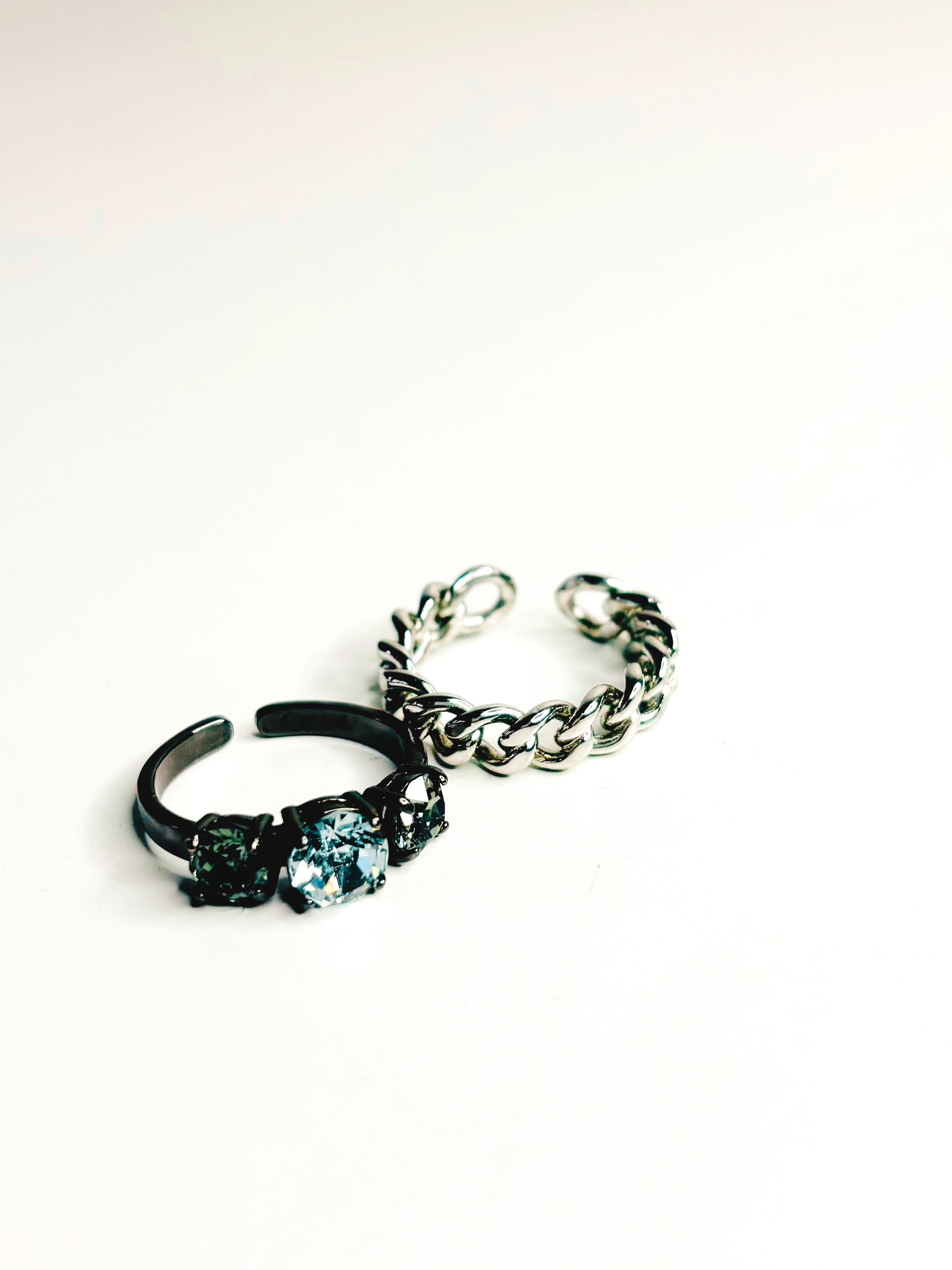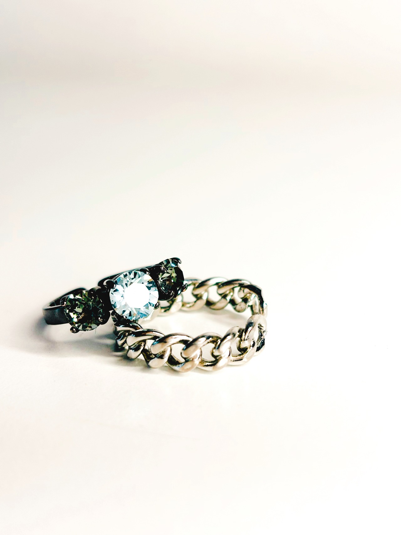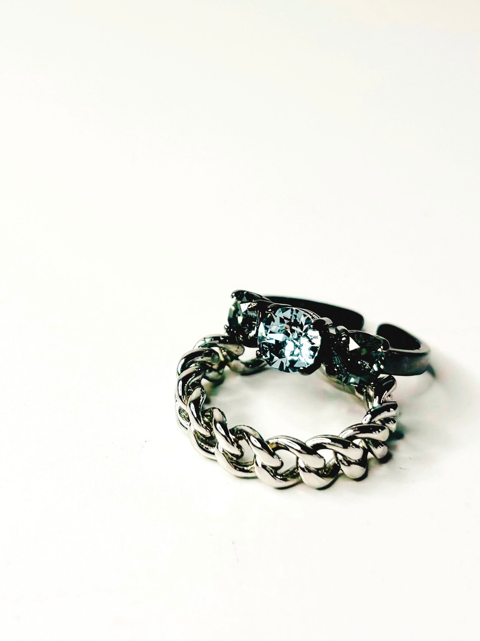 高品質なオーストリア産クリスタルを3粒施したリングとチェーンのリング、2個セットです。