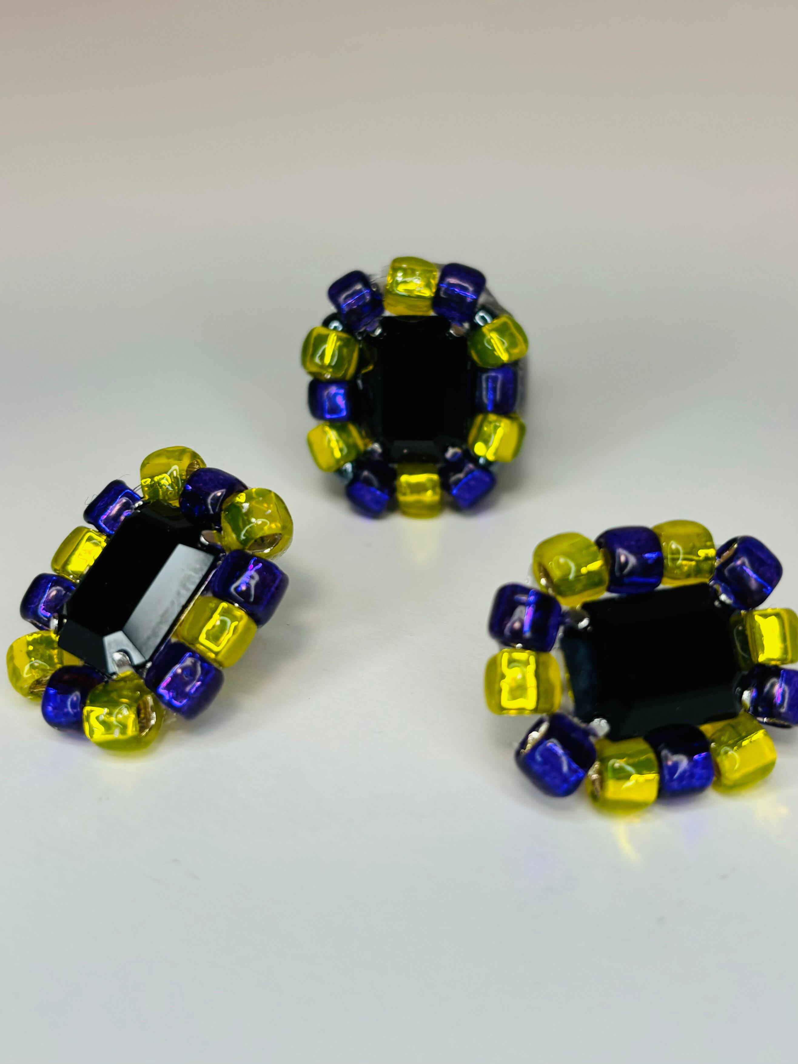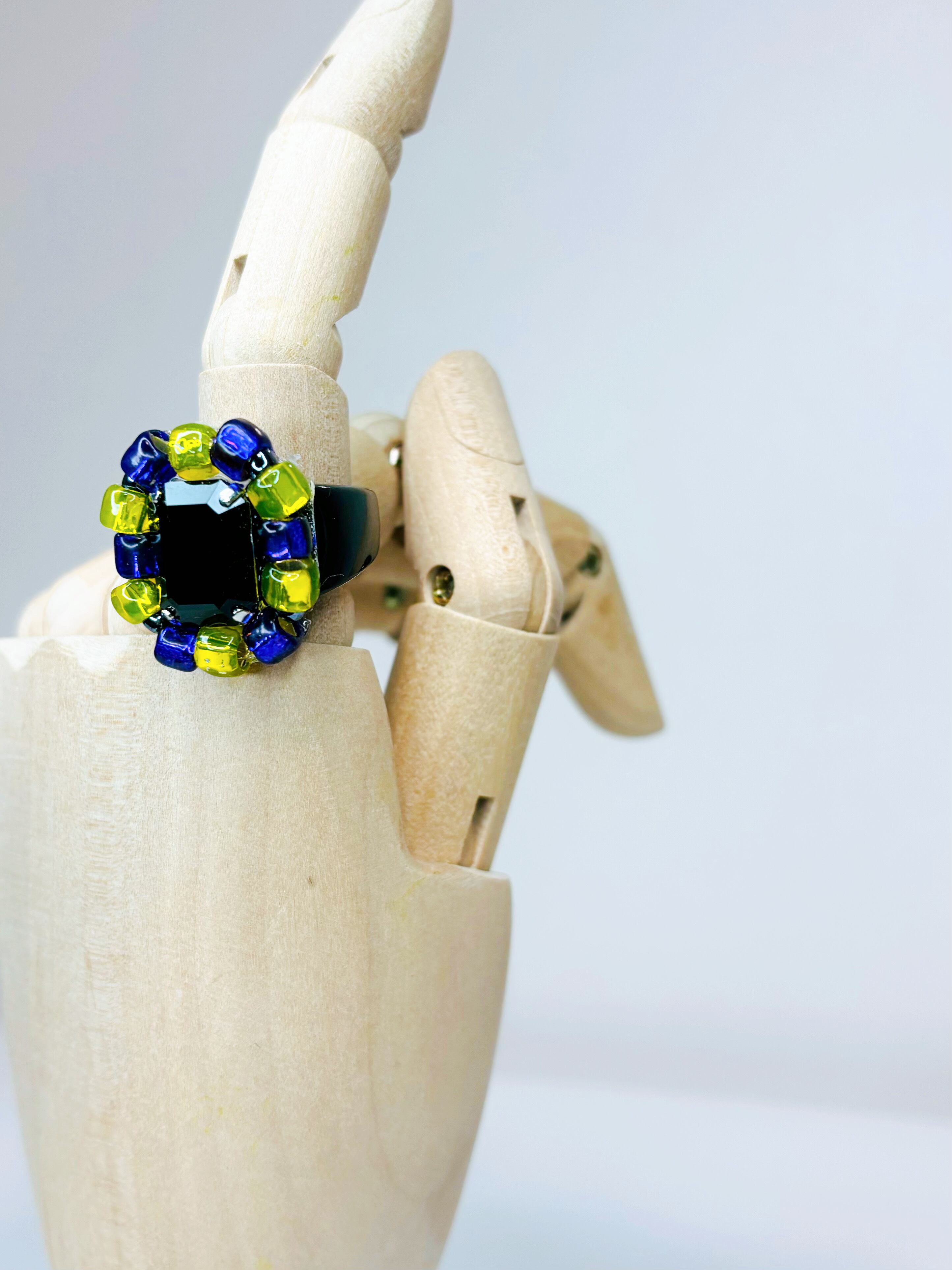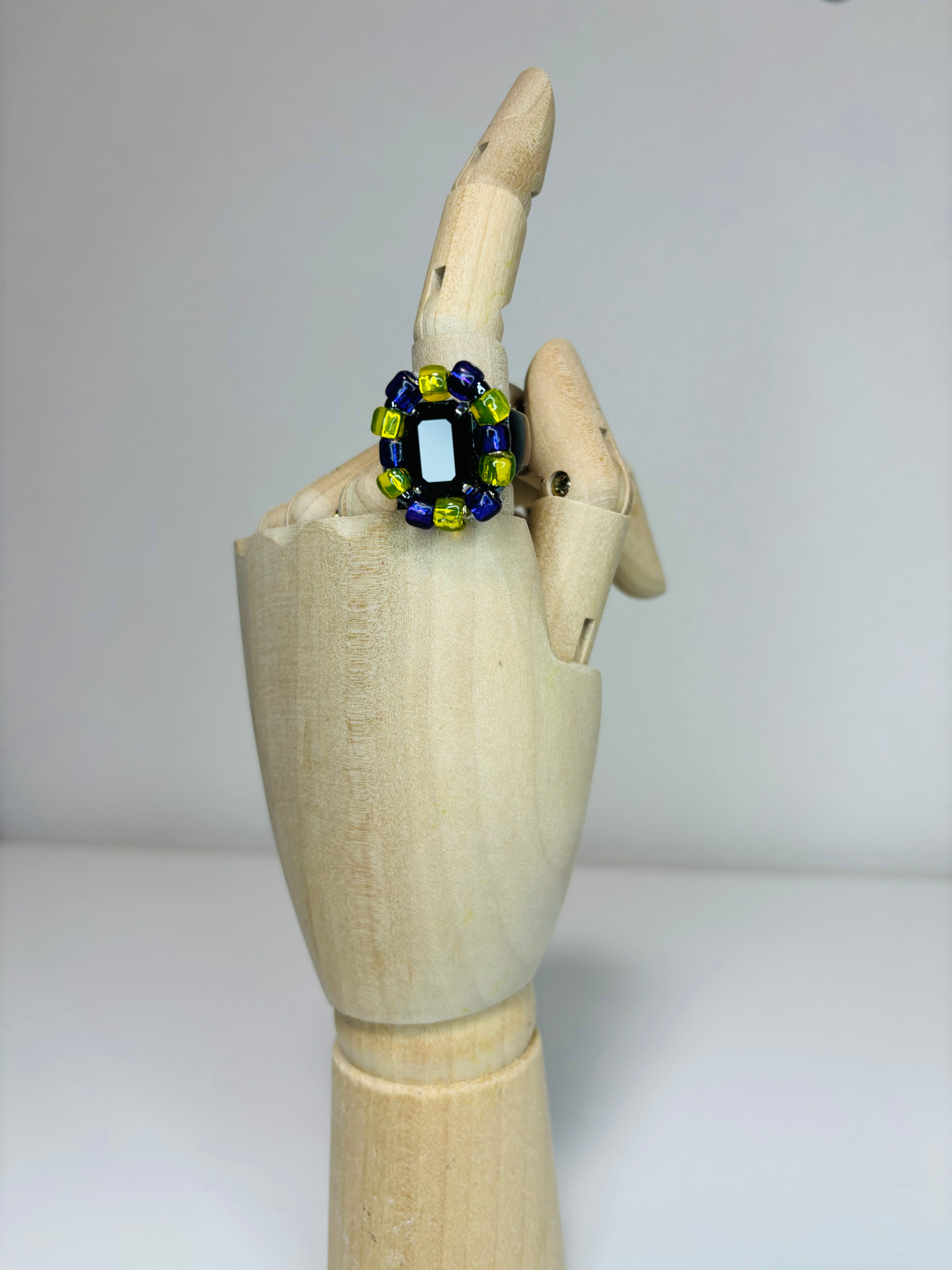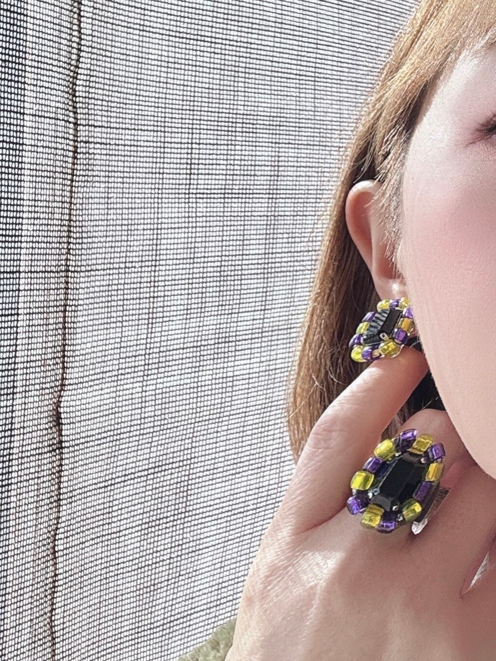 長方形のクリスタルと、その周囲にビーズを散りばめたクリスタルリングです。
