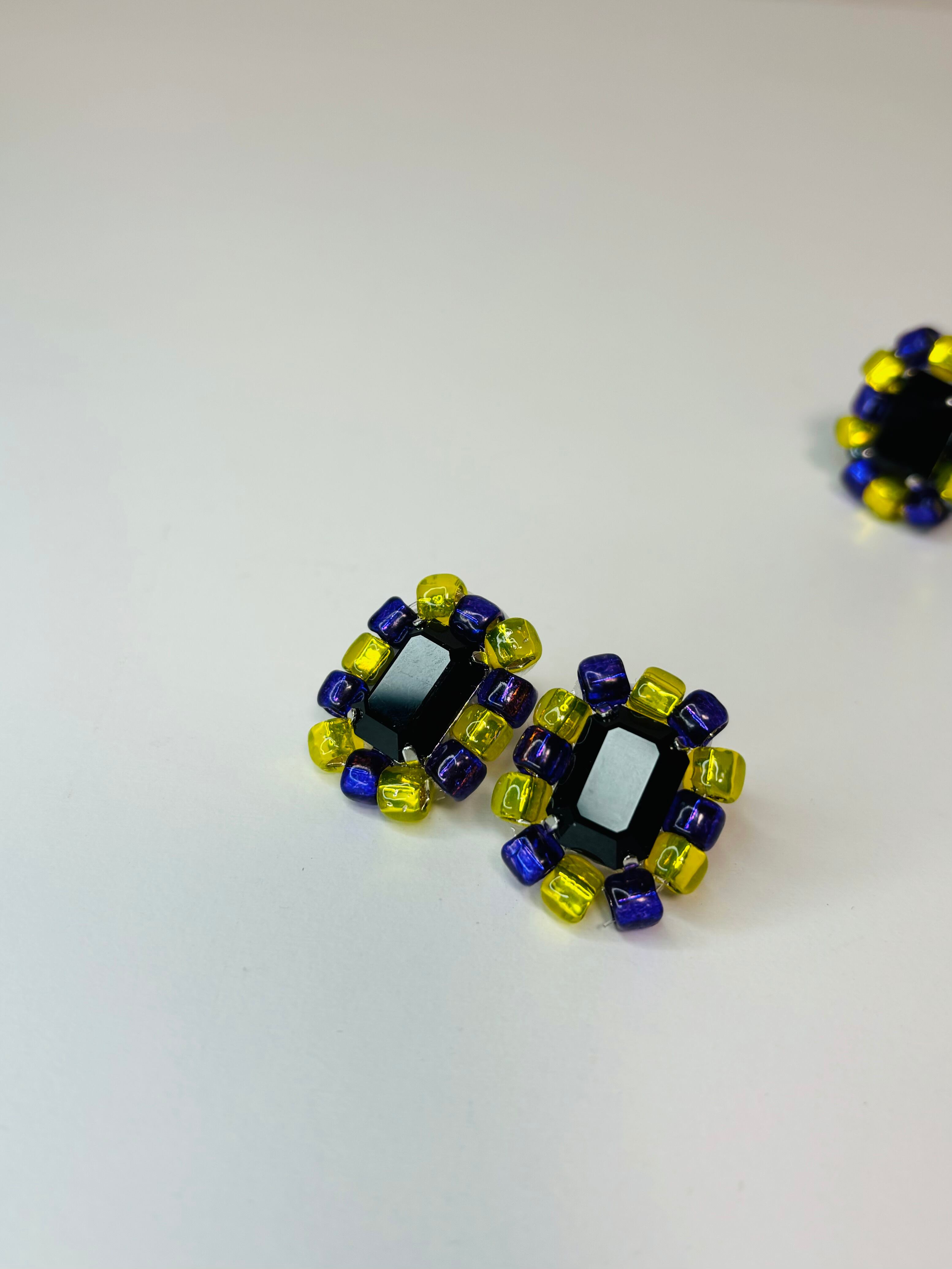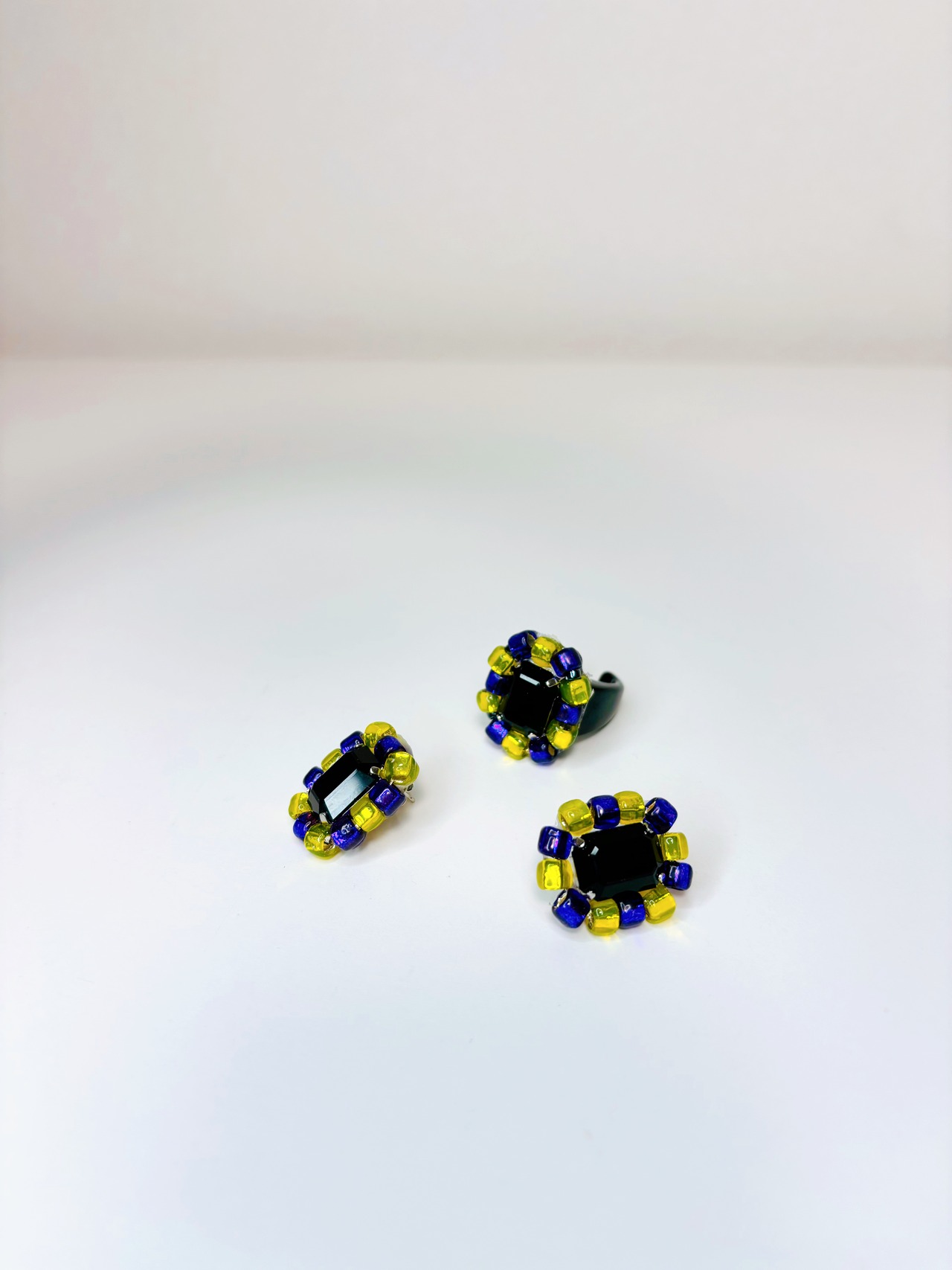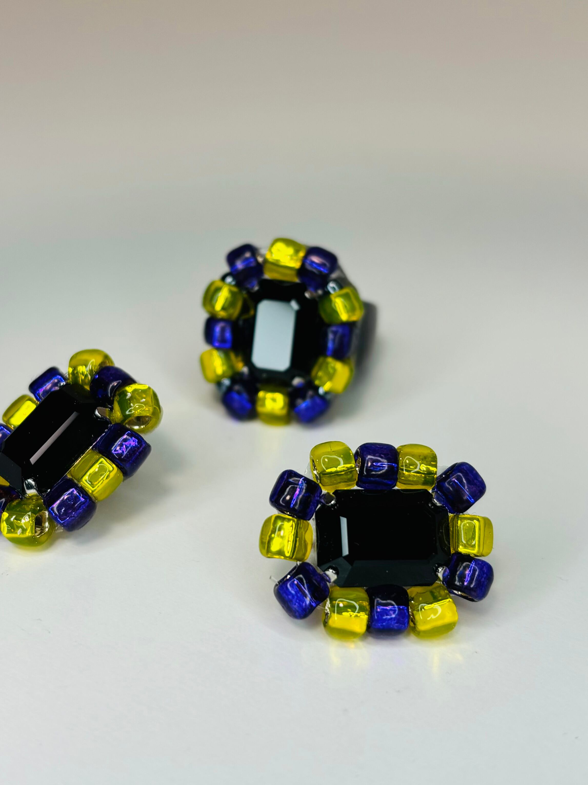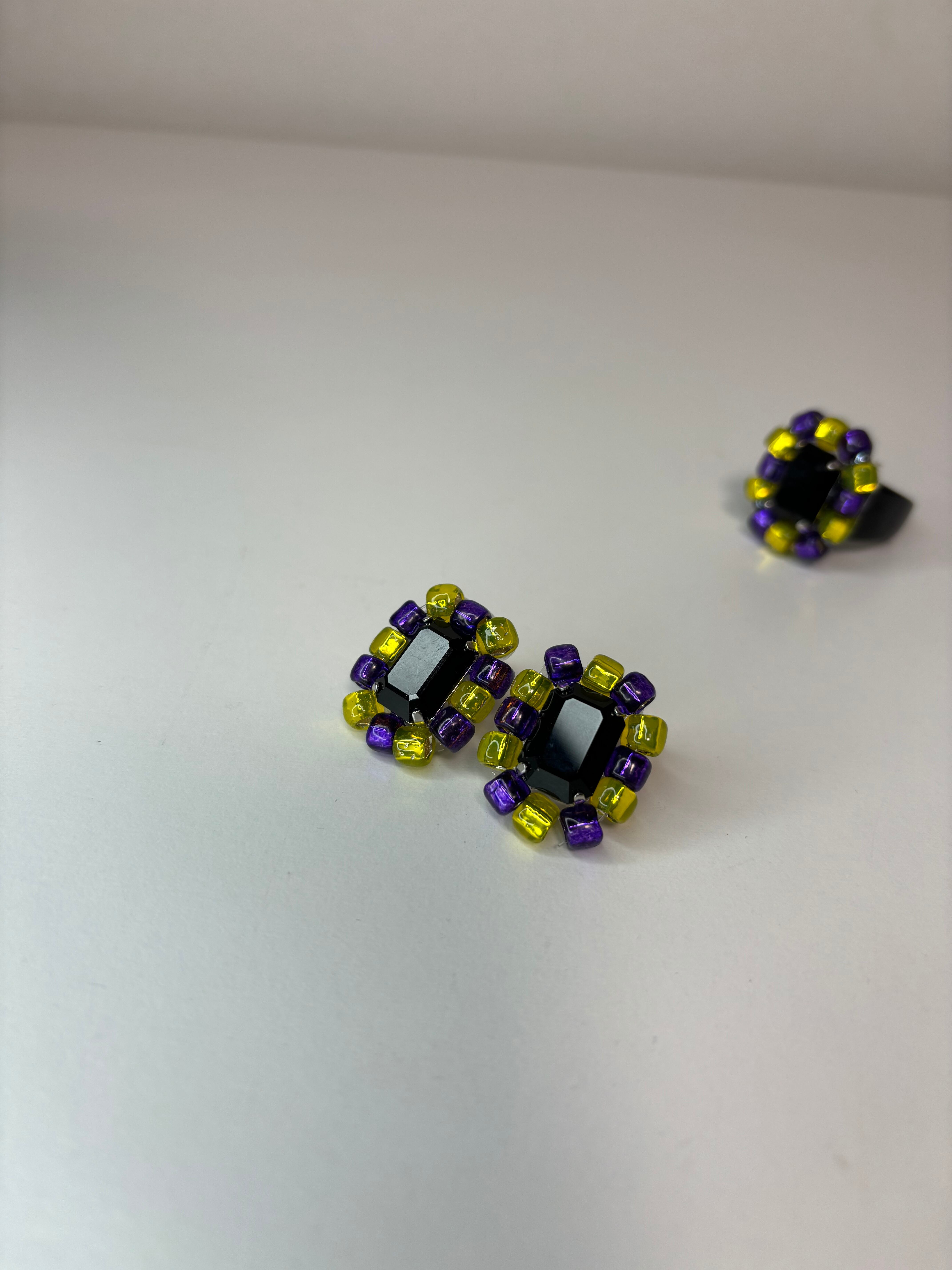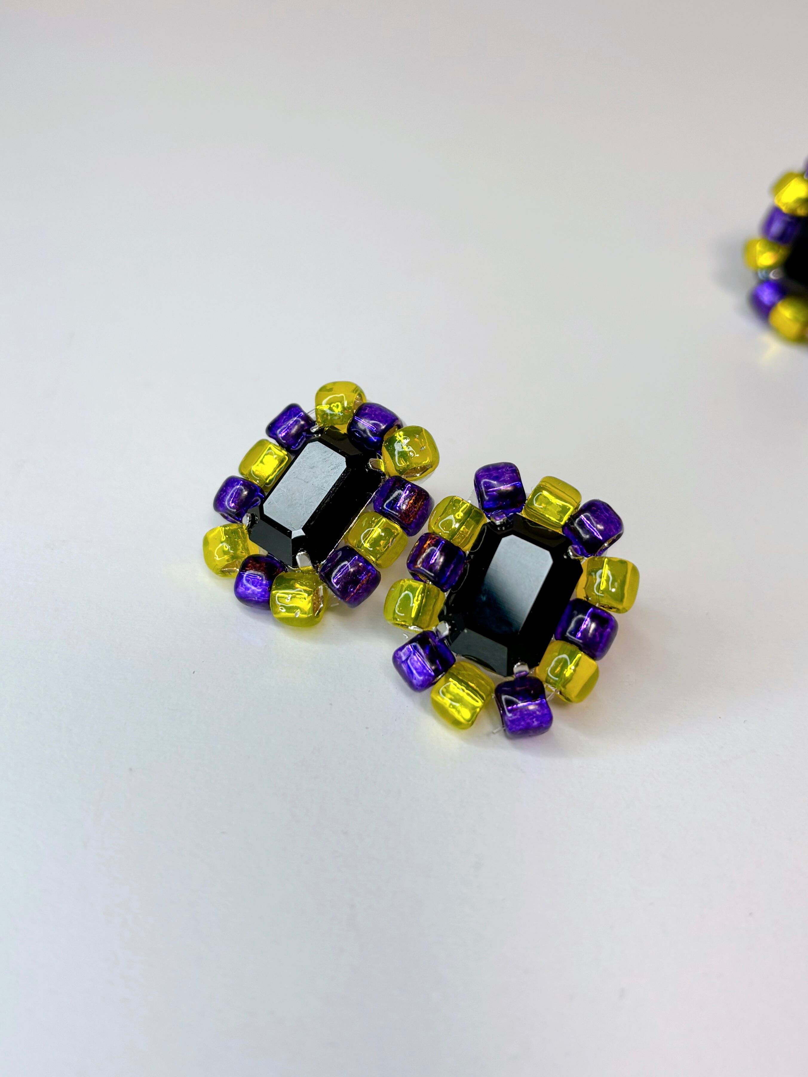 ブラッククリスタルの周囲に、発色の鮮やかなパープルとイエローのビーズで華やかに仕上げました。