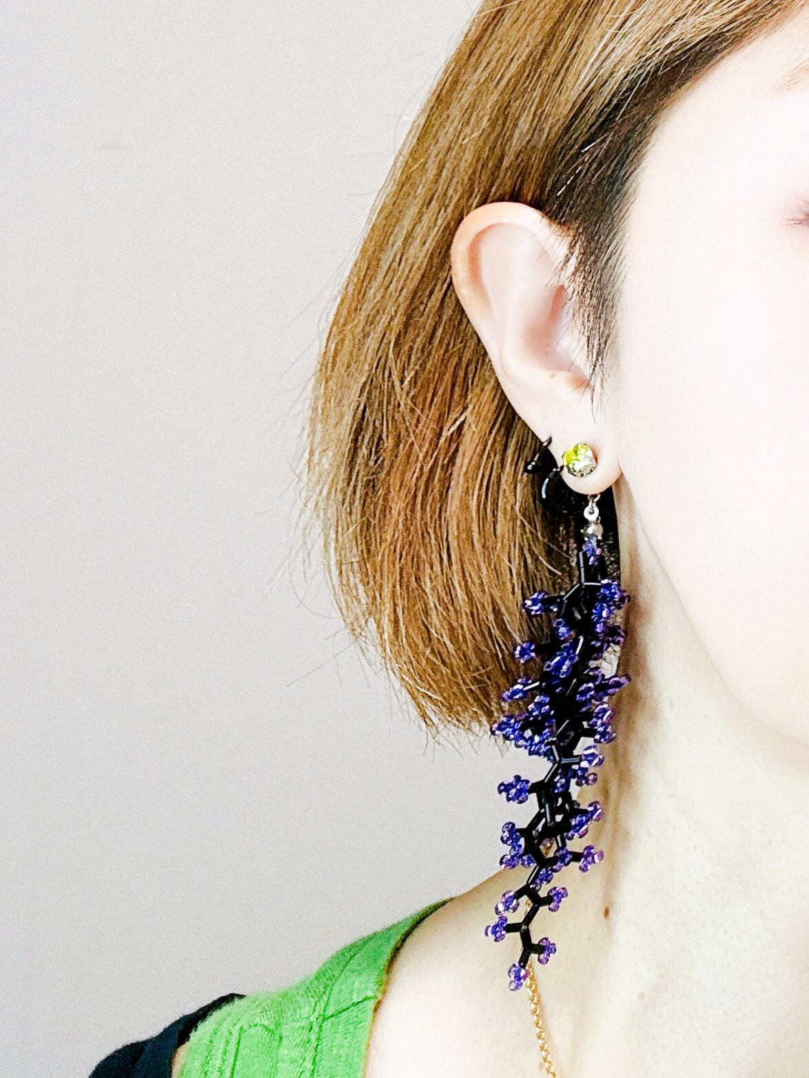 ビーズ部はじゃらじゃらと繋ぎ合わせ、ゴージャスでキュートなピアスに仕上がりました。