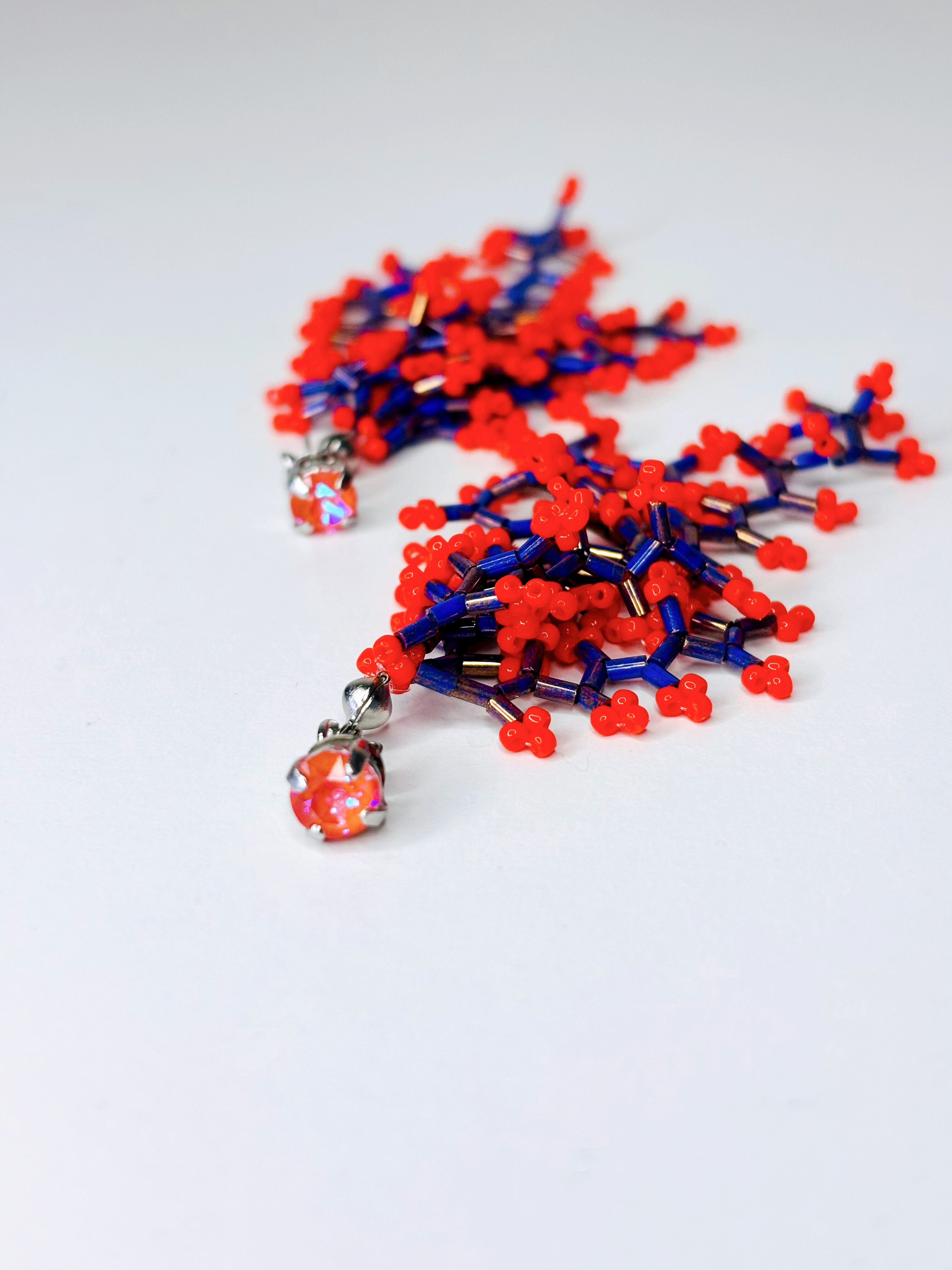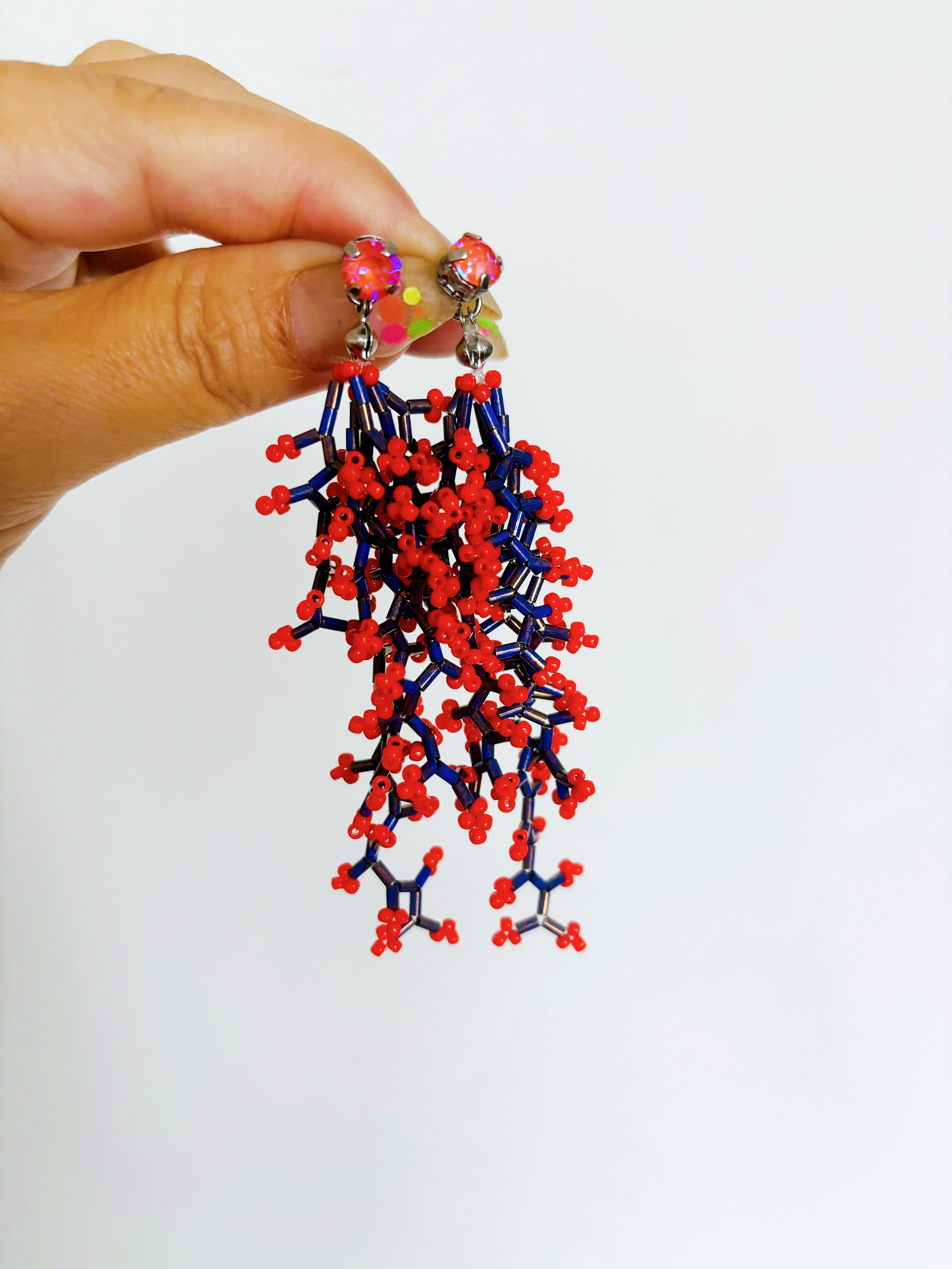 ビーズ部はじゃらじゃらと繋ぎ合わせ、ゴージャスでキュートなピアスに仕上がりました。