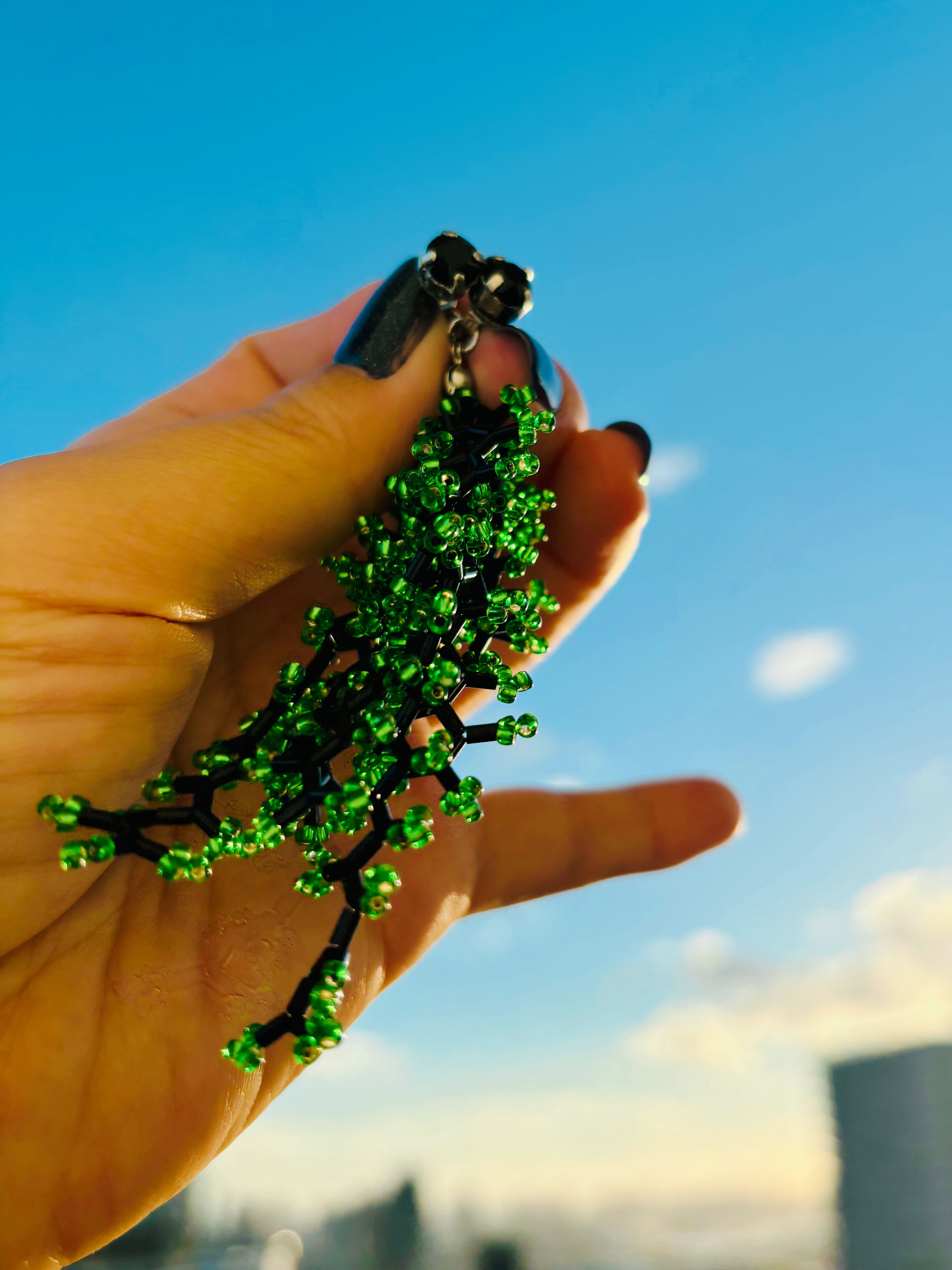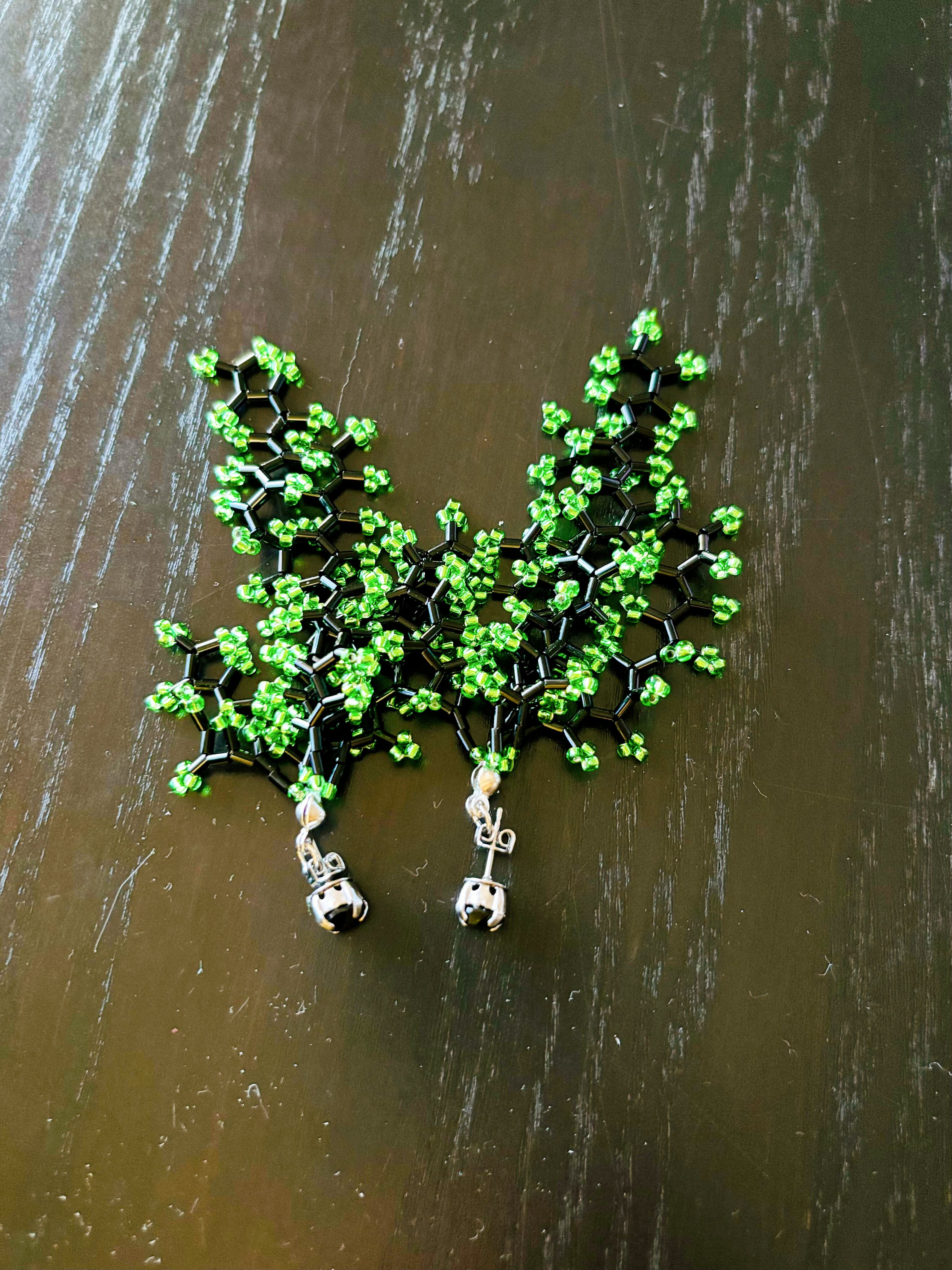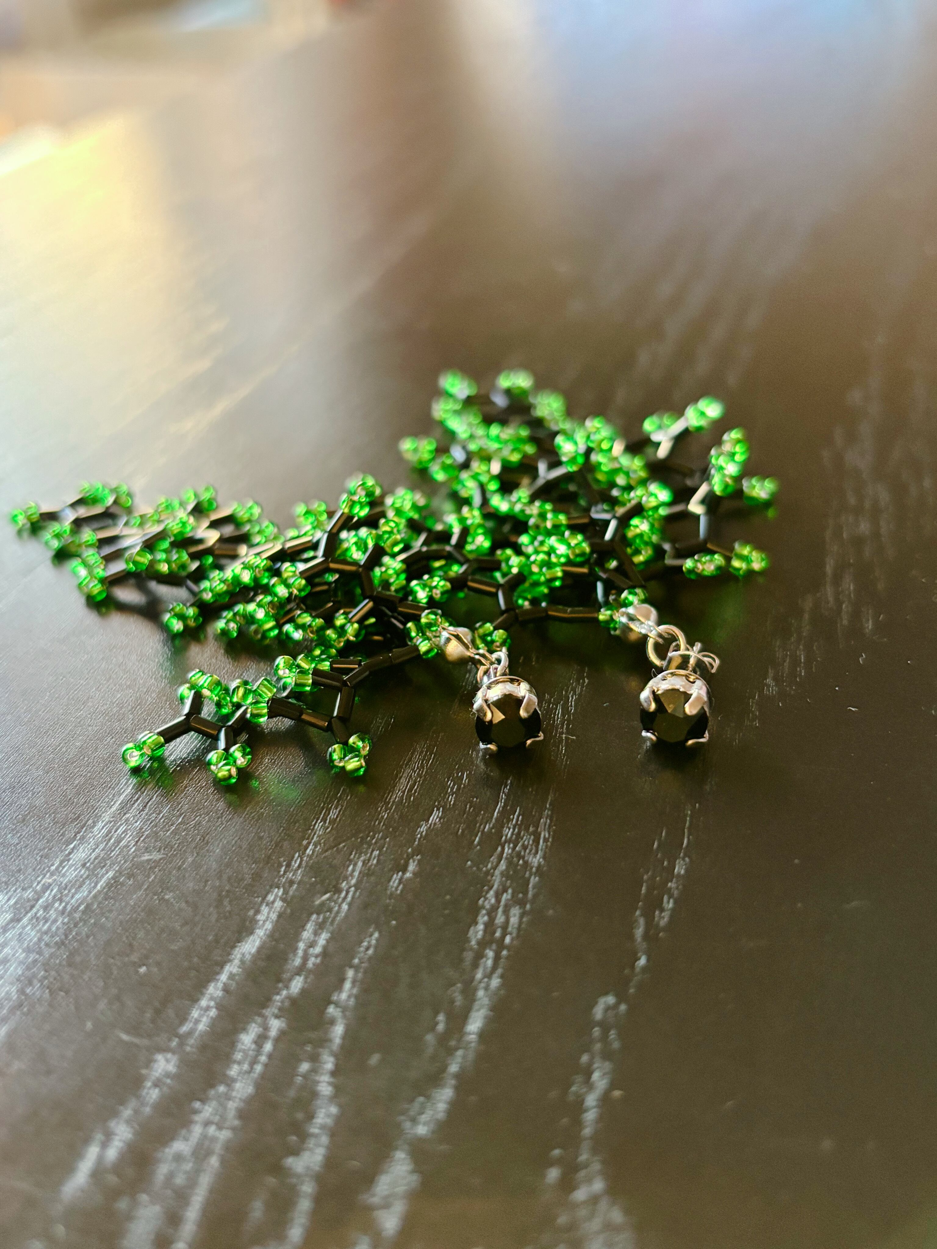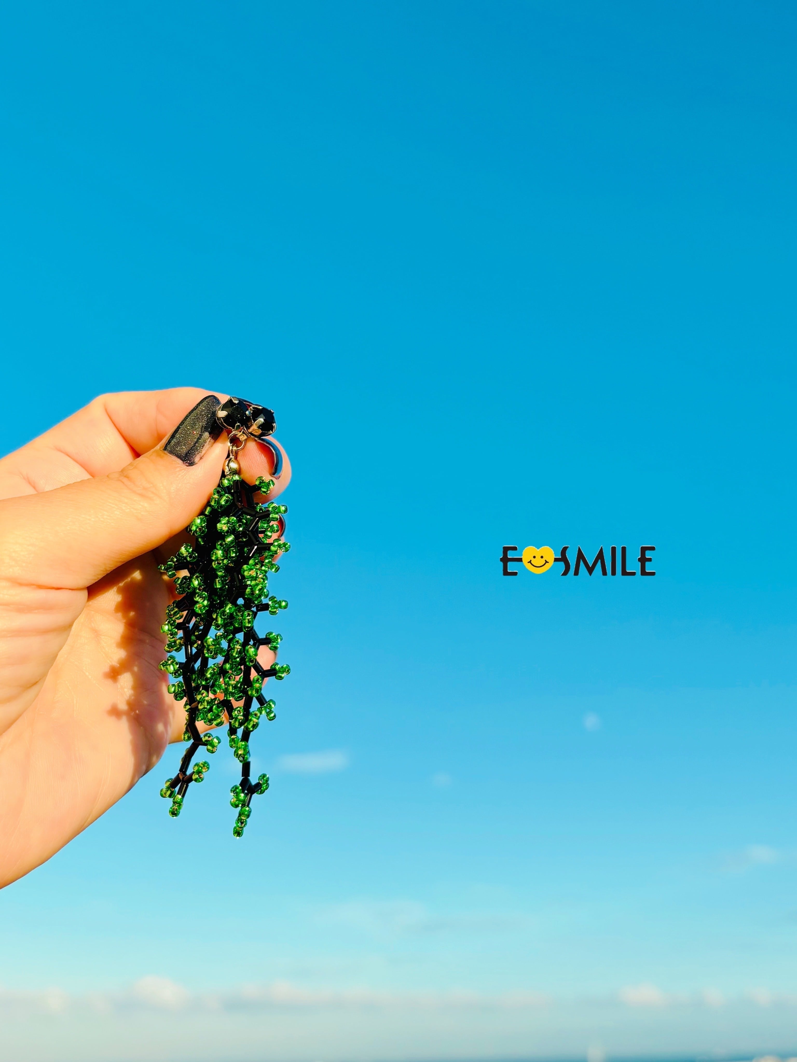 クリスタルとビーズのじゃらじゃらピアス(BLACK×GREEN)