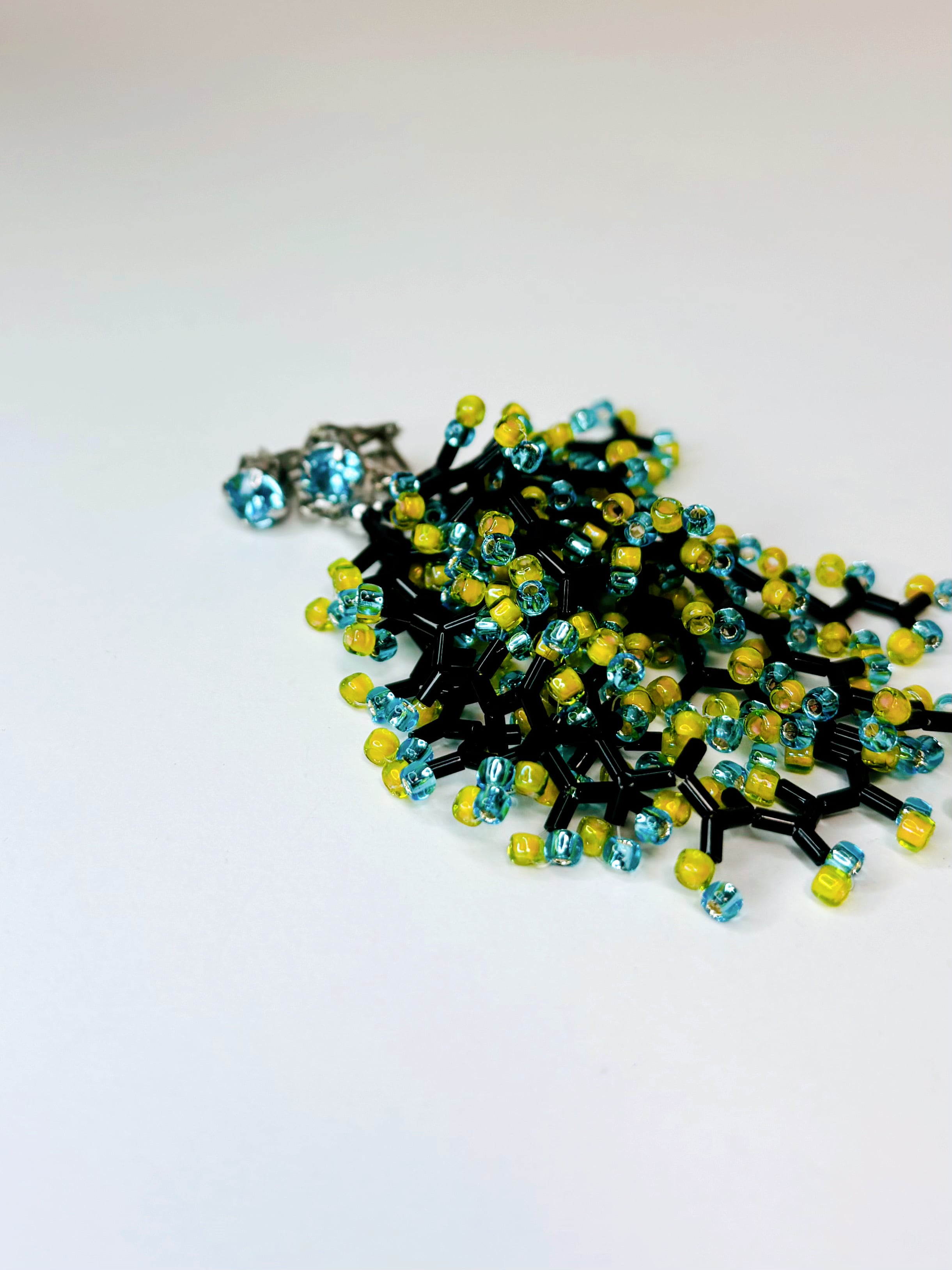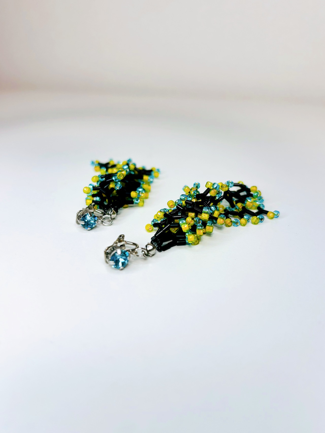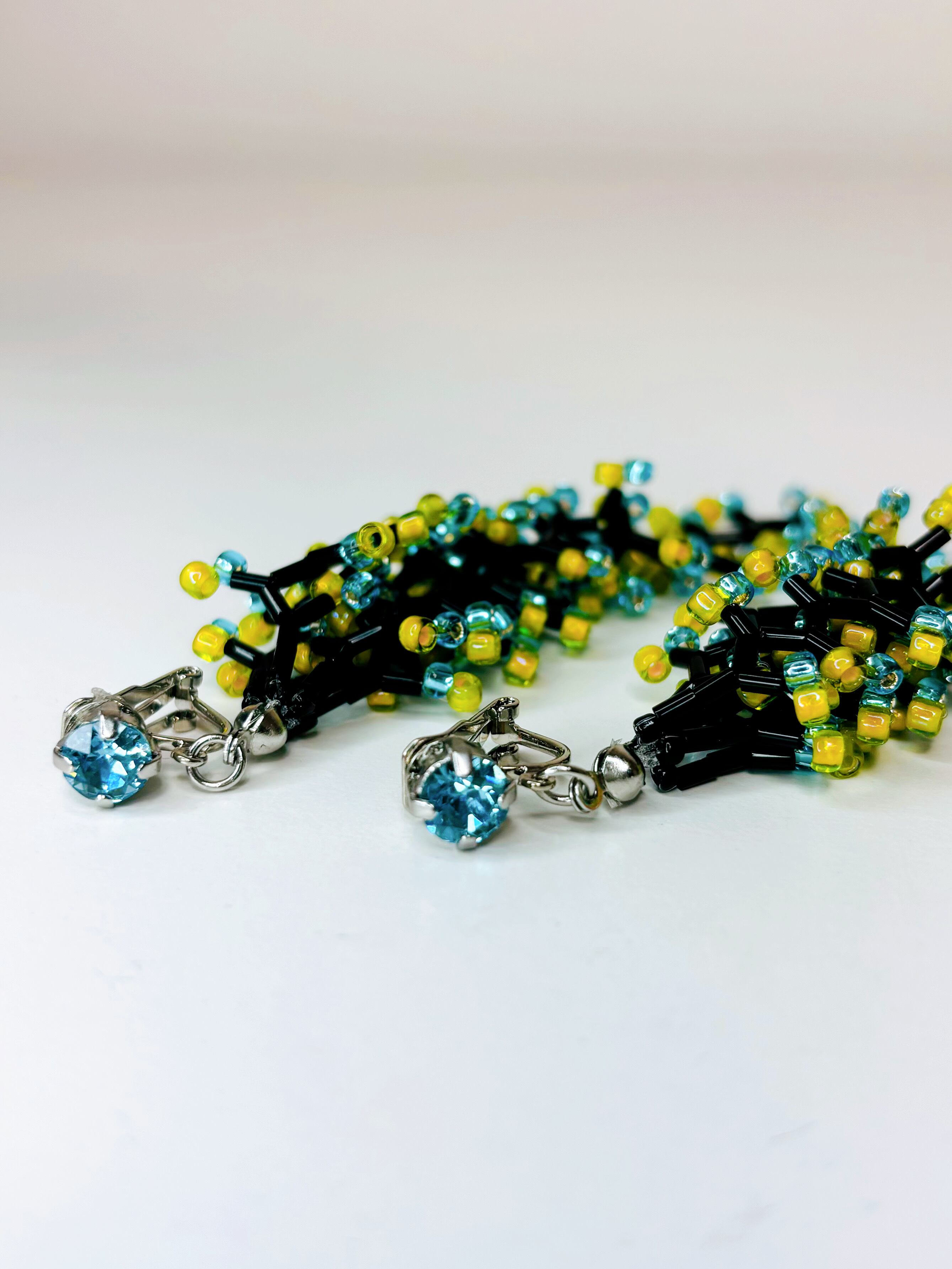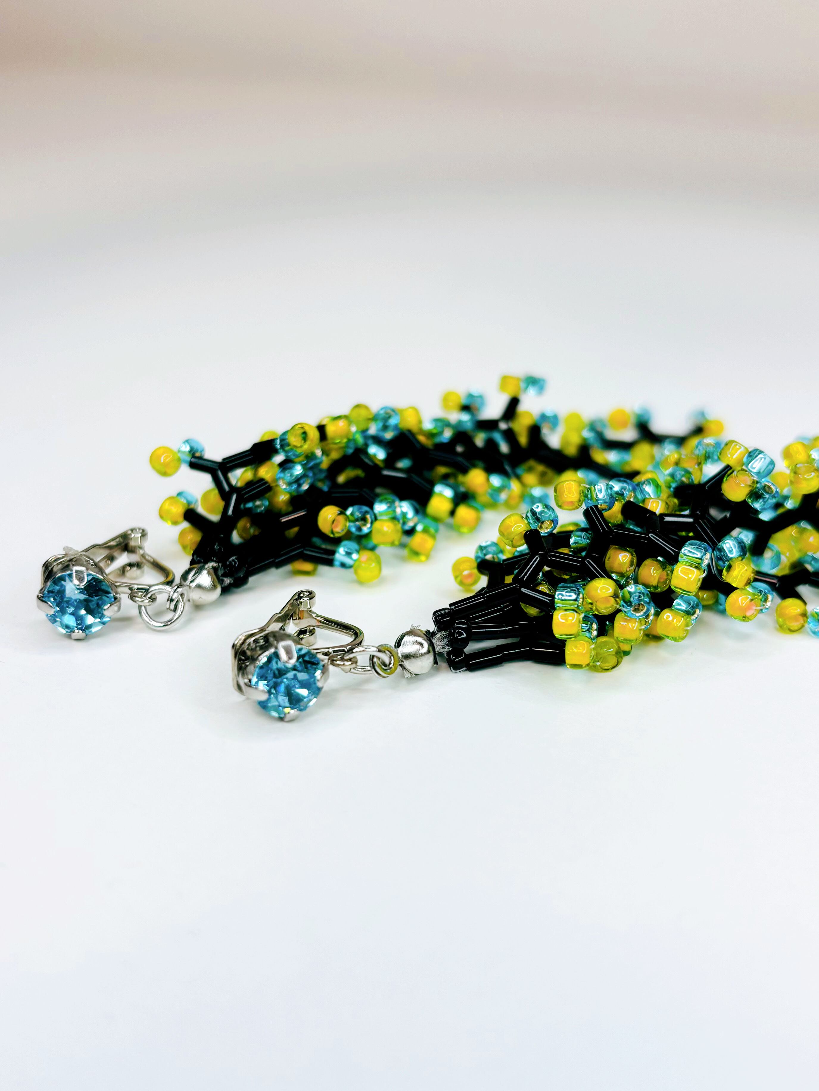 クリスタルとビーズのじゃらじゃらイヤリング(YELLOW×BLUE)