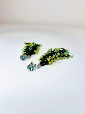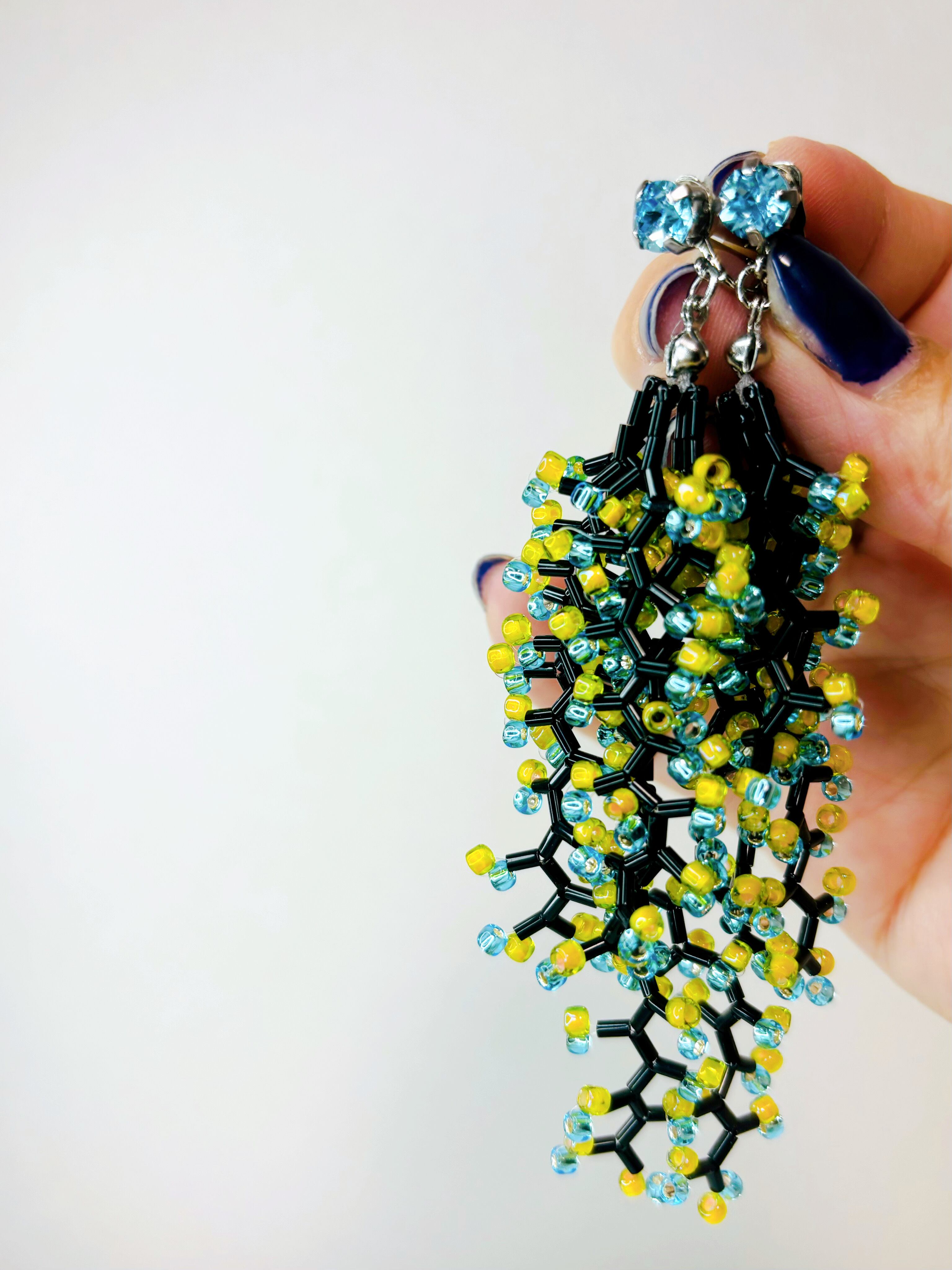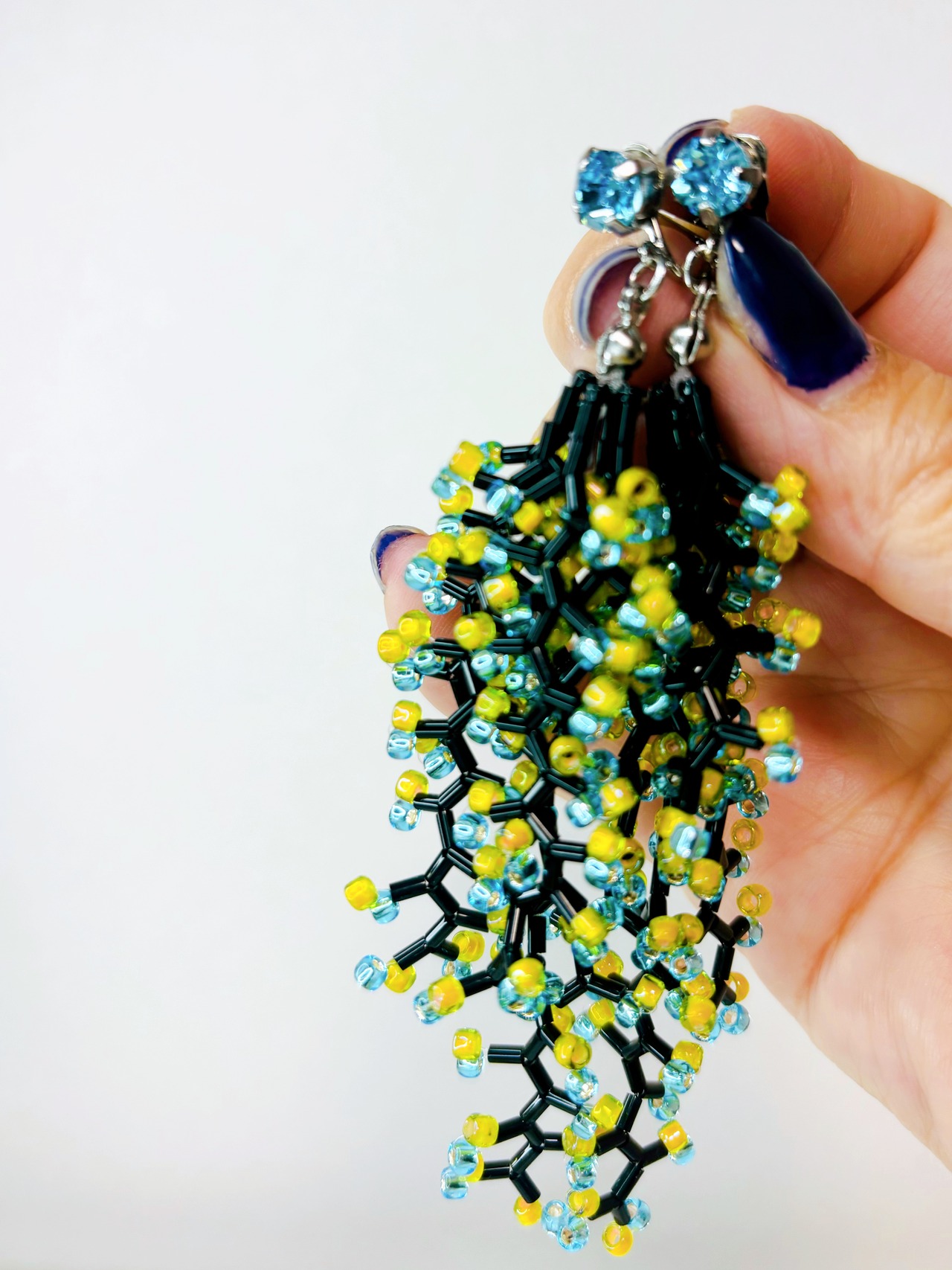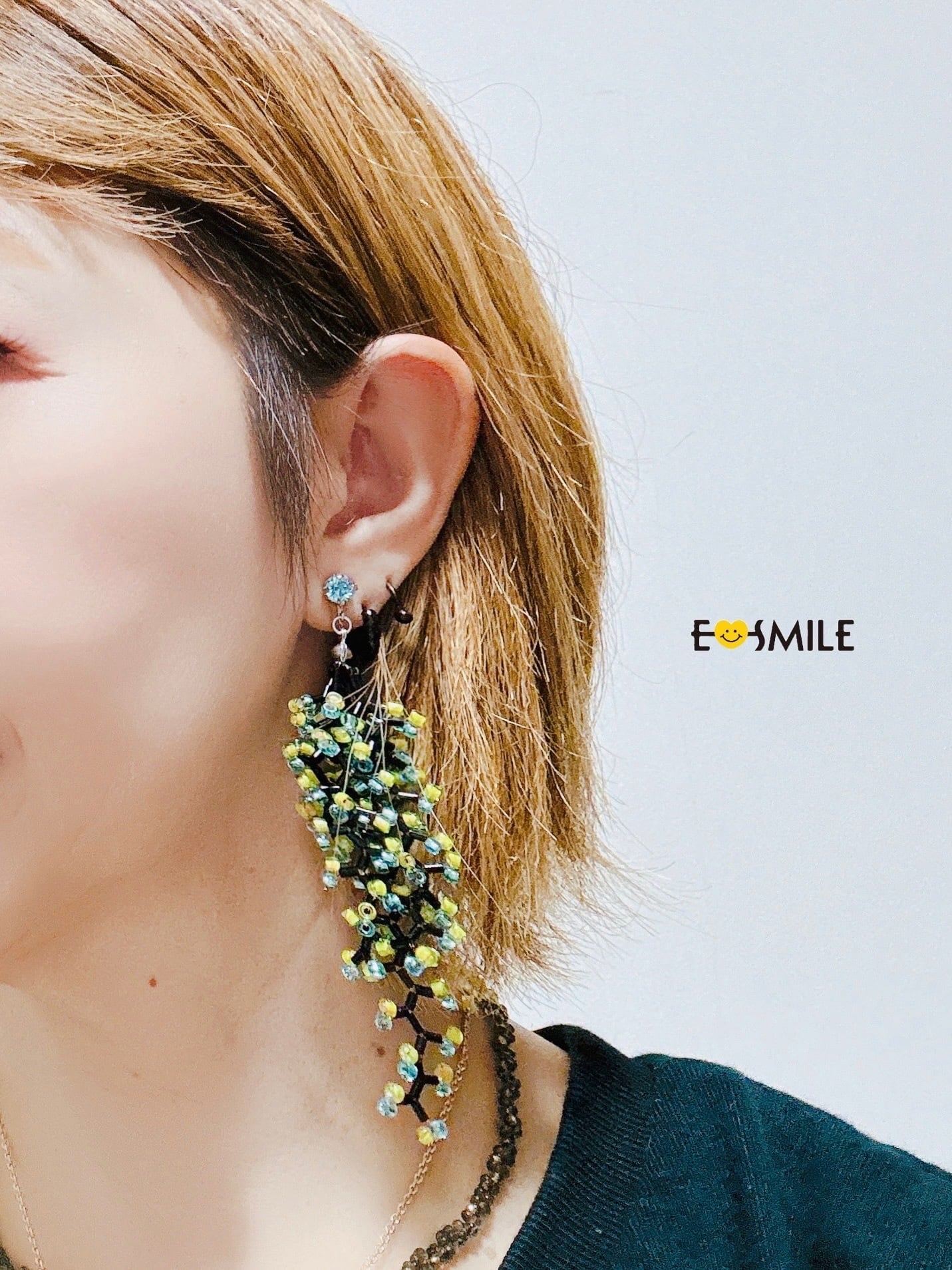 ビーズ部は、イエローとブルーの組み合わせで繋ぎ合わせ、ゴージャスでキュートなピアスに仕上がりました。